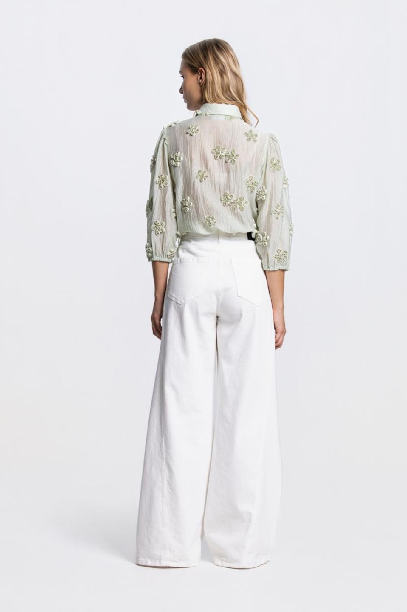 De Jansen Amsterdam Roos Blouse 3/4 Sleeve in Light Green is een romantische top met een unieke 3D-bloemenstructuur. Dit lichtgroene model heeft een klassieke kraag, een volledige knoopsluiting en elegante driekwart mouwen met een licht pofeffect. De blouse is vervaardigd uit een luchtige stof met een subtiele textuur, wat zorgt voor een verfijnde en vrouwelijke uitstraling die zowel casual als feestelijk gedragen kan worden.