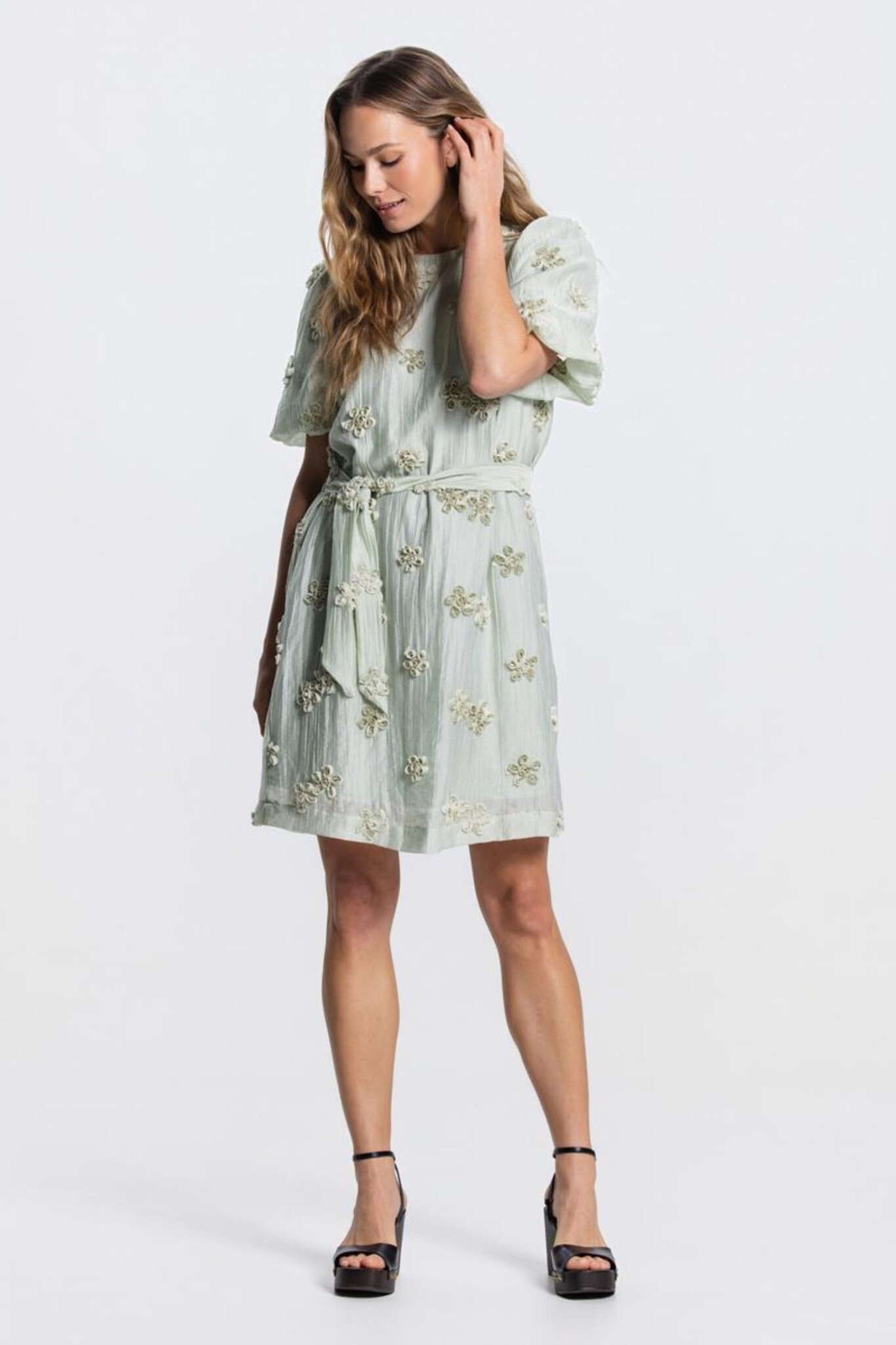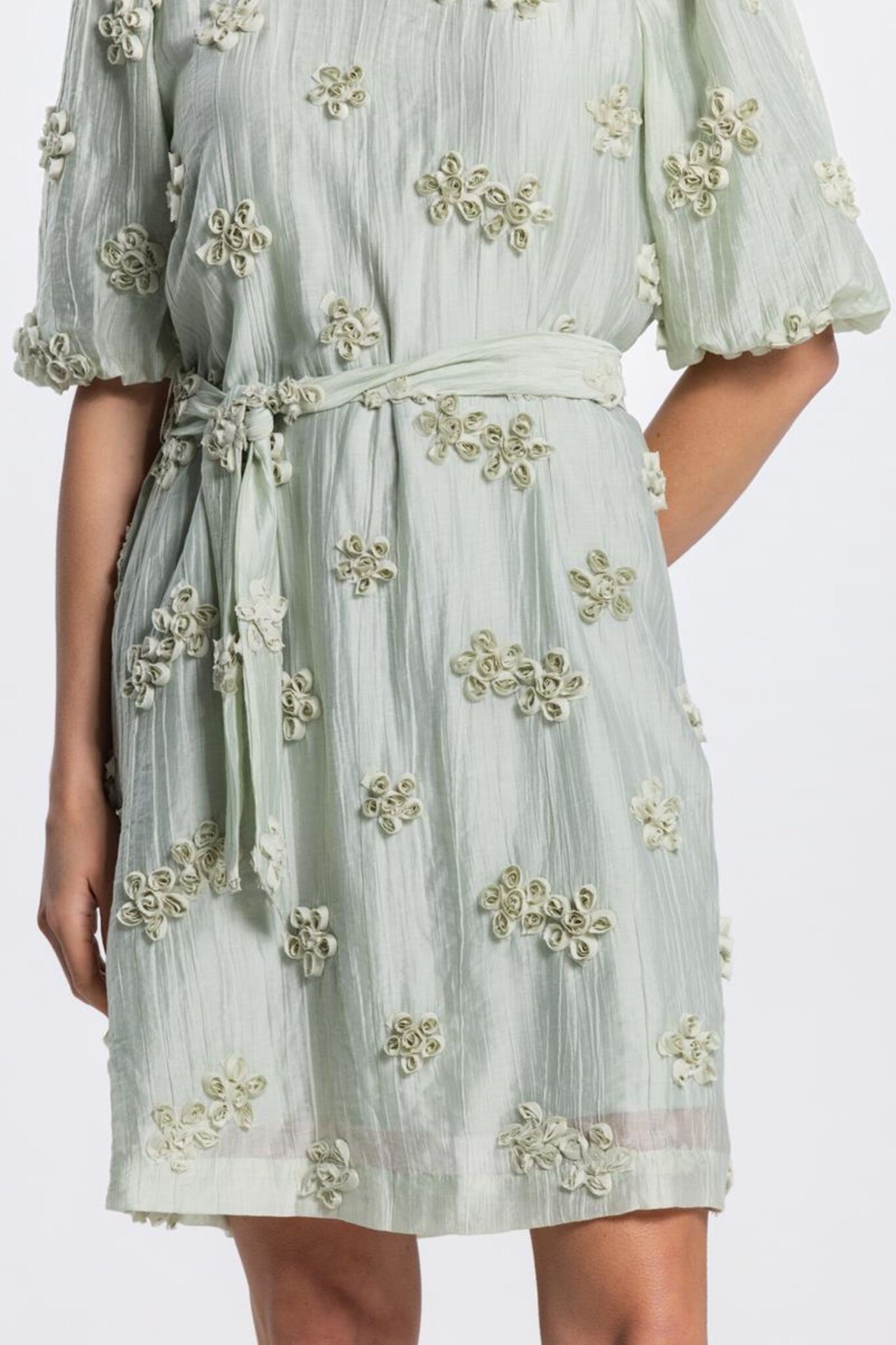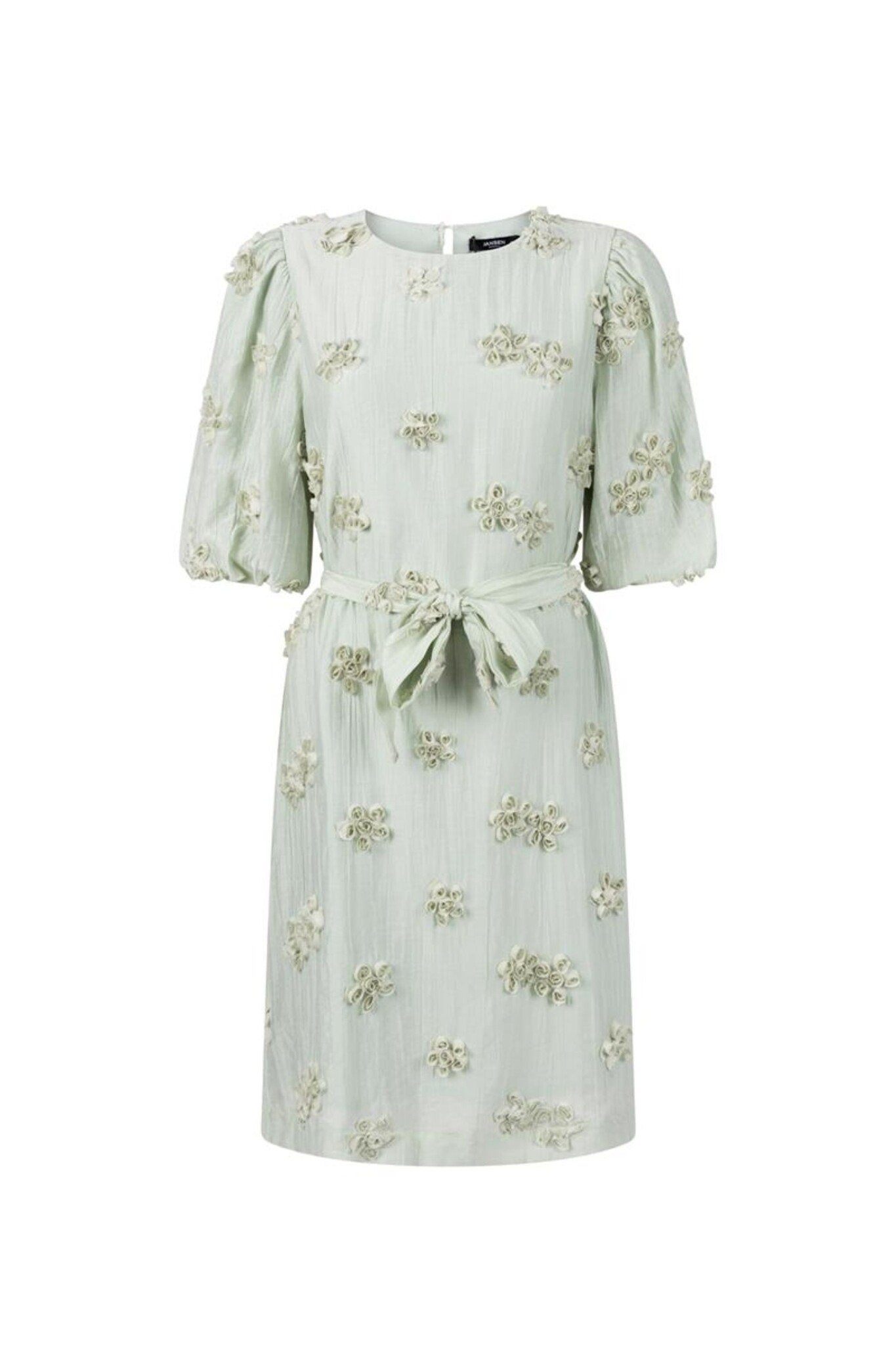 De Jansen Amsterdam Roxy Jurk in Light Green is een romantische, knielange jurk versierd met unieke 3D-bloemenapplicaties over het gehele kledingstuk. Dit lichtgroene model heeft een elegante ronde hals, korte pofmouwen met elastische boorden en een bijpassend strikceintuur om de taille vrouwelijk te accentueren. De jurk is vervaardigd uit een luchtige stof met een subtiele textuur, wat zorgt voor een verfijnde uitstraling die perfect is voor zowel een zomerse dag als een feestelijke gelegenheid.