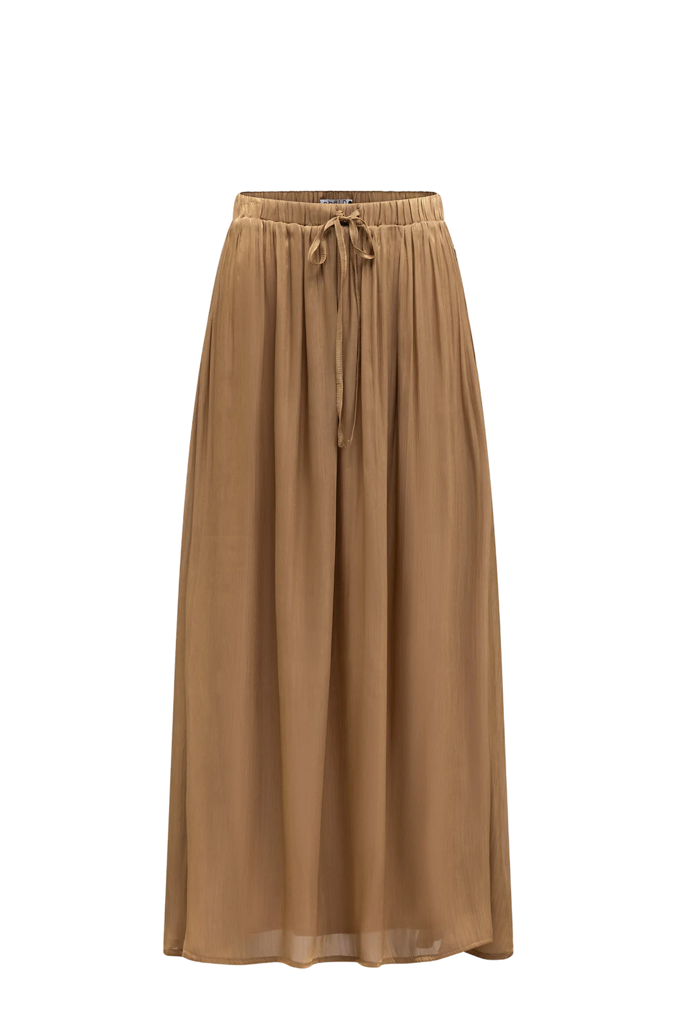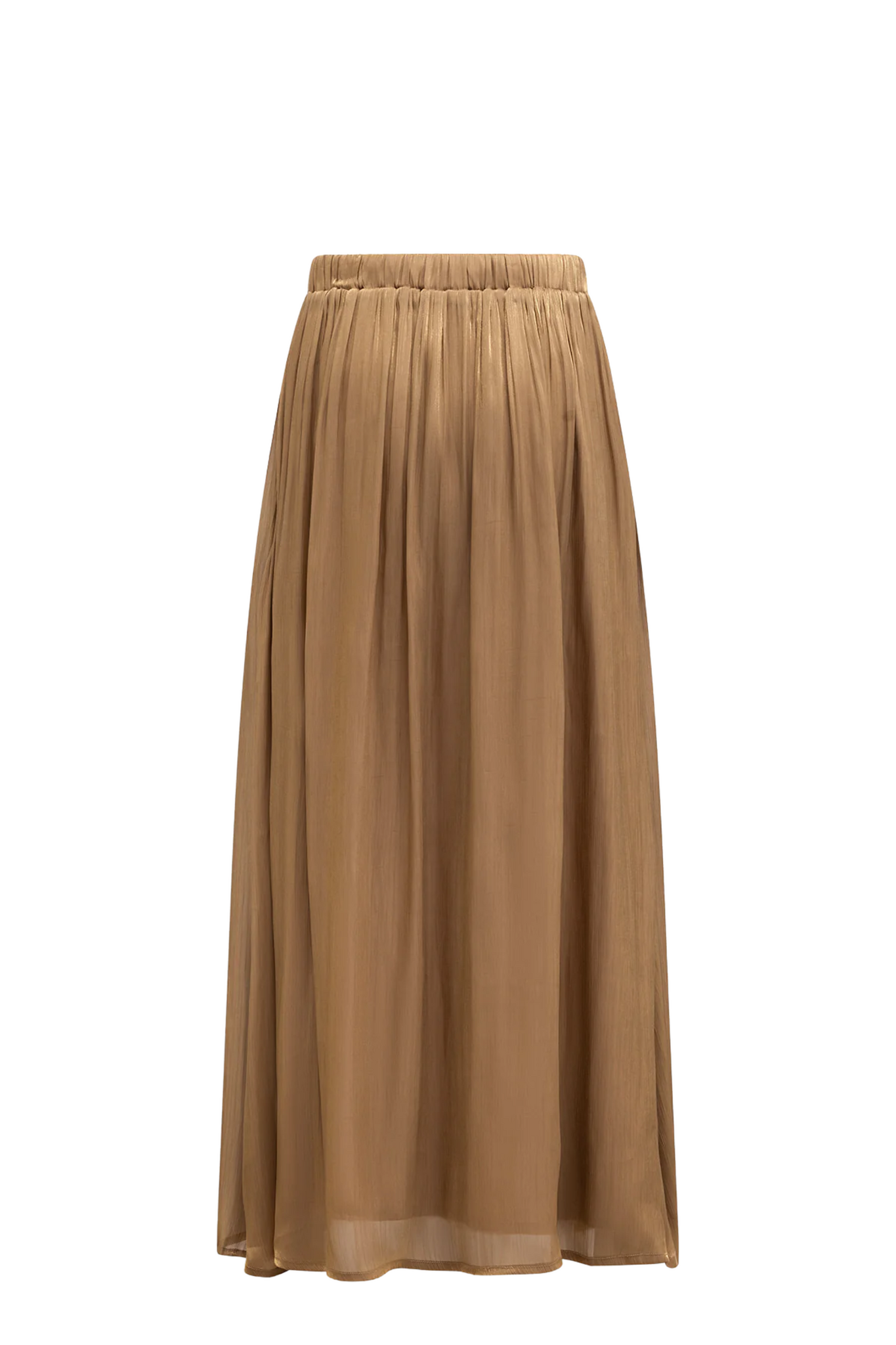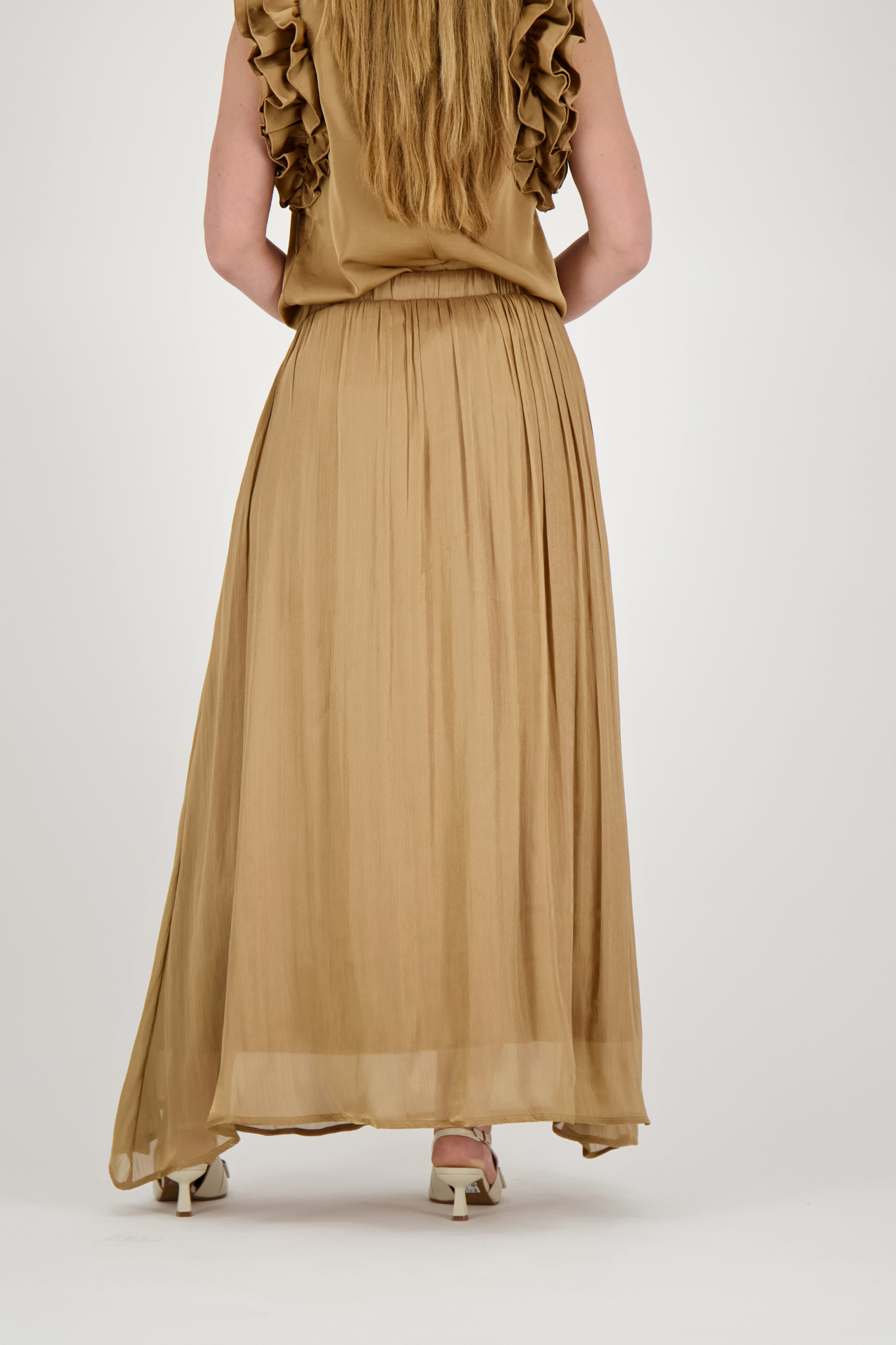 De Emi Rok van Label Dot in Goud is een stijlvolle maxi-rok met een A-lijn pasvorm en een asymmetrische onderkant voor een speels effect. De rok heeft een elastische taille met bijpassend strikceintuur en is uitgevoerd in een subtiel glanzende, lichte transparante stof met een onderrok voor extra draagcomfort en bedekking. Perfect te combineren met een blouse of top voor een elegante en vrouwelijke look.