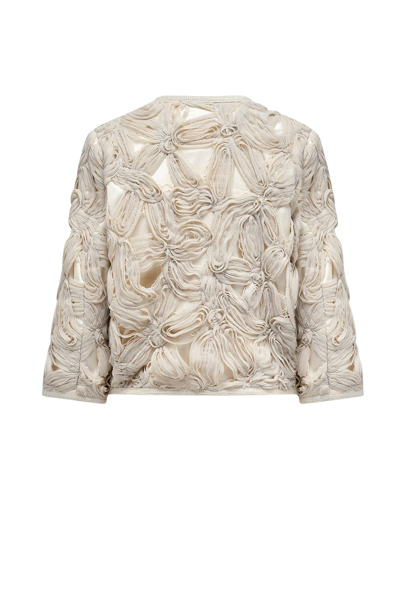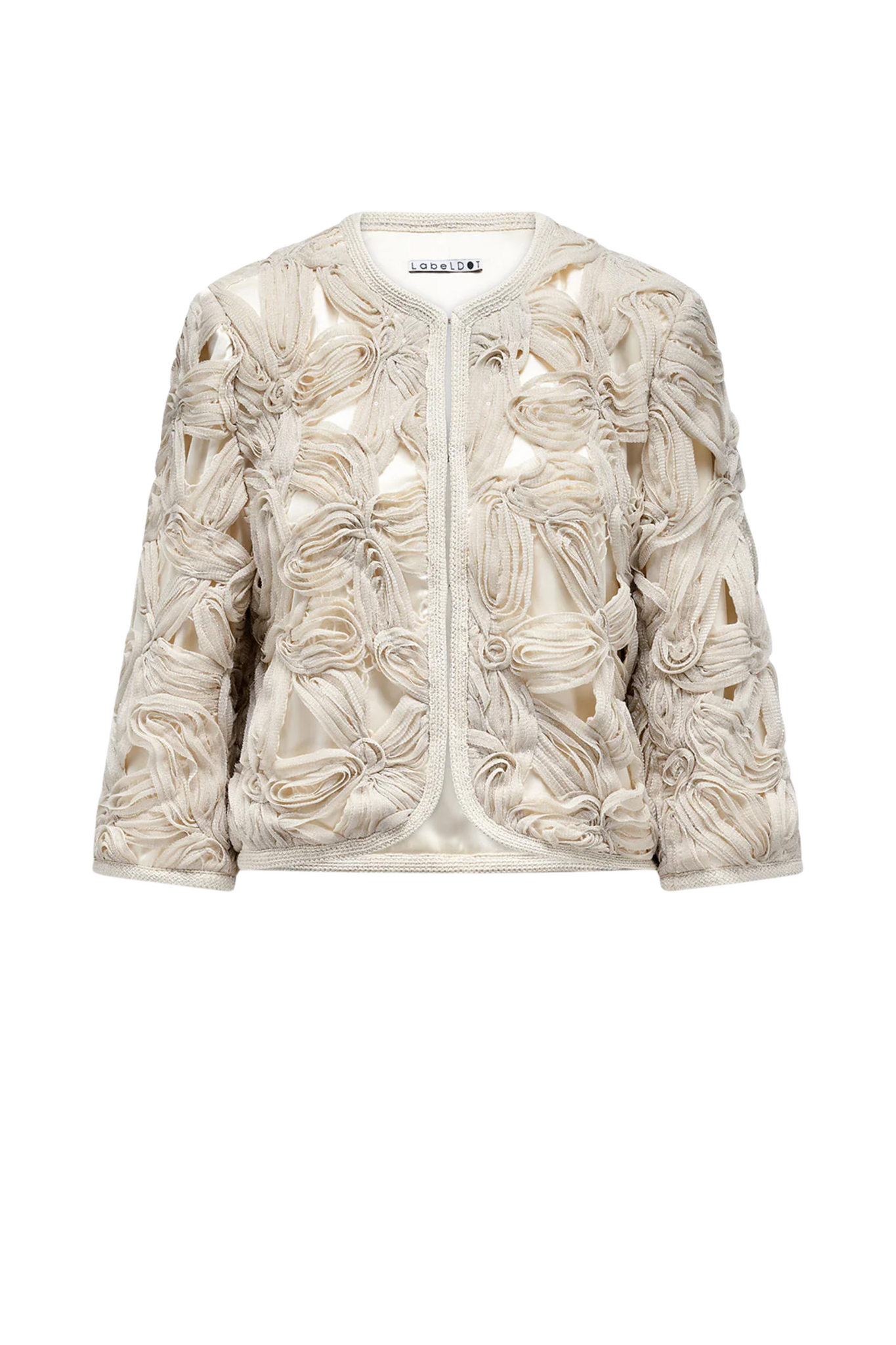 Het Lisa Jacket van Label Dot in Kit is een kort jasje met een ronde hals en rechte 3/4 mouwen. Het model sluit met een haak- en oogsluiting en is afgewerkt met een opvallende 3D bloemenprint, wat zorgt voor een speels en verfijnd detail.