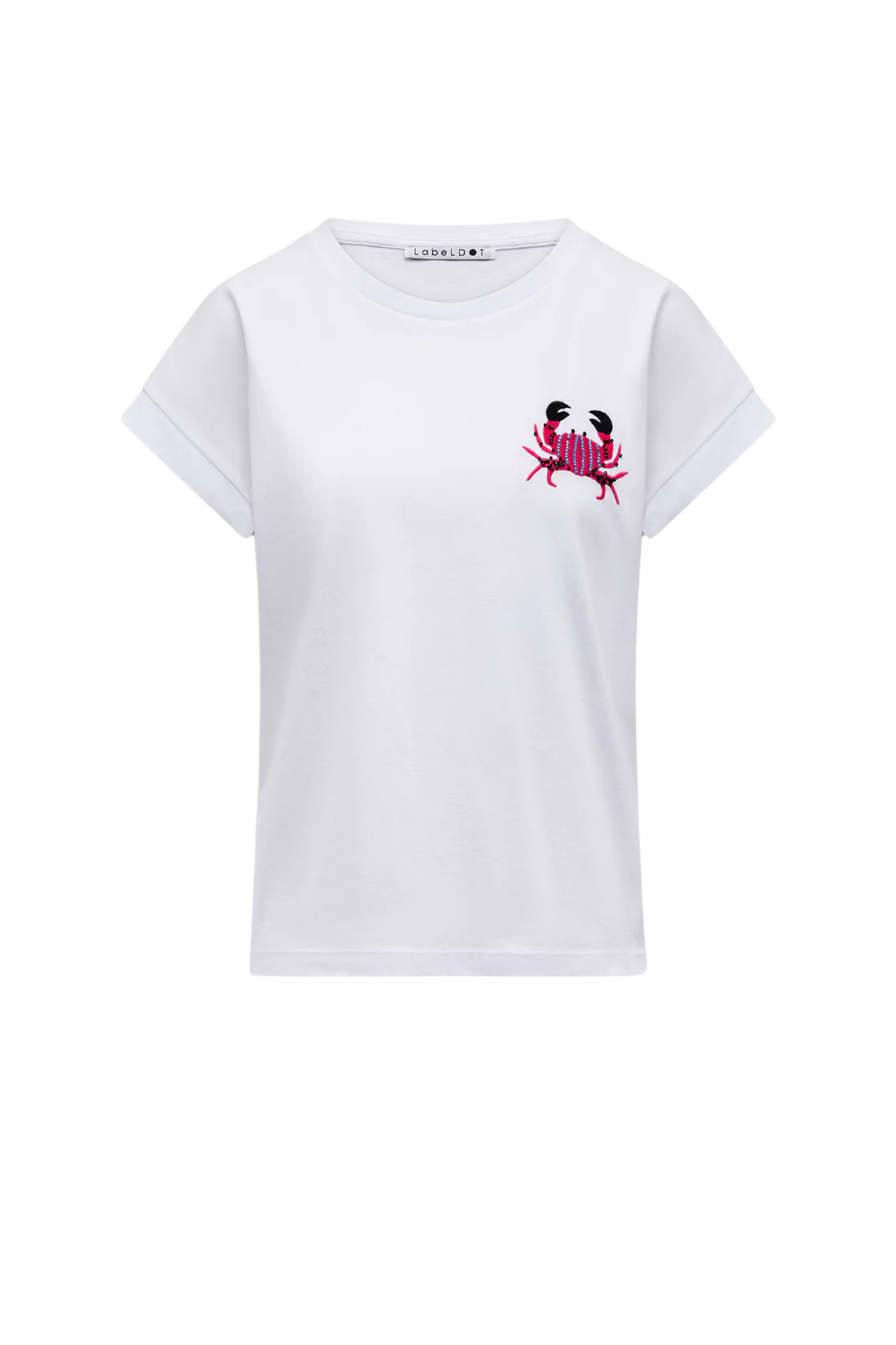 Het Label Dot Manon T-shirt in Wit is een fris en speels item met een maritieme touch. Dit shirt van 100% katoen heeft een klassieke ronde hals en korte mouwen, versierd met een opvallend geborduurde kreeft in felle roze en rode tinten op de borst. Dankzij de zachte katoenkwaliteit en de vrolijke applicatie is dit T-shirt de ideale basis voor een stijlvolle en nonchalante zomerlook.