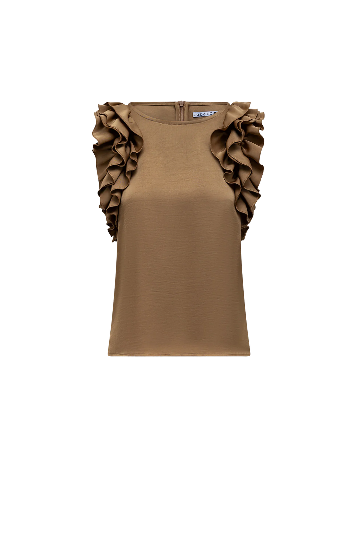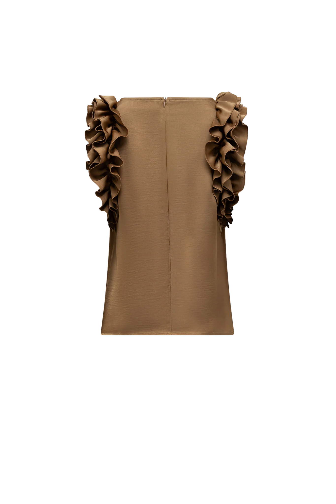 De Molly Top van Label Dot in Goud is een elegante, mouwloze top met een ronde hals en een verfijnde uitstraling. De top sluit met een blinde ritssluiting aan de achterkant en heeft speelse ruffle-details langs de mouwinzet die zorgen voor een vrouwelijke touch. De subtiele glans van de stof geeft de top een feestelijke uitstraling. Perfect te combineren met de bijpassende rok voor een complete en stijlvolle look.