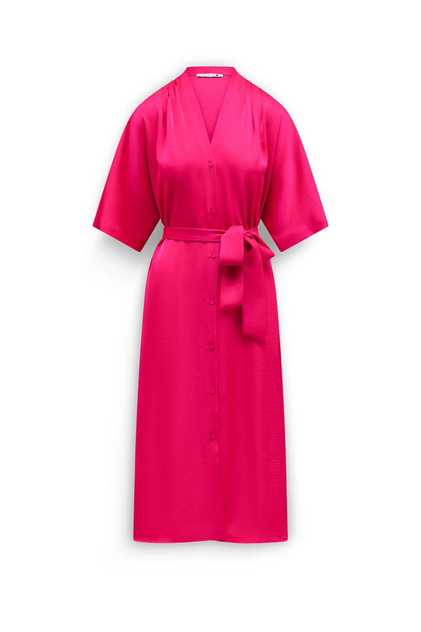 De Label Dot Simone Jurk in Fuchsia is een elegante doorknoopjurk met een luxe uitstraling. Deze jurk is vervaardigd uit 100% acetaat voor een zijdeachtige glans en beschikt over een vrouwelijke V-hals met een doorlopende knoopsluiting. Met de driekwart mouwen en het bijpassende ceintuur om de taille te accentueren, biedt dit model een stijlvol en verfijnd silhouet voor elke gelegenheid.