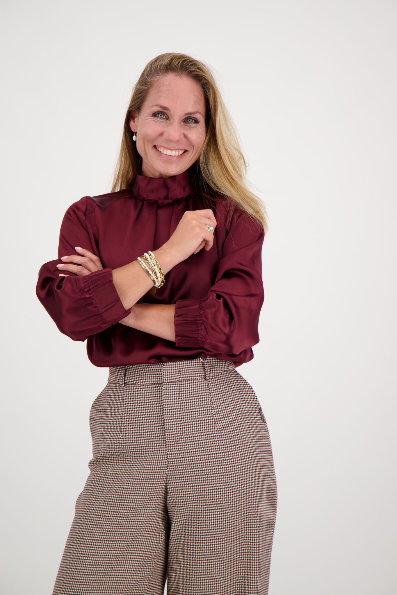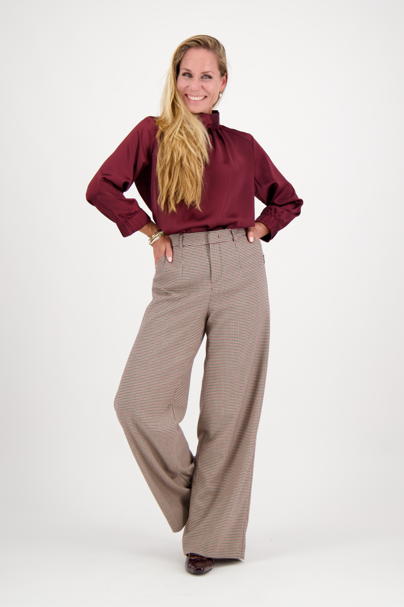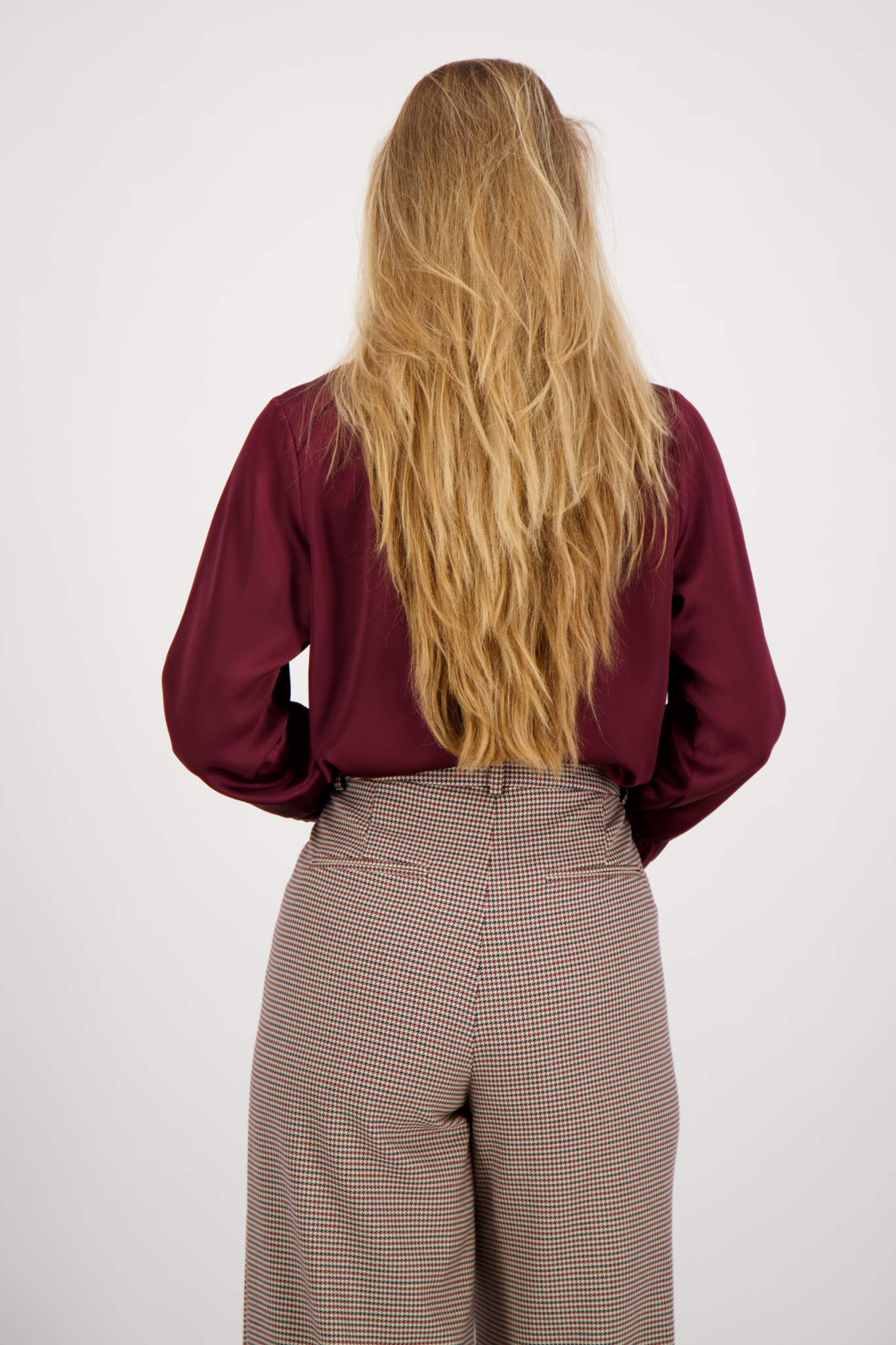 De Odille Blouse van LaLotti is een elegante blouse in de kleur burgundy met een satijnlook. Het model heeft een hoge opstaande hals met knoopsluiting aan de nek, 3/4 mouwen met elastische manchetten en lichte pofmouwen. Een veelzijdige blouse die zowel casual als gekleed gedragen kan worden.