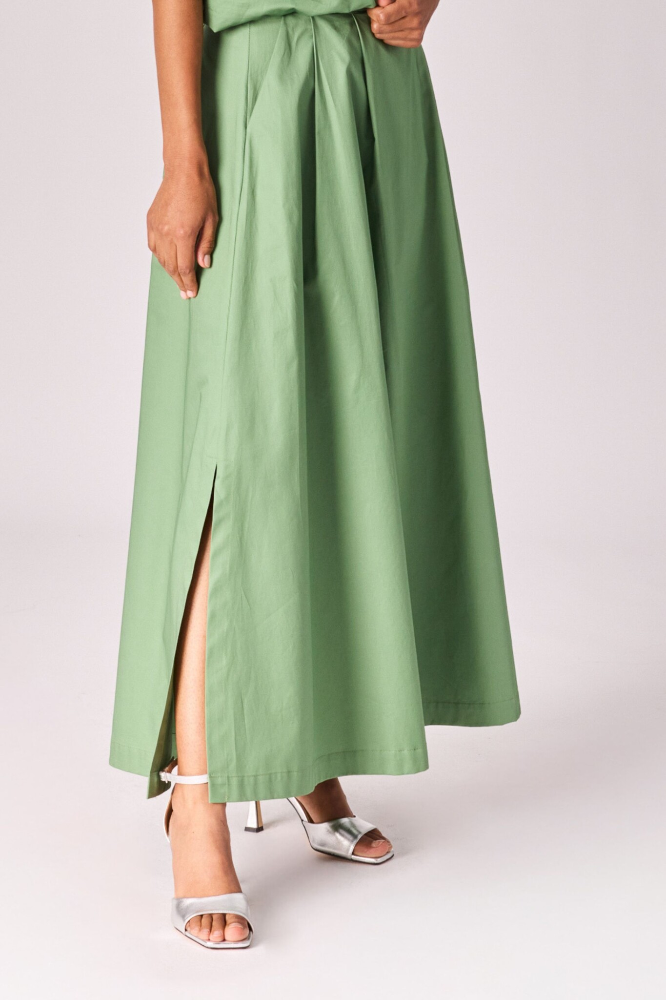 De LaLotti Romani Skirt in Sage Green is een elegante enkellange rok met een flatterende hoge taille, vervaardigd uit 100% ademend katoen. Het tijdloze ontwerp heeft een verfijnde A-lijn die zorgt voor een vrouwelijk en luchtig silhouet. Dankzij de verborgen ritssluiting behoudt de rok een strakke, minimalistische afwerking die perfect past bij een luxe zomerse look.