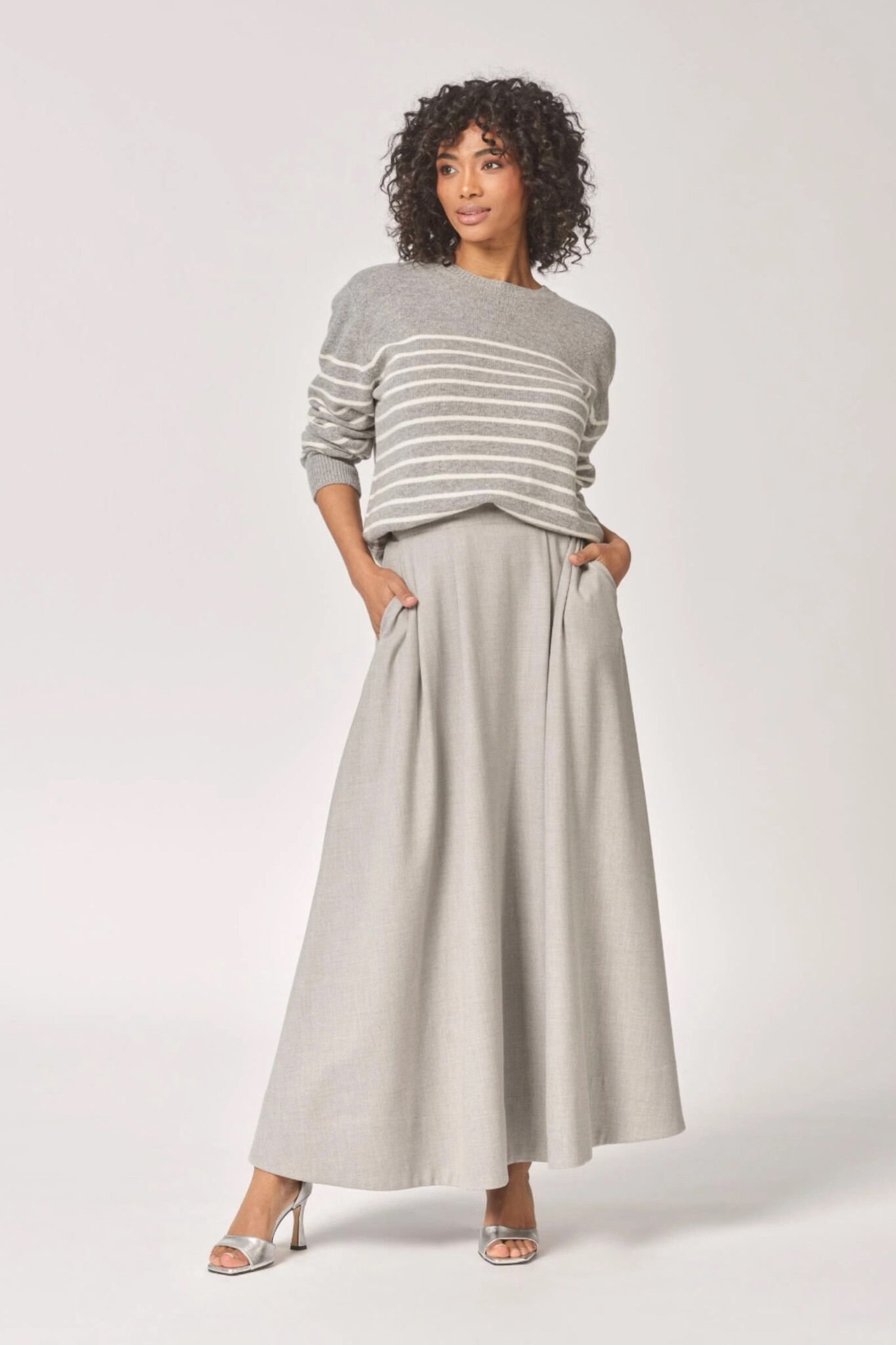 De Rozette Skirt van LaLotti is een elegante en comfortabele rok. Deze rok in een neutrale grijze kleur heeft een flatterende A-lijn pasvorm en een dramatische enkellengte. De rok is voorzien van elegante plooien die zorgen voor een soepele valling. Het comfort wordt verhoogd door een elastische taille in de achterzijde, terwijl de rok netjes sluit met een verborgen ritssluiting in de zij. Praktische steekzakken maken dit item compleet.