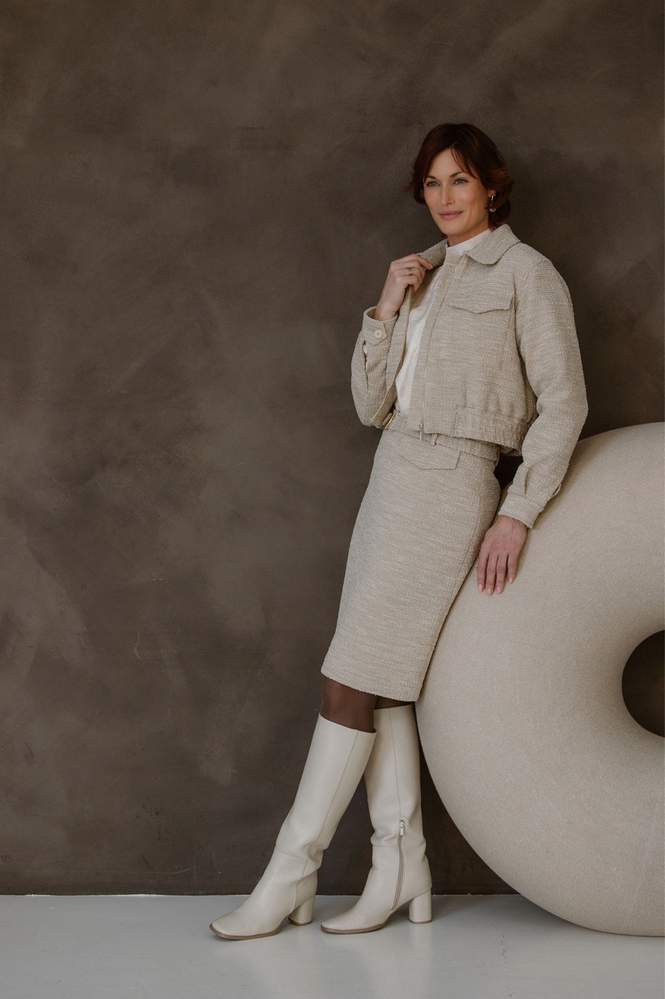 De Renske Rok van Lilytime is een elegant item in een veelzijdige zandkleur. De rok valt tot op de knie en heeft een verfijnde structuur. Het item is voorzien van riemlussen en wordt geleverd met een ceintuur met gouden details om de taille te accentueren. De rok is afgewerkt met neppe steekzakken en een verborgen ritssluiting aan de achterzijde voor een strakke look.