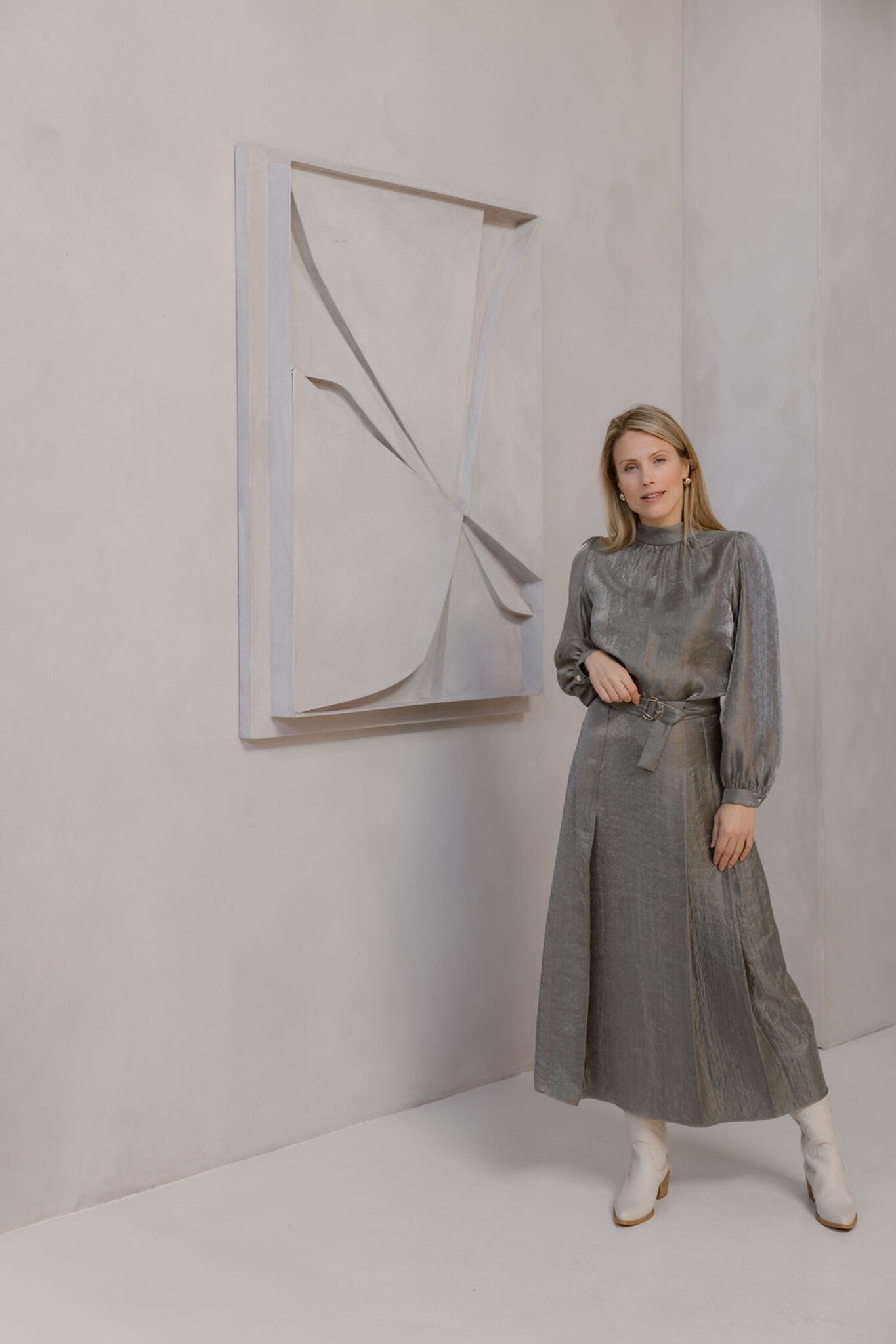 De Sabine Blouse van Lilytime is een elegant item in een verfijnde staalblauwe kleur. De blouse is voorzien van een subtiele zwarte stippenprint. Het item heeft een hoge hals en lange pofmouwen met subtiele manchetten. De plooien die vanaf de hals vallen, zorgen voor een soepele en flatterende pasvorm.