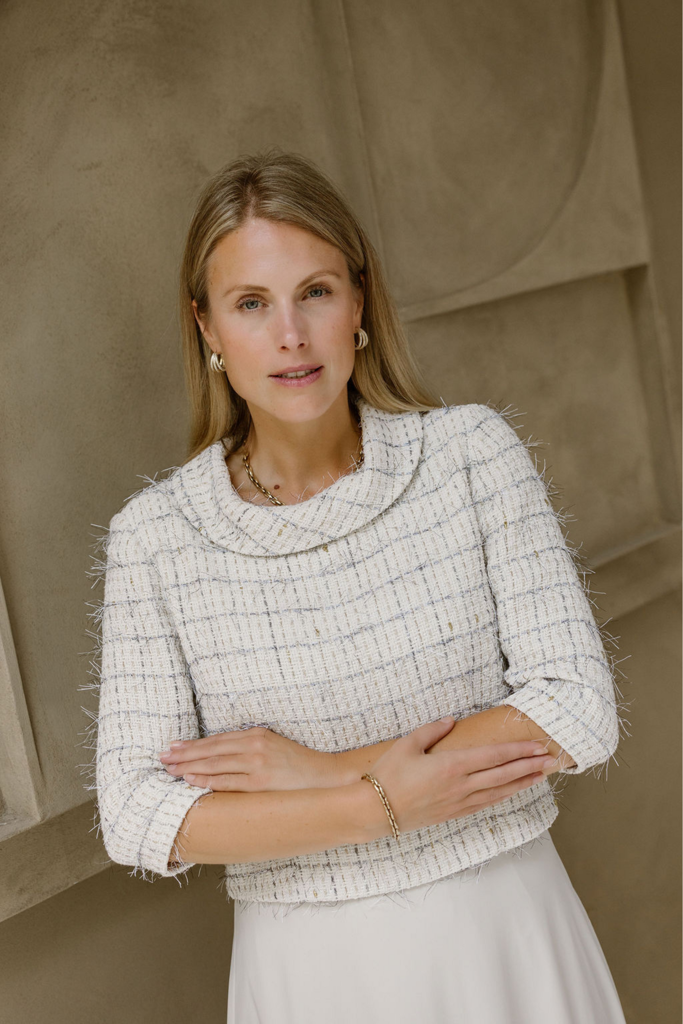 De Therese Top van Lilytime in off white dessin is een verzorgde top met 3/4 mouwen en een klassieke kraag. De boorden zijn omgeslagen en geven de top een nette afwerking. De blinde ritssluiting zorgt voor een strak geheel, passend bij een tijdloze en draagbare stijl.
