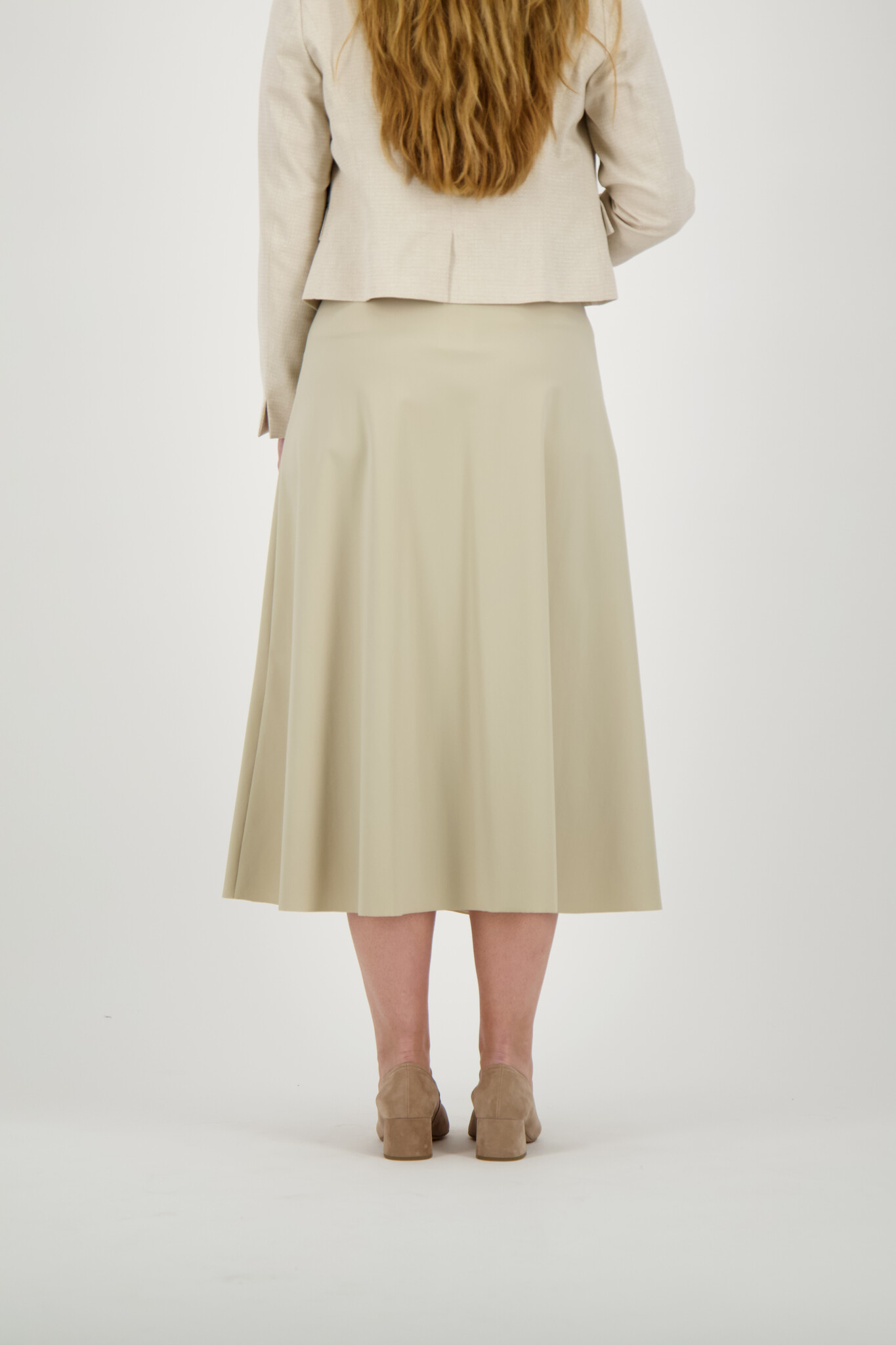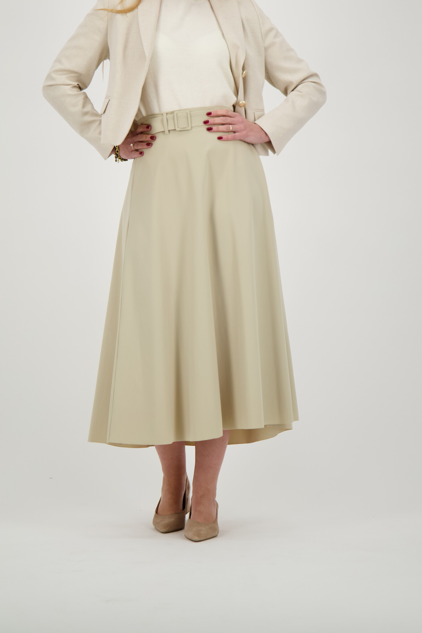 De Tineke rok van Lilytime in de kleur zand is een rok van een gladde stof met een uitlopend model. Het overslagdetail en het bijpassende stofceintuur zorgen voor een verfijnde en vrouwelijke afwerking.