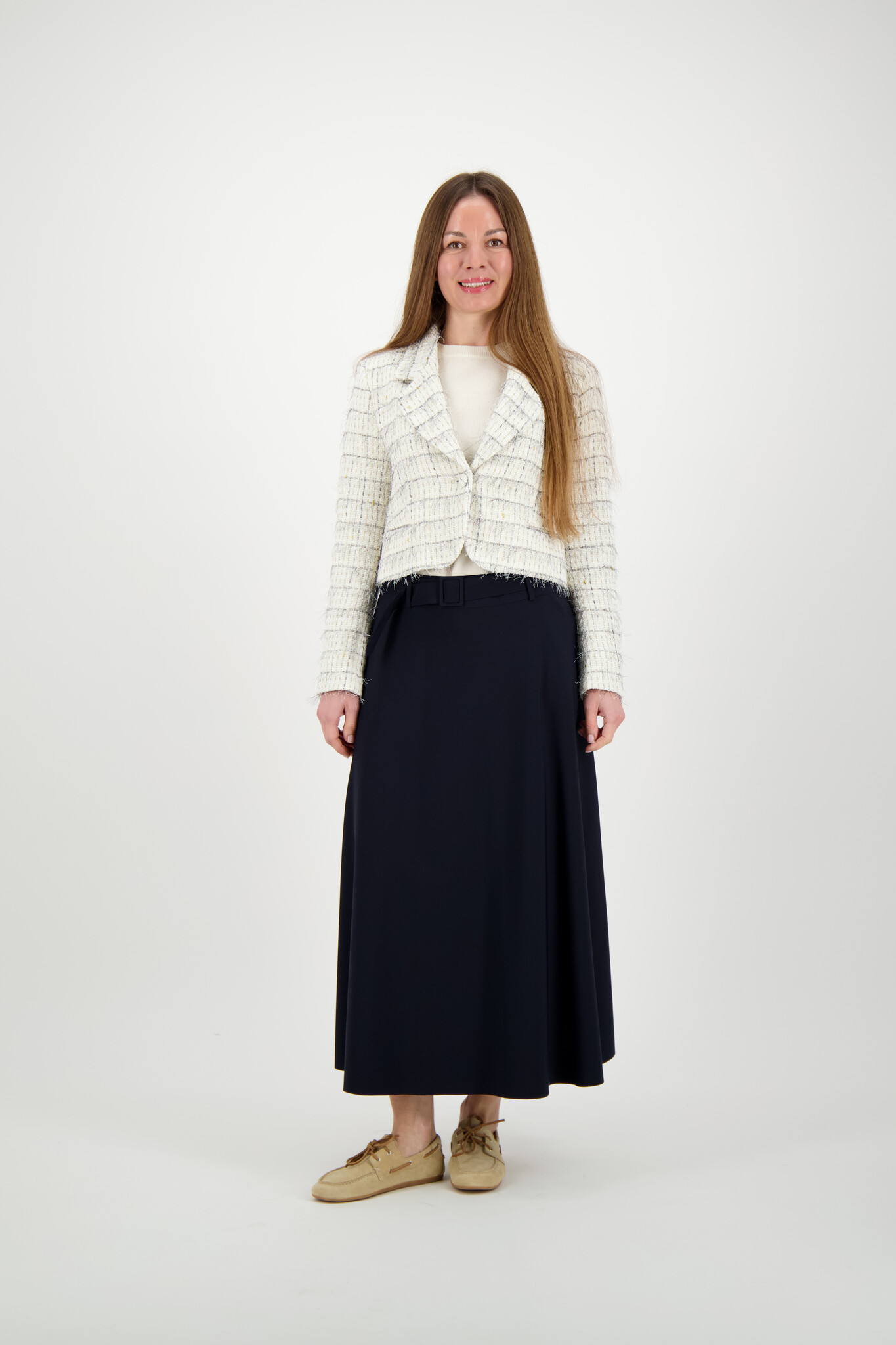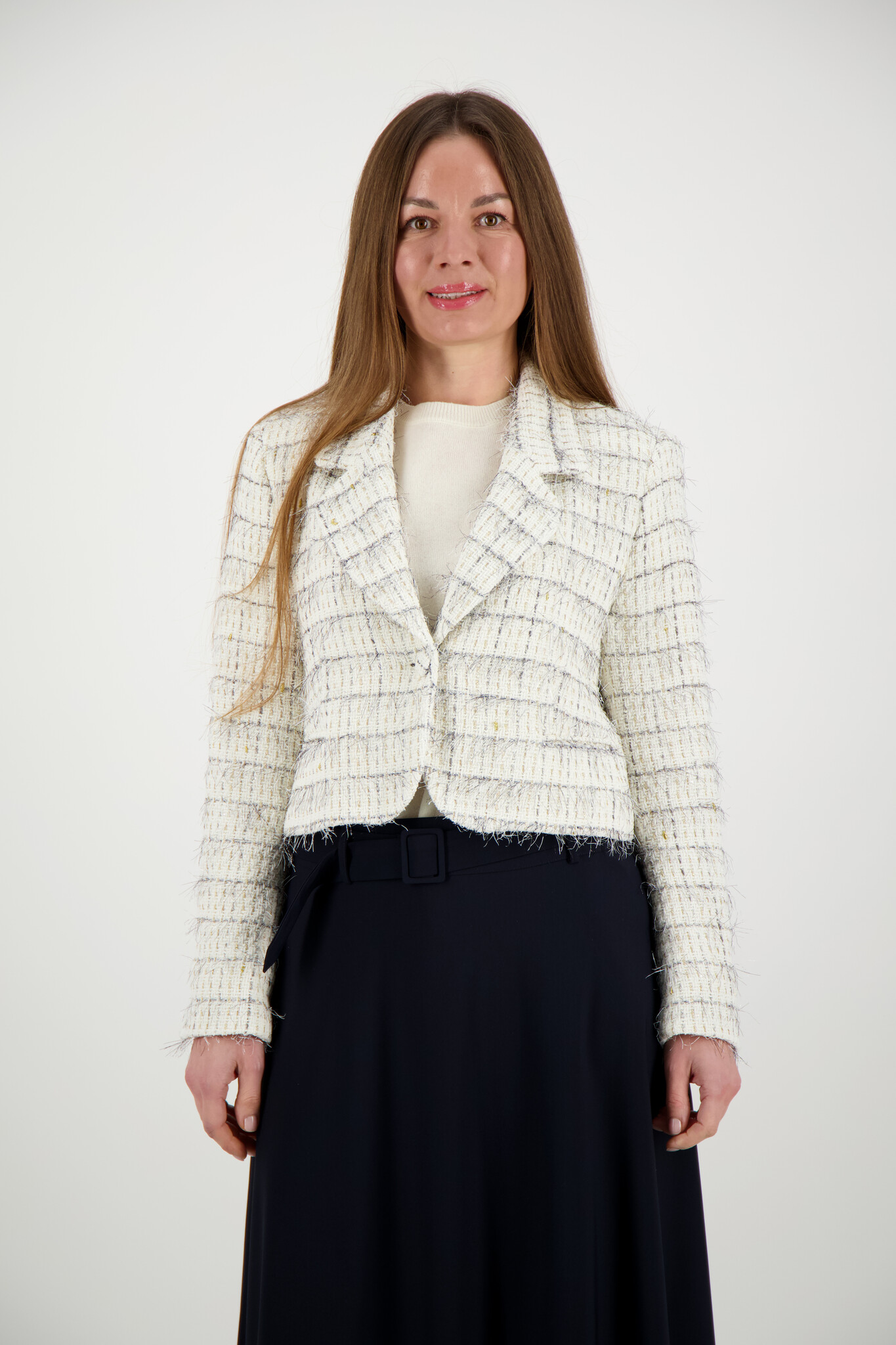 De Vera Blazer van Lilytime is een korte blazer in Off White Dessin met een klassieke reverskraag en lange mouwen. De blazer is voorzien van een knoopsluiting met gouden knopen en subtiele lurex-draad voor een luxe touch. Met schoudervullingen en een korte pasvorm geeft deze blazer een elegante, gestructureerde look, ideaal voor zowel werk als feestelijke gelegenheden.