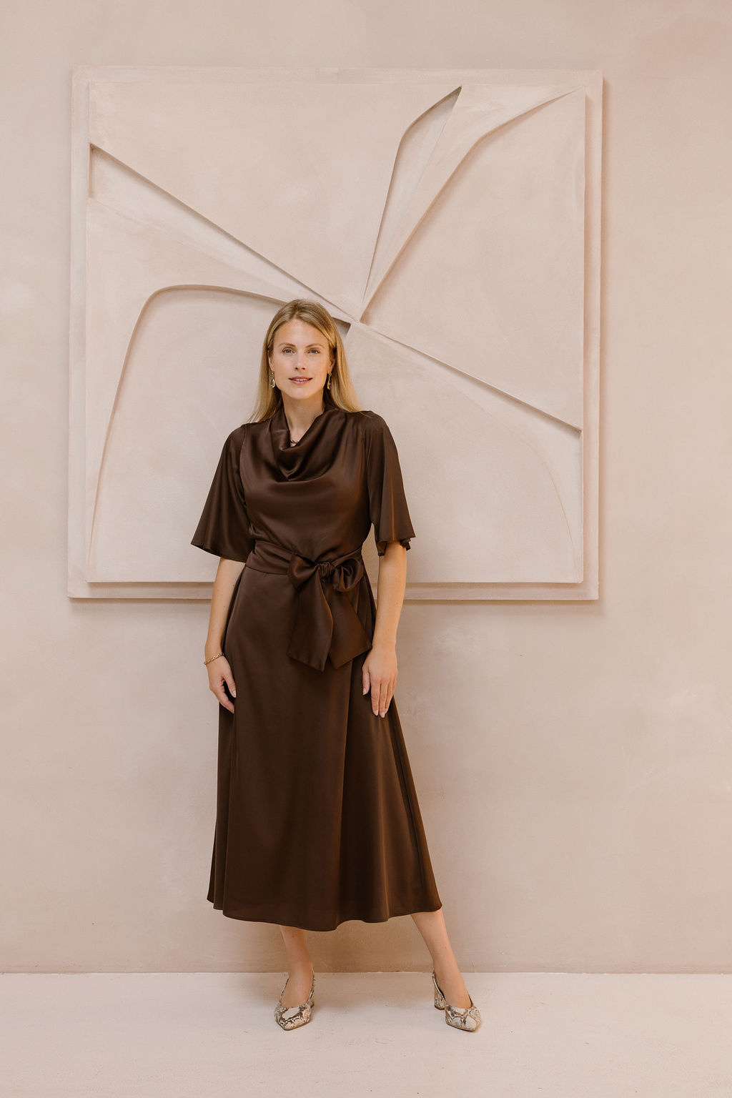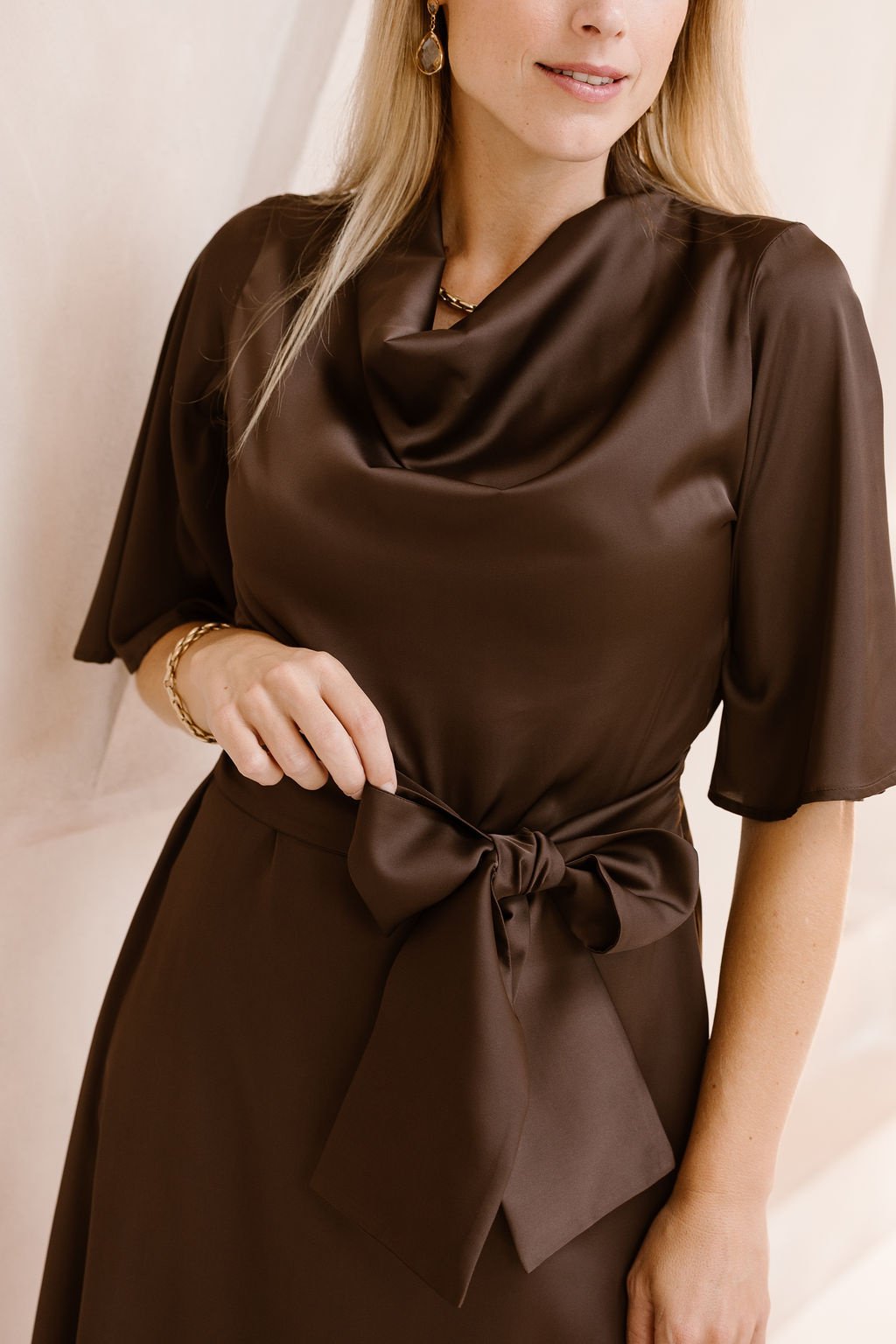 De Lilytime Wilke Jurk in Donkerbruin is een elegante midi-jurk met een diepe, luxueuze bruine tint. Dit model is voorzien van een verfijnde watervalhals, korte soepelvallende mouwen en een breed strikceintuur om de taille te accentueren. De jurk is vervaardigd uit een glanzende satijnlook stof die prachtig langs het lichaam valt, wat zorgt voor een stijlvolle en vrouwelijke uitstraling.