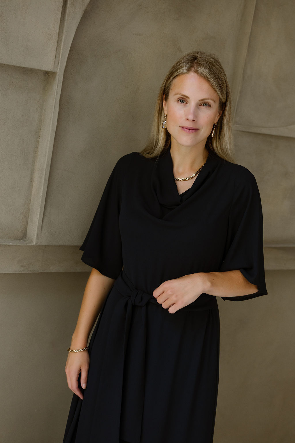 De Lilytime Wilke Jurk in Navy is een elegante midi-jurk met een tijdloze, diepblauwe kleur. Het model heeft een flatterende gedrapeerde watervalhals en korte, soepelvallende mouwen die zorgen voor een verfijnd silhouet. De jurk is voorzien van een bijpassend strikceintuur in de taille om het vrouwelijk accent te benadrukken en valt prachtig soepel tot over de knie.