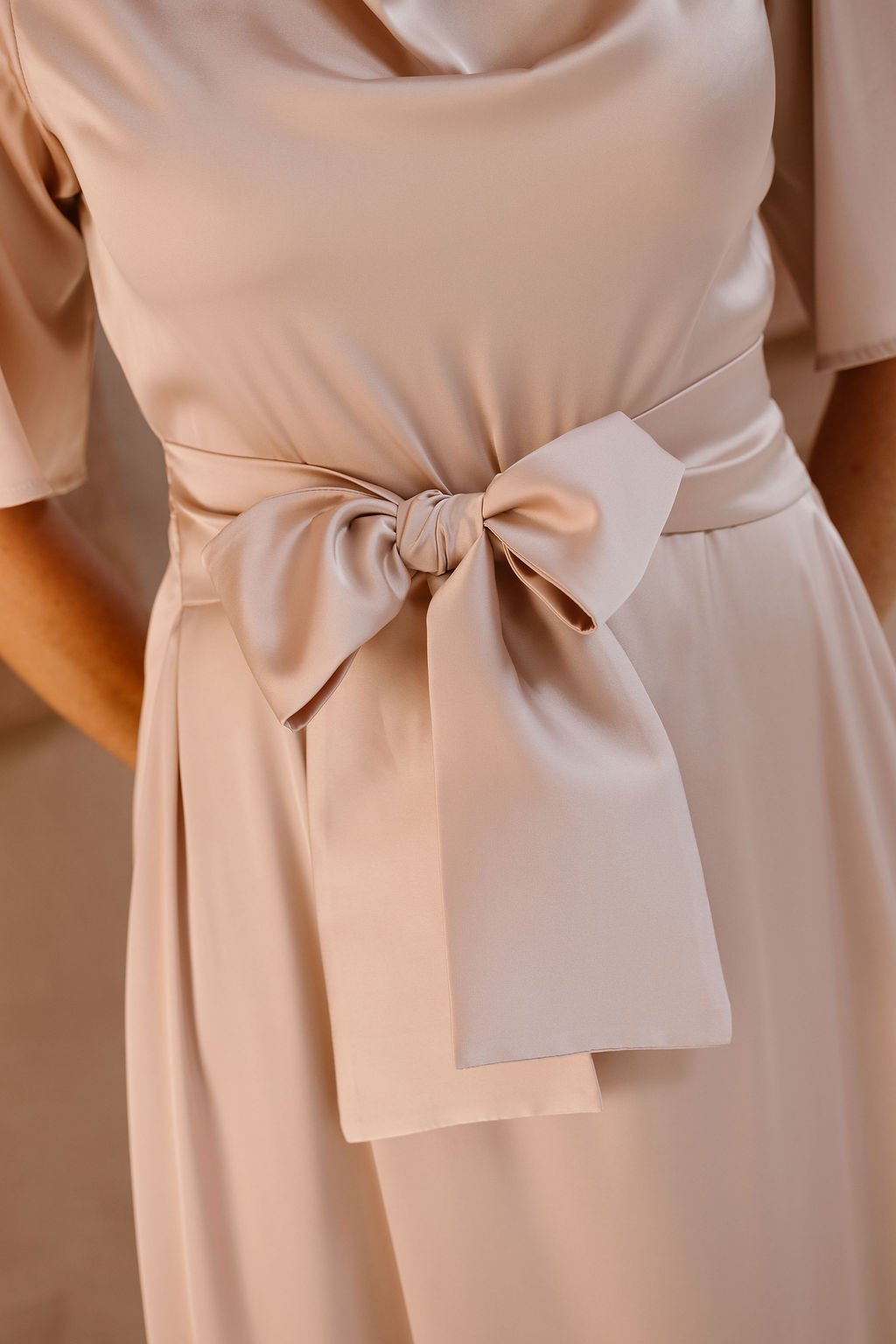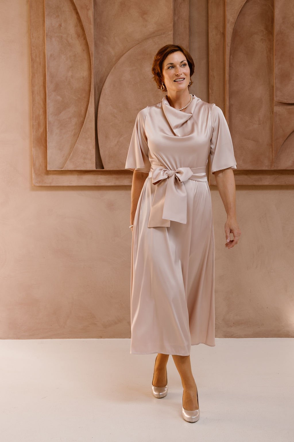 De Lilytime Wilke Jurk in Roze is een elegante midi-jurk met een glanzende finish in een zachte poederroze tint. Het model heeft een verfijnde watervalhals, korte uitlopende mouwen en een breed strikceintuur om de taille te accentueren. Deze jurk is vervaardigd uit een soepelvallende satijnlook stof, wat zorgt voor een luxueuze uitstraling die perfect is voor feestelijke gelegenheden.