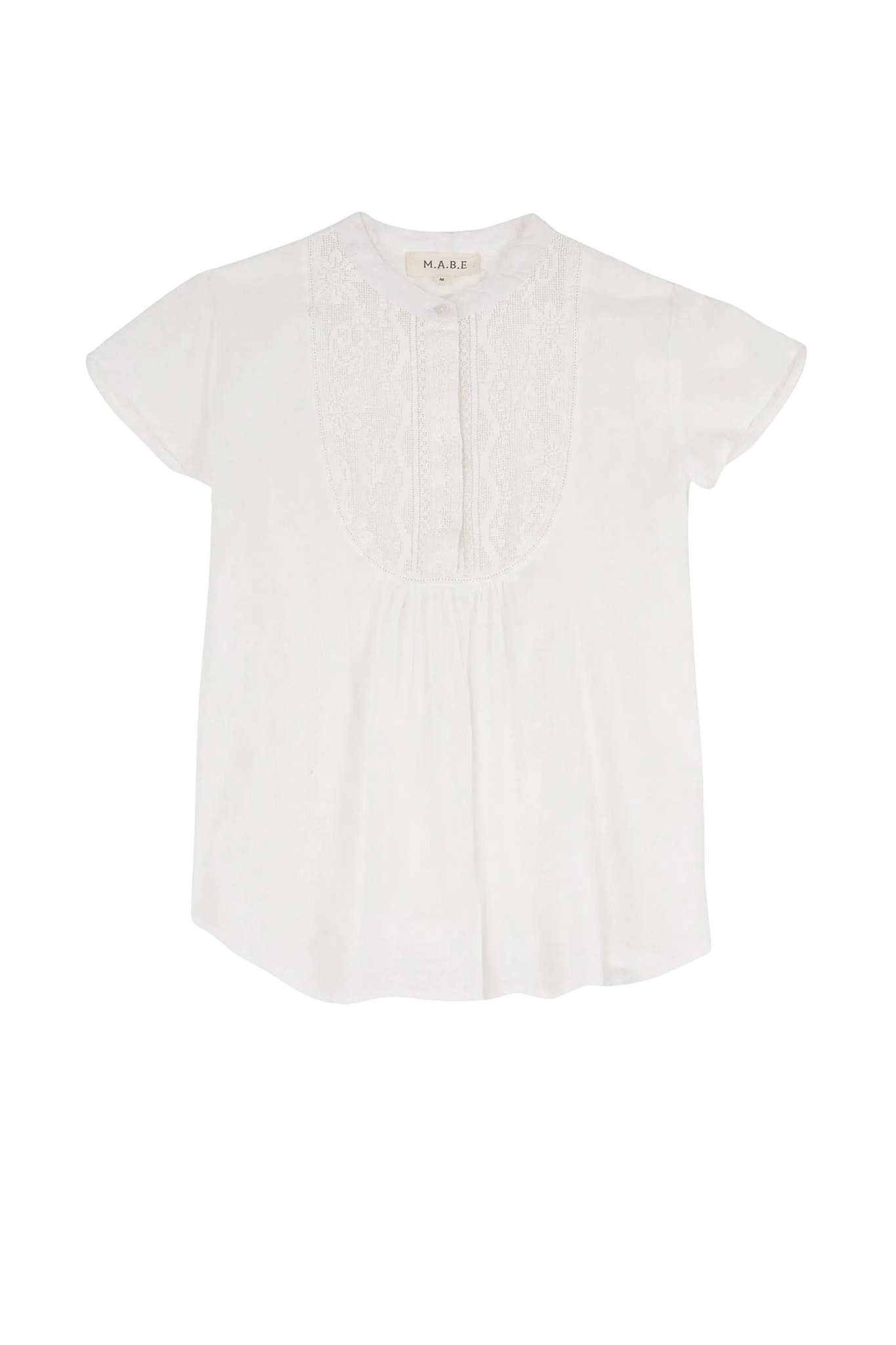 De M.A.B.E. Freya Short Sleeve Top in White is een luchtige, romantische top met een bohemian uitstraling. Dit model is vervaardigd uit een lichte stof en voorzien van een ronde hals met een korte knoopsluiting en korte mouwen. Het ontwerp onderscheidt zich door de prachtige, fijnmazige broderiedetails op het voorpand, wat in combinatie met de comfortabele loose fit zorgt voor een verfijnde, zomerse look.