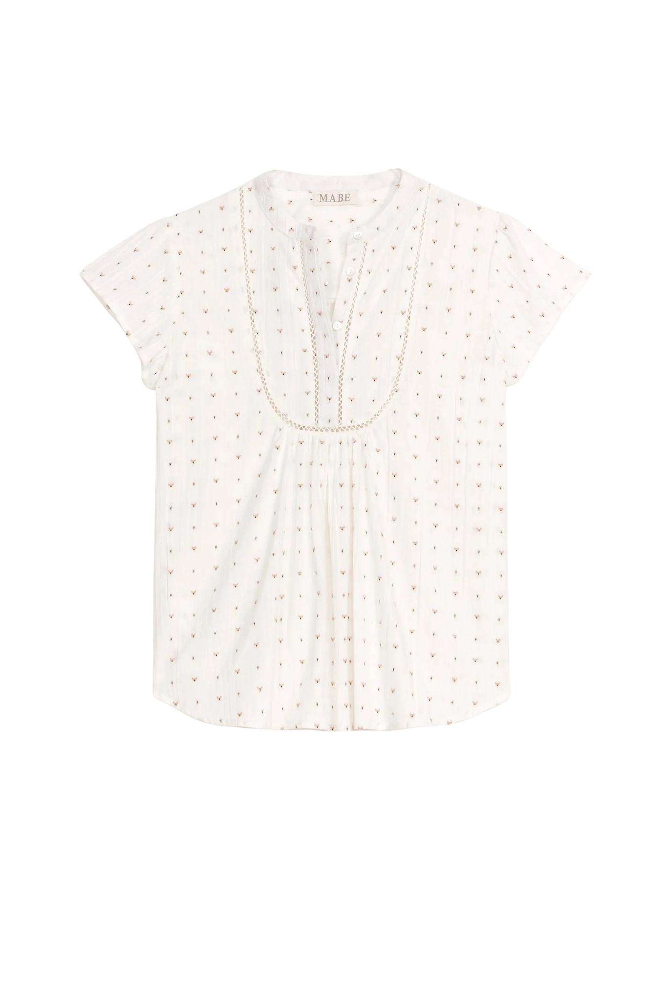 De M.A.B.E. Rita Short Sleeve Top in Ecru/Multi is een charmante en luchtige top met een romantische uitstraling. Dit item is voorzien van korte mouwen en een ronde hals die overgaat in een subtiele V-uitsnijding met een knoopsluiting. De top is versierd met een fijn, meerkleurig stippenprintje en gedetailleerd met elegant opengewerkt kantwerk rondom de halslijn, wat zorgt voor een verfijnde en vrouwelijke look.