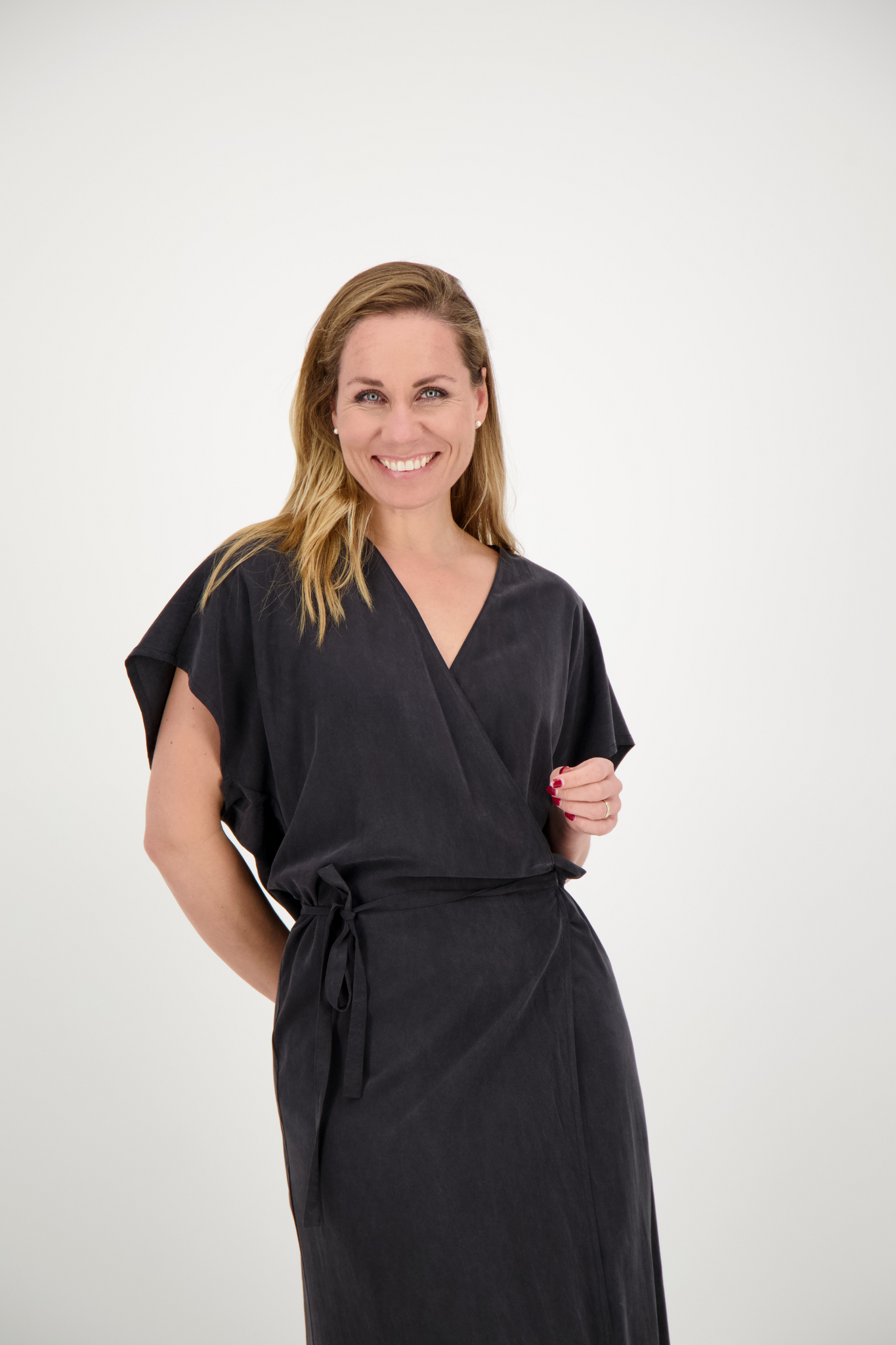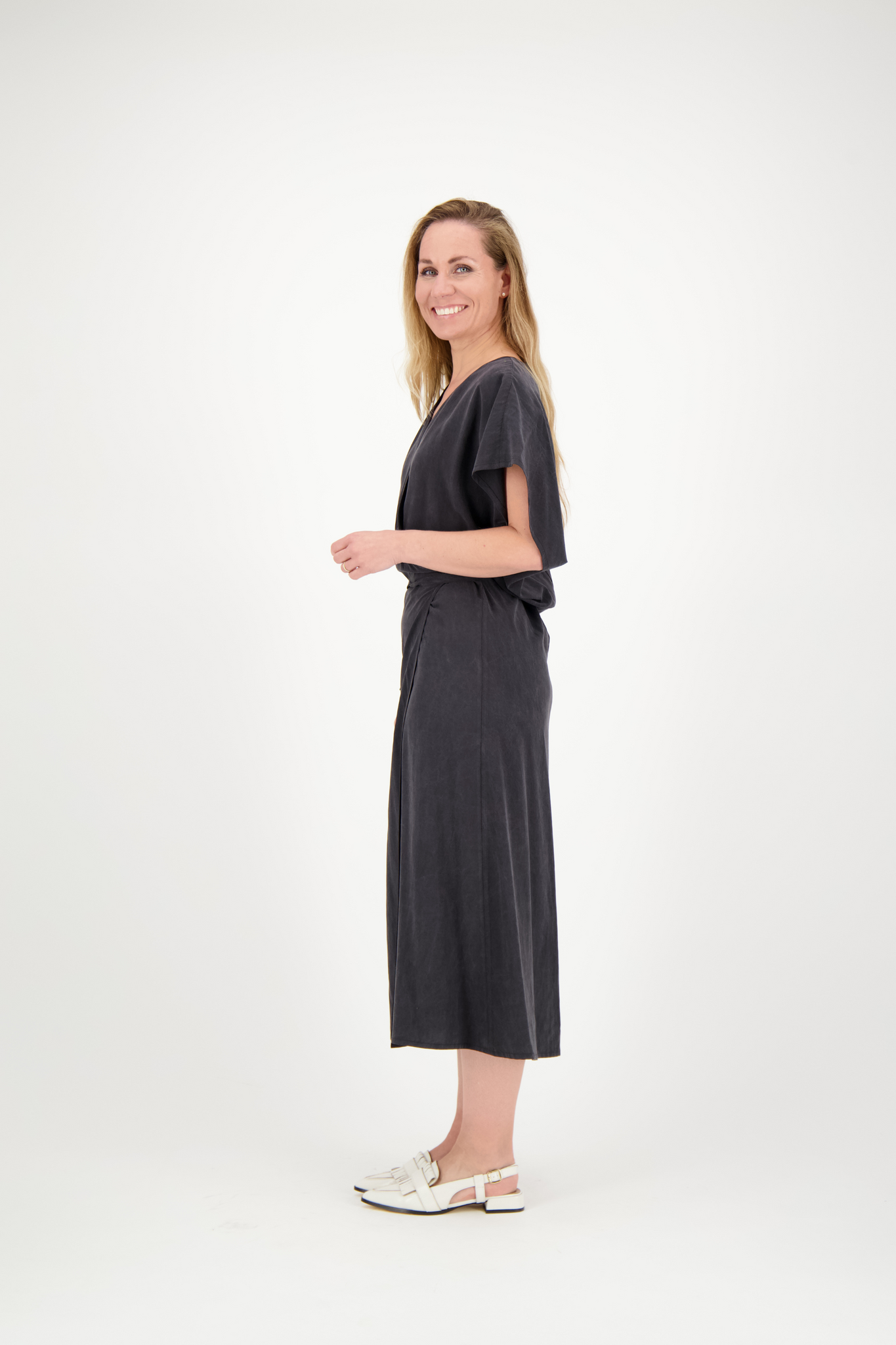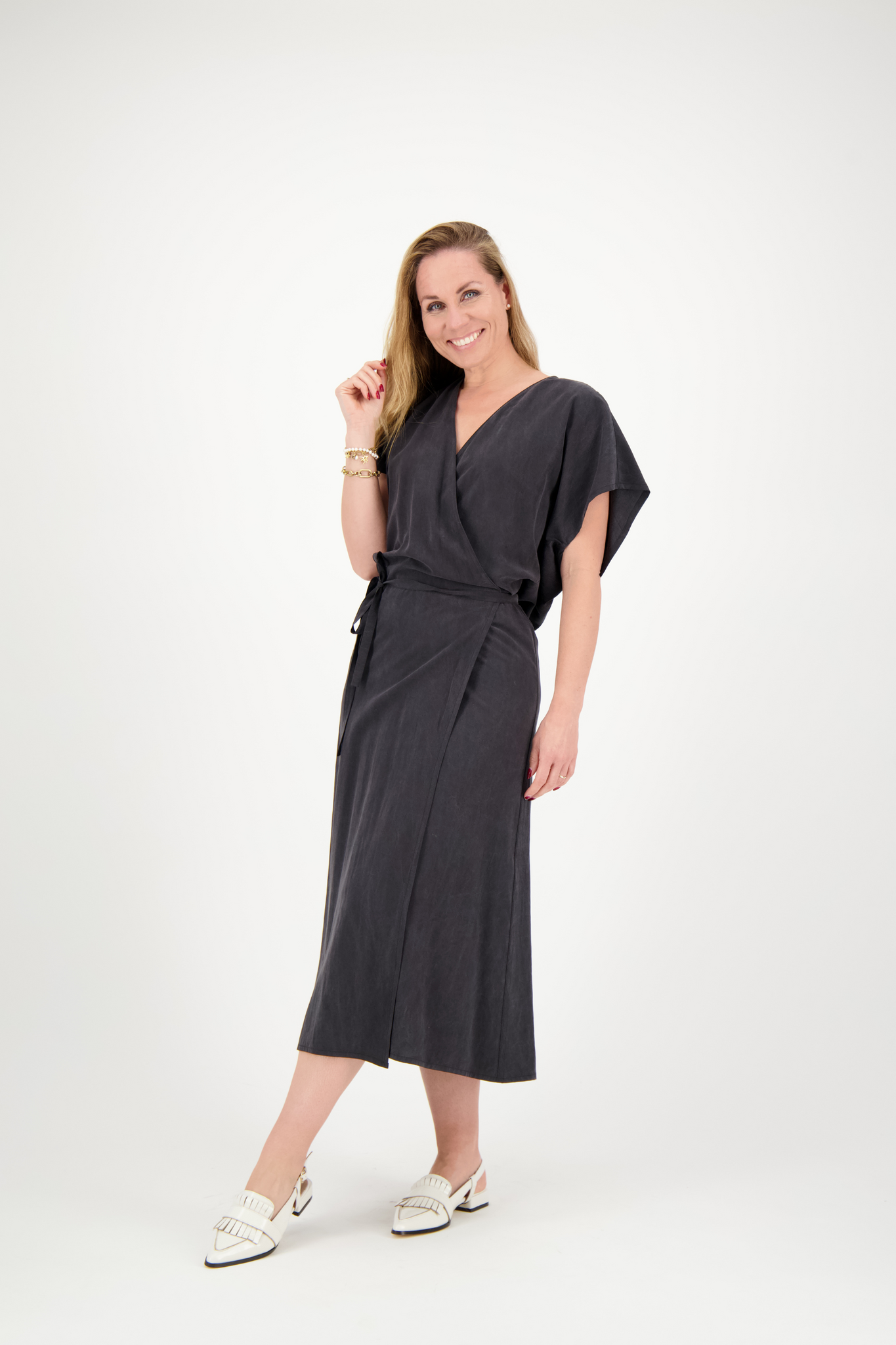 De Midi Dress van Milla in Charcoal is een elegante jurk met V-hals en korte mouwen met verlaagde schoudernaad. Het model heeft een overslag aan de voorkant met een bijpassend ceintuur in de taille en een subtiele opening in de zijnaad met knopen. De midi-lengte en soepele stof zorgen voor een vloeiende pasvorm, waardoor deze jurk ideaal is voor zowel casual als meer geklede gelegenheden.