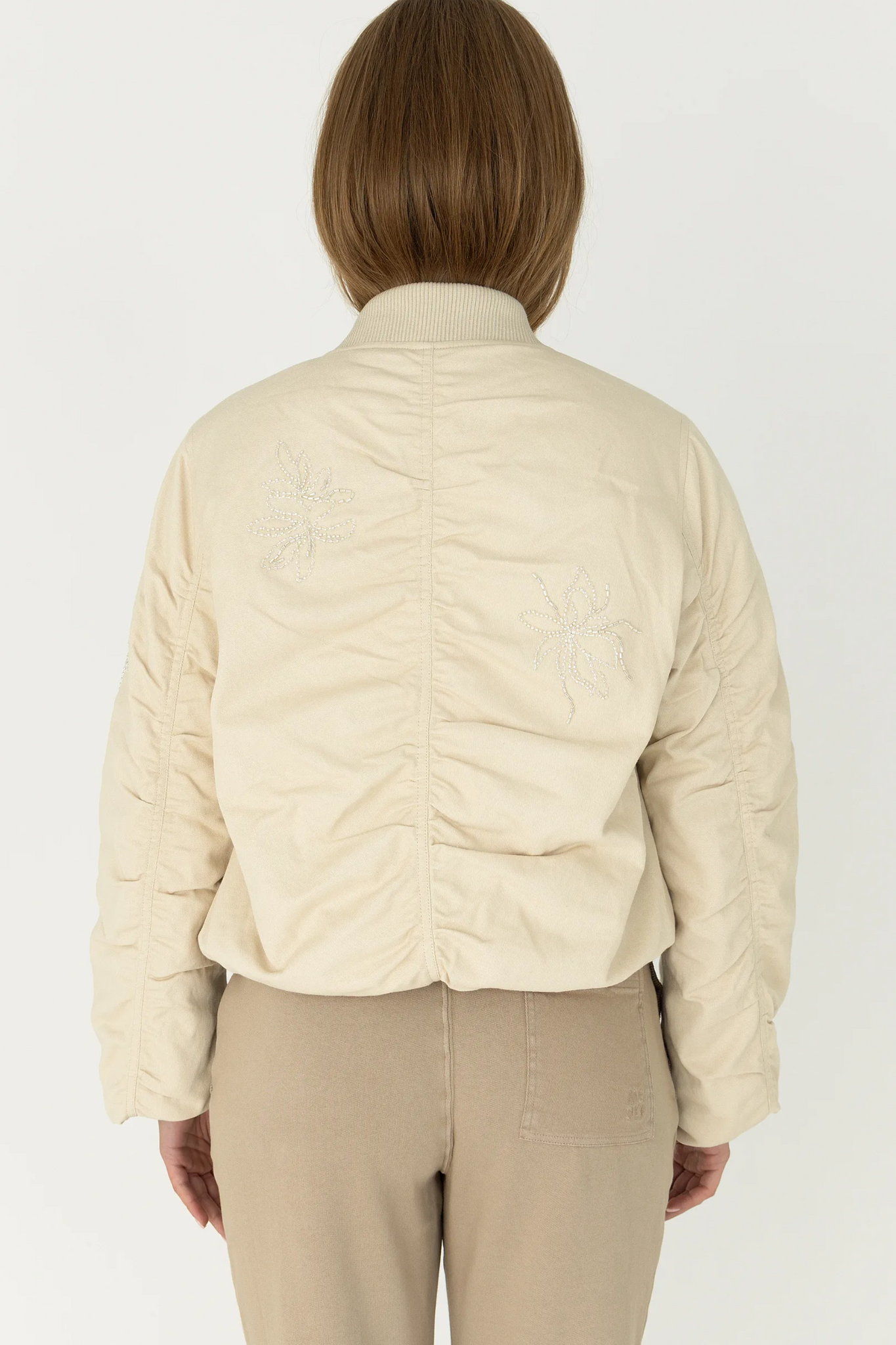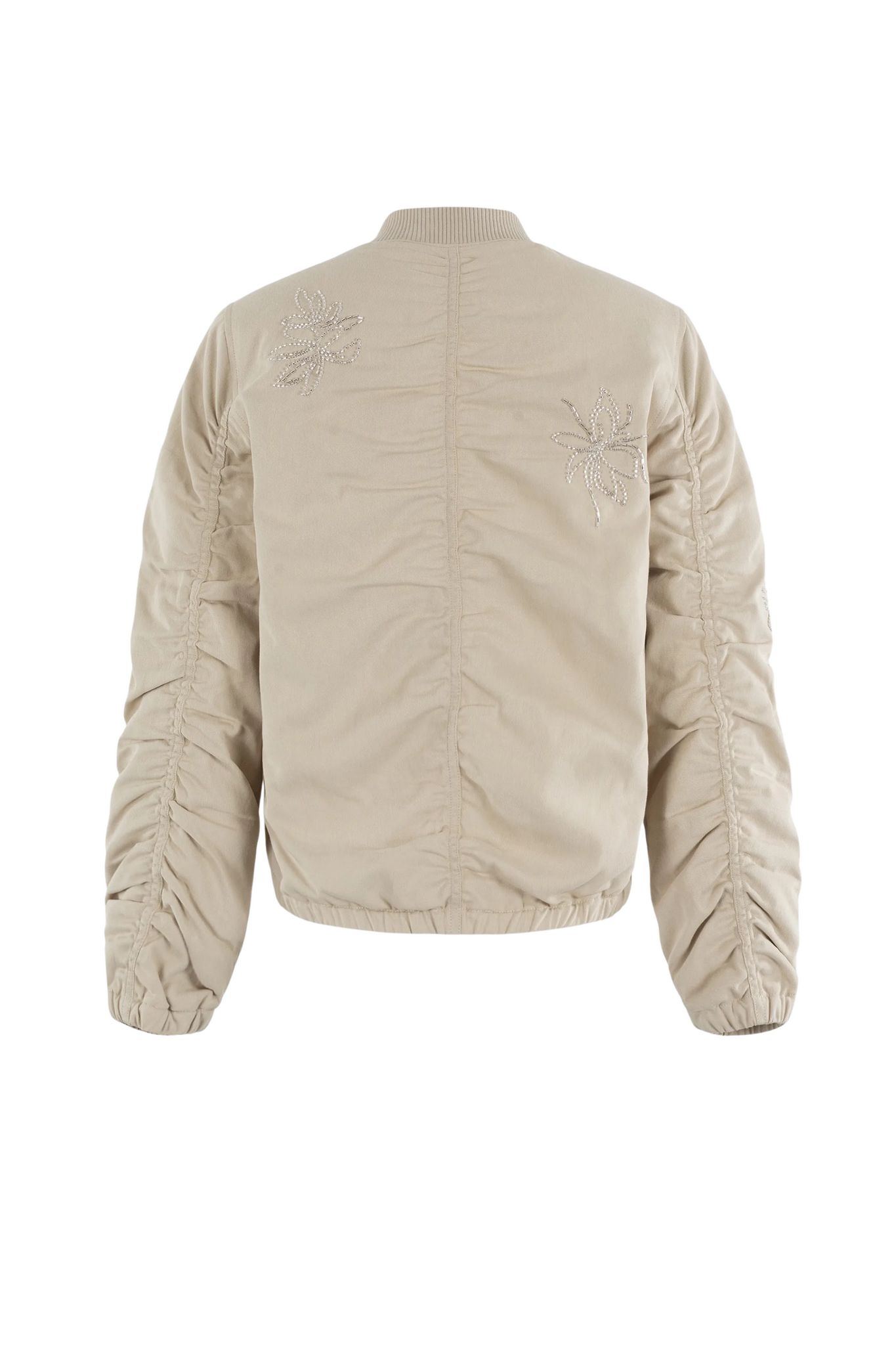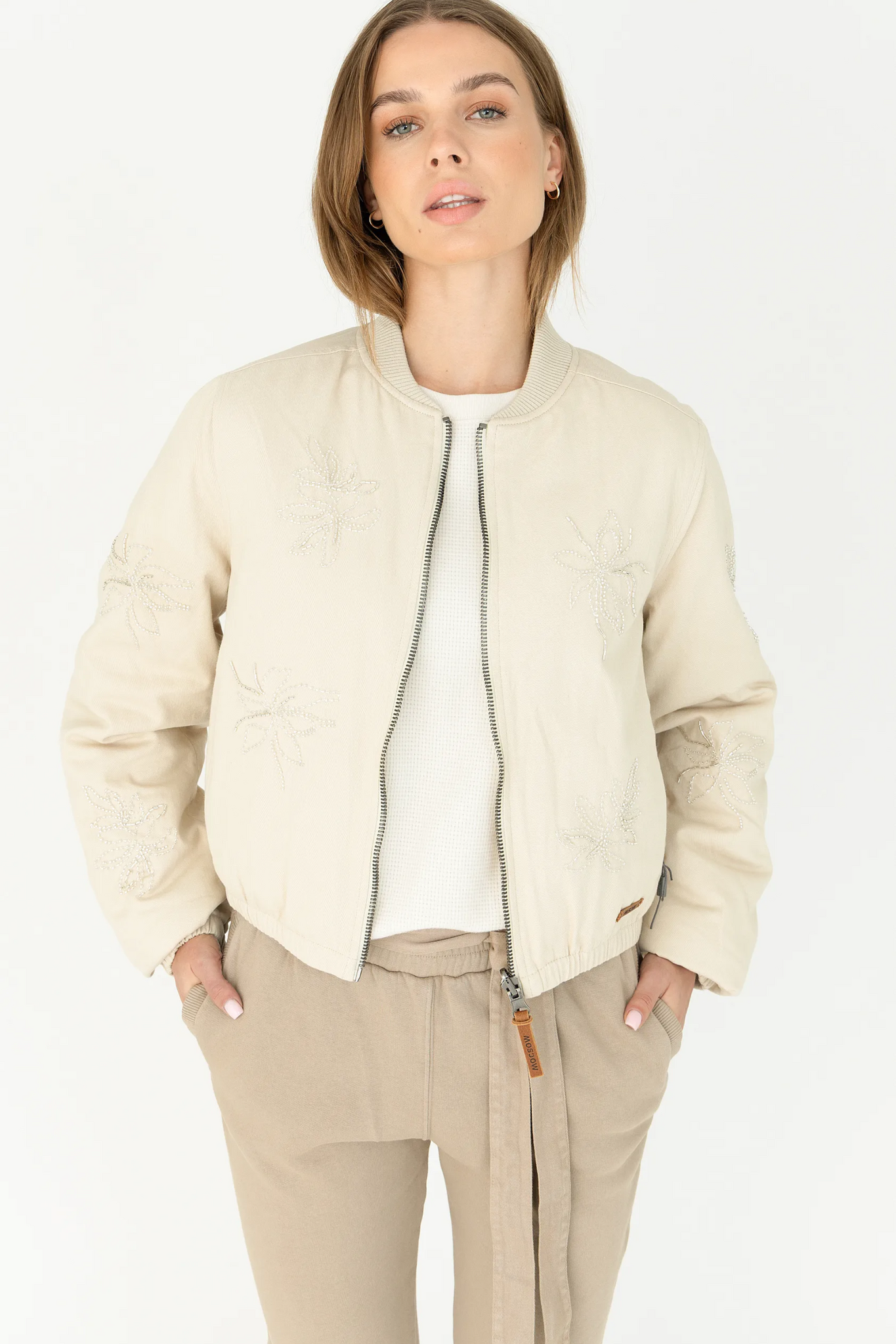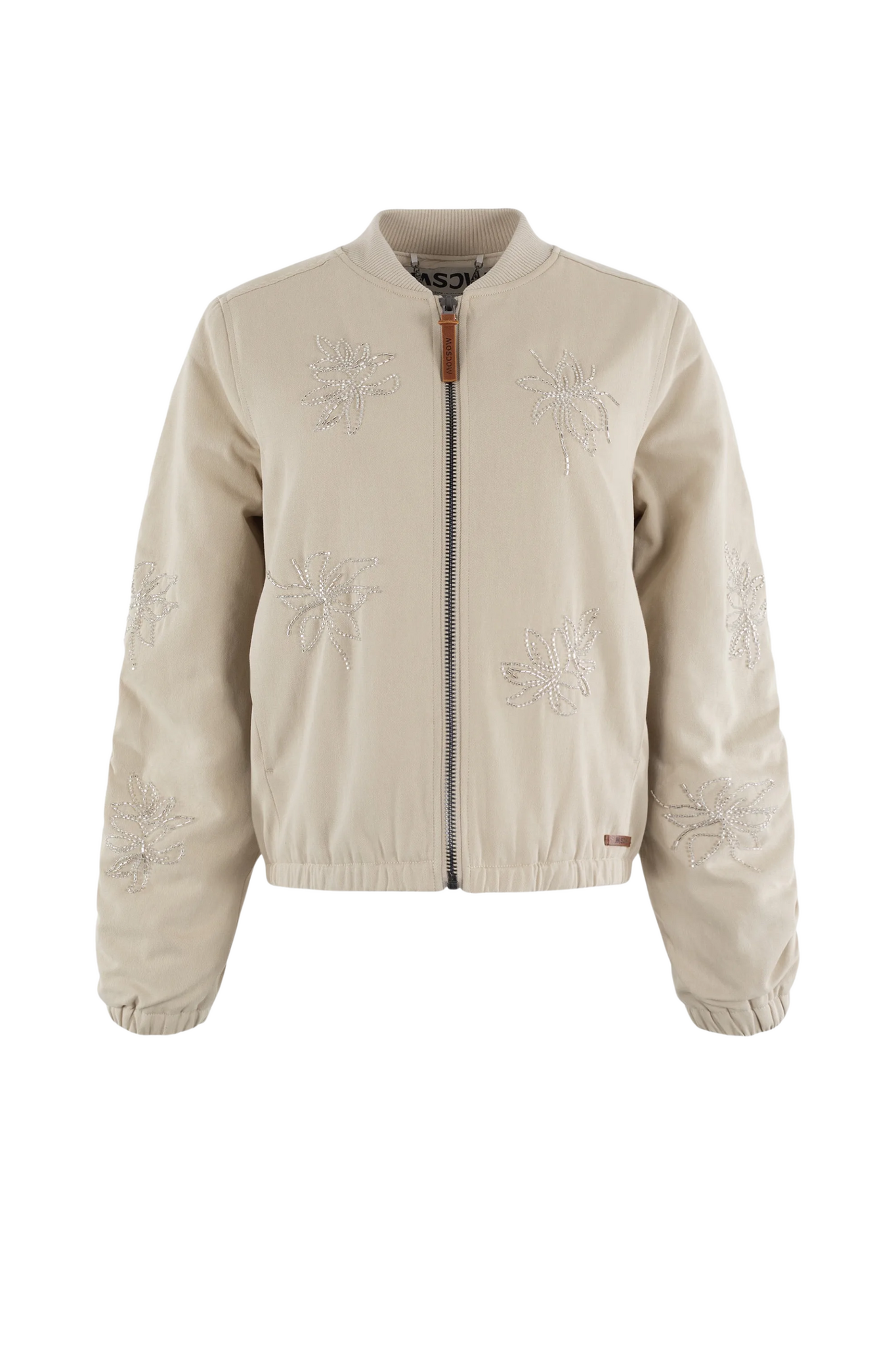 De Moscow Bomber Bash in Sand is een stijlvol en sportief kort jasje met een luxe uitstraling. Dit zandkleurige model onderscheidt zich door de verfijnde, glinsterende bloemenborduursels op de voorzijde en mouwen. De bomber is voorzien van een praktische ritssluiting, een klassieke opstaande kraag en elastische boorden aan de onderzijde en mouwuiteinden voor een perfecte pasvorm.