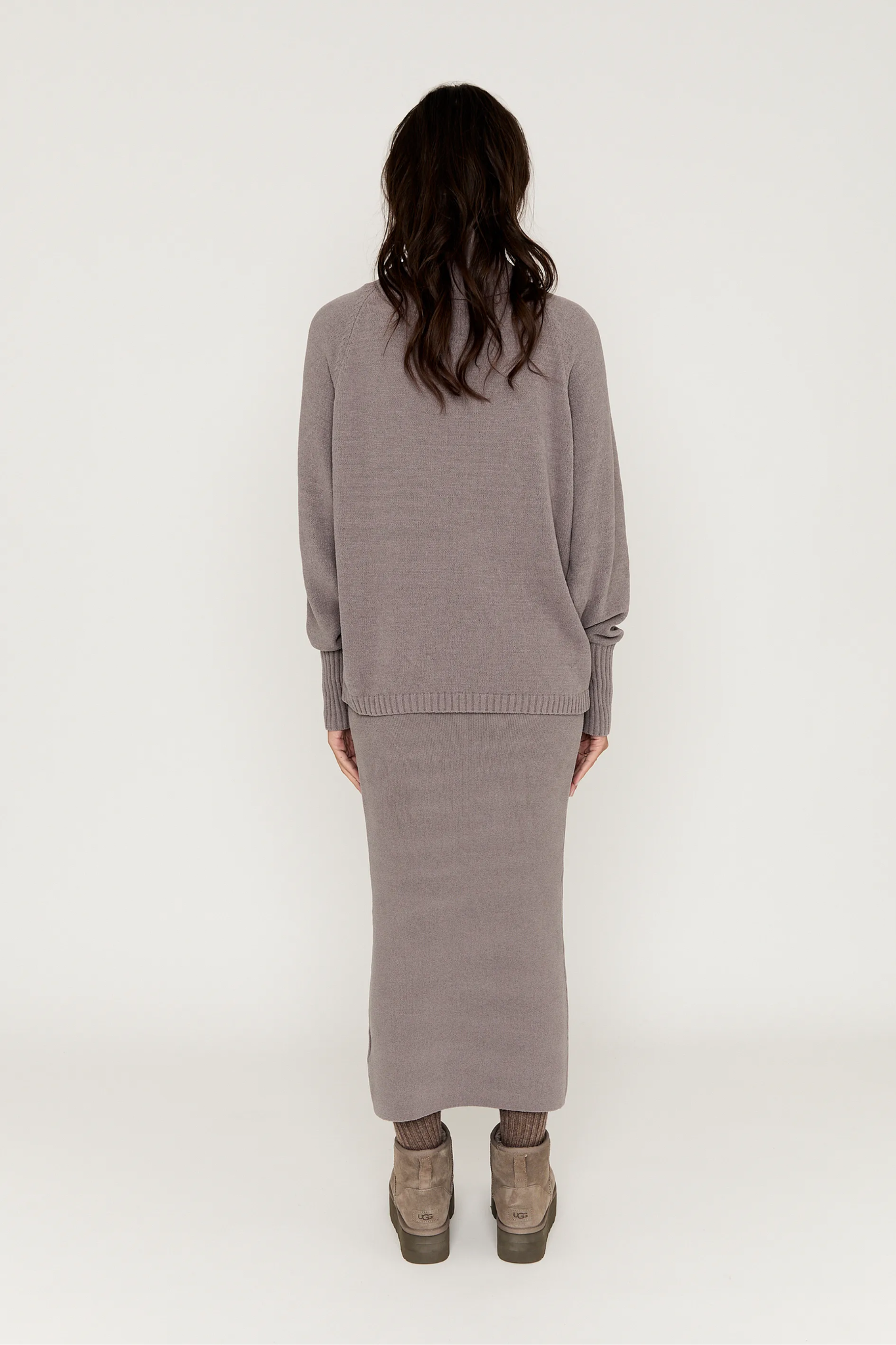 De Debt Skirt van Moscow is een comfortabele en stijlvolle gebreide maxi-rok met een rechte pasvorm en elastische taille. Deze rok is ideaal voor het creëren van elegante en cozy outfits en makkelijk te combineren met truien, tops of blouses.