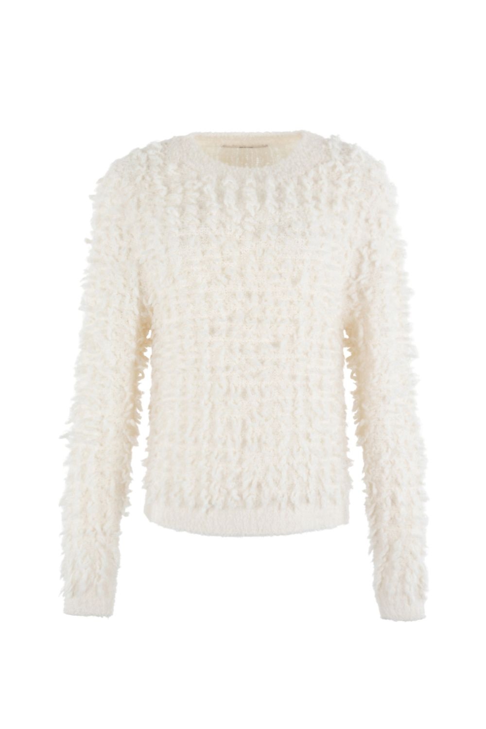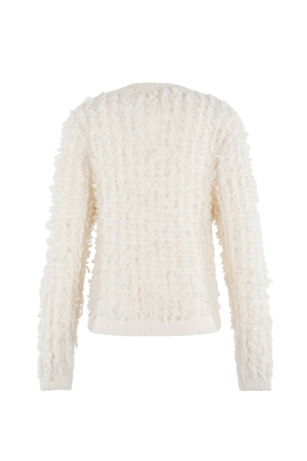De Doodel Pullover van Moscow is een comfortabele, grof gebreide trui in een crèmekleurige tint. De trui heeft een ronde hals en lange mouwen met geribde boorden. Het item is voorzien van over lusjes voor een speels effect en een subtiel logo detail.