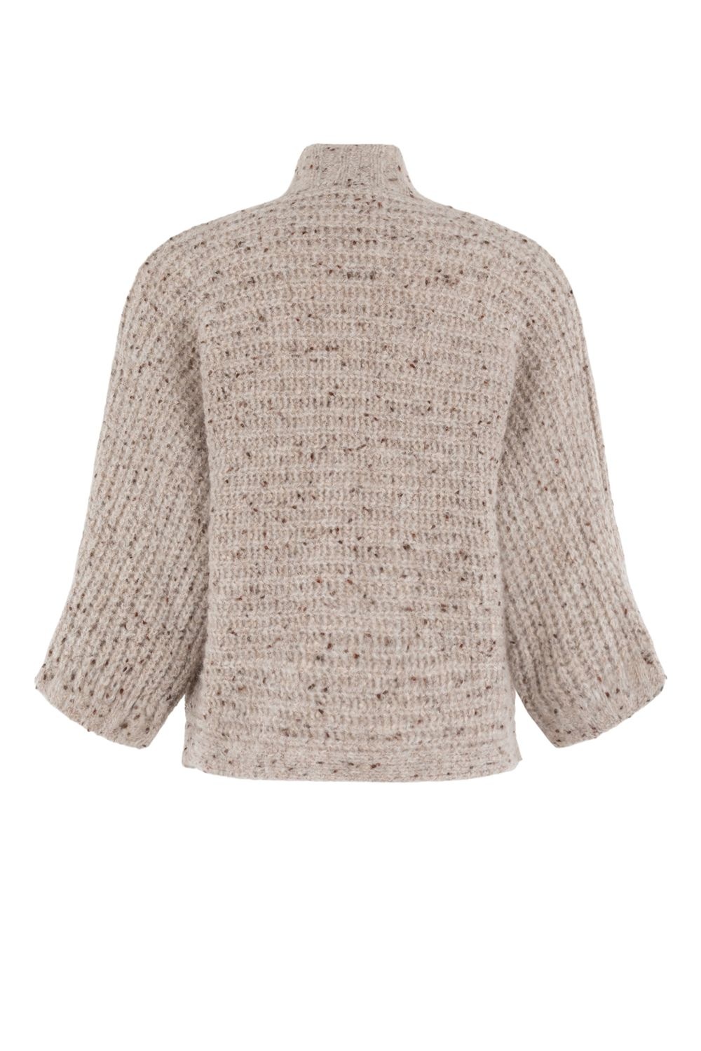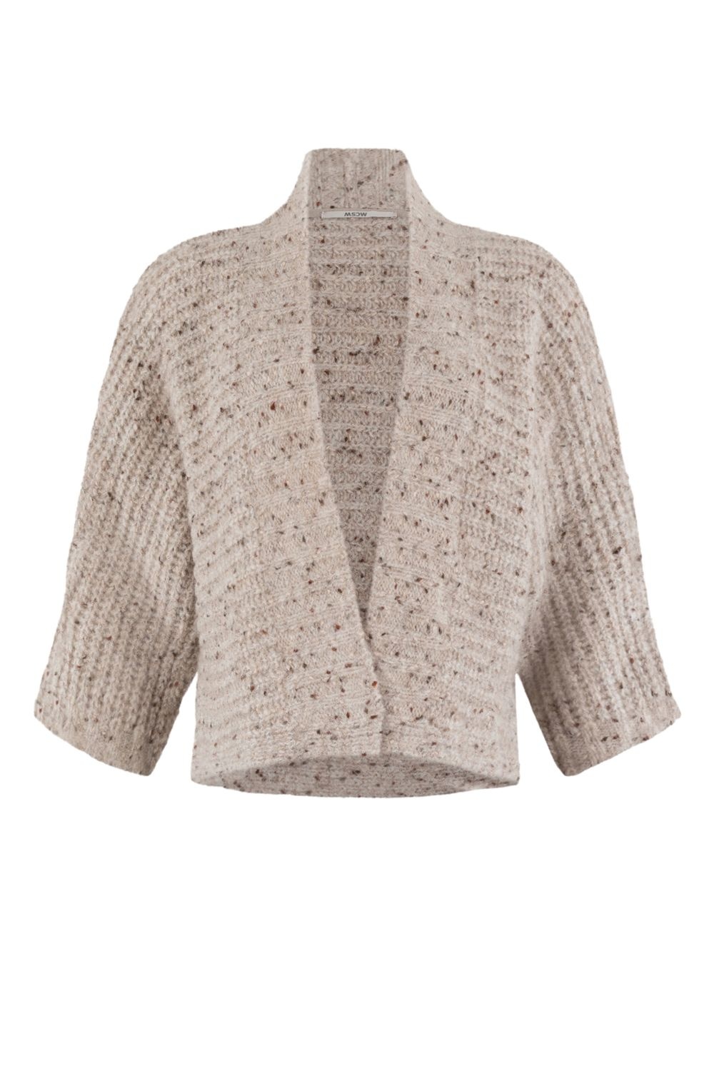 De Evi Vest van Moscow is een comfortabel, grof gebreid vest in een taupe kleur. Het vest heeft driekwart mouwen en valt open aan de voorzijde, zonder sluiting. De bruine spikkels in het breisel zorgen voor een speels effect.