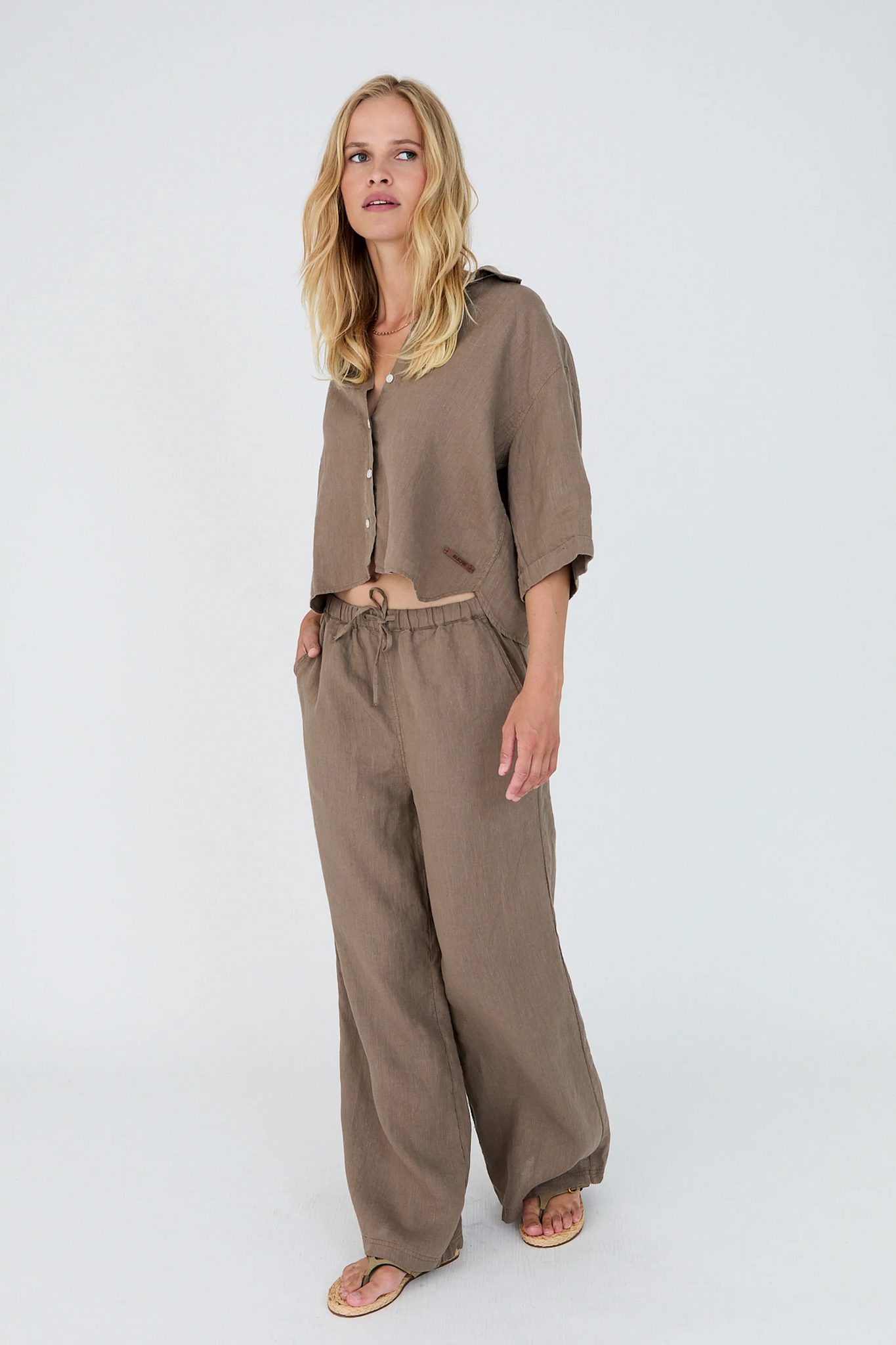 De Moscow Heylow Broek in Dark Brown is een stijlvolle en luchtige pantalon, perfect voor warmere dagen dankzij het gebruik van 100% linnen. Dit model heeft een trendy wide-leg silhouet en een comfortabele elastische tailleband die naar wens kan worden versteld met een strikceintuur. De broek is praktisch afgewerkt met steekzakken aan de zijkanten en zakken op de achterkant, wat zorgt voor een relaxte maar verzorgde uitstraling in een diepe bruintint.