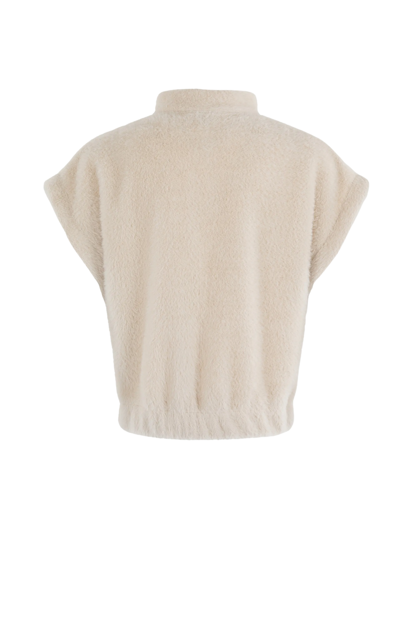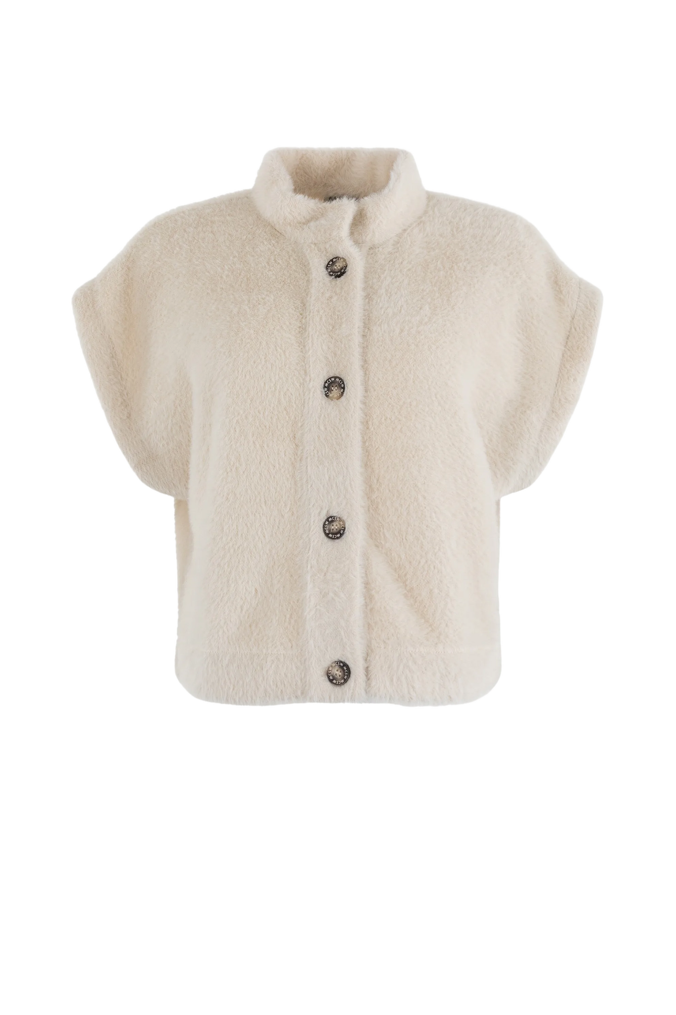Het Jenny Gilet van Moscow is een comfortabel en stijlvol gilet met een hoge hals, verlaagde schoudernaden en een knoopsluiting. Het gilet is uitgevoerd in een fluffy stof die zorgt voor extra draagcomfort. Perfect om te combineren over shirts en truien voor een warme, trendy look.