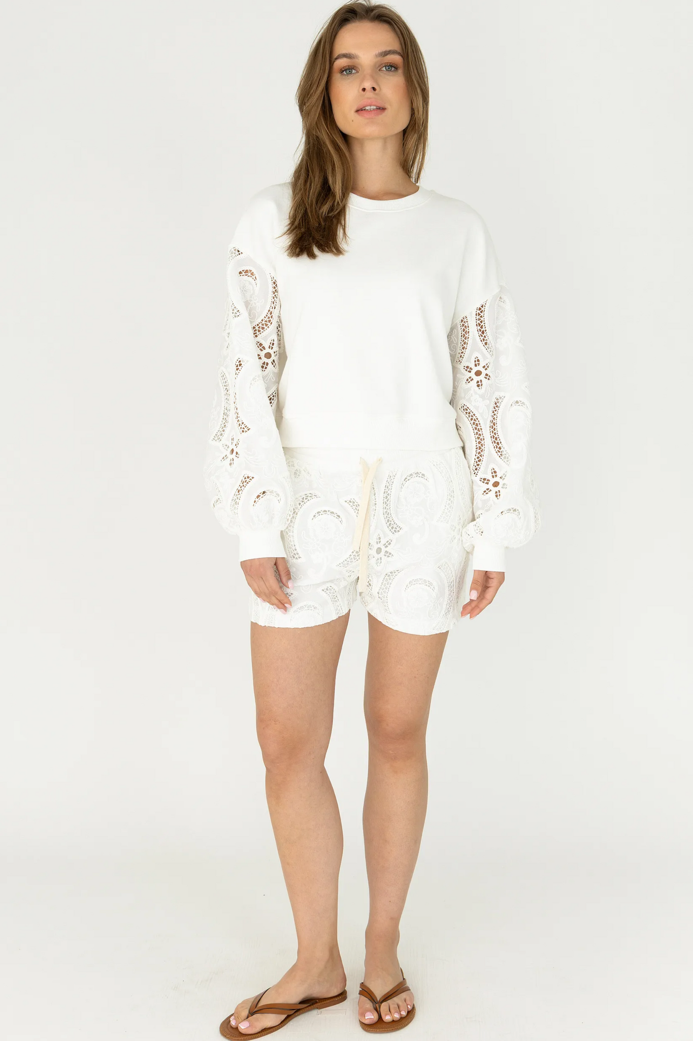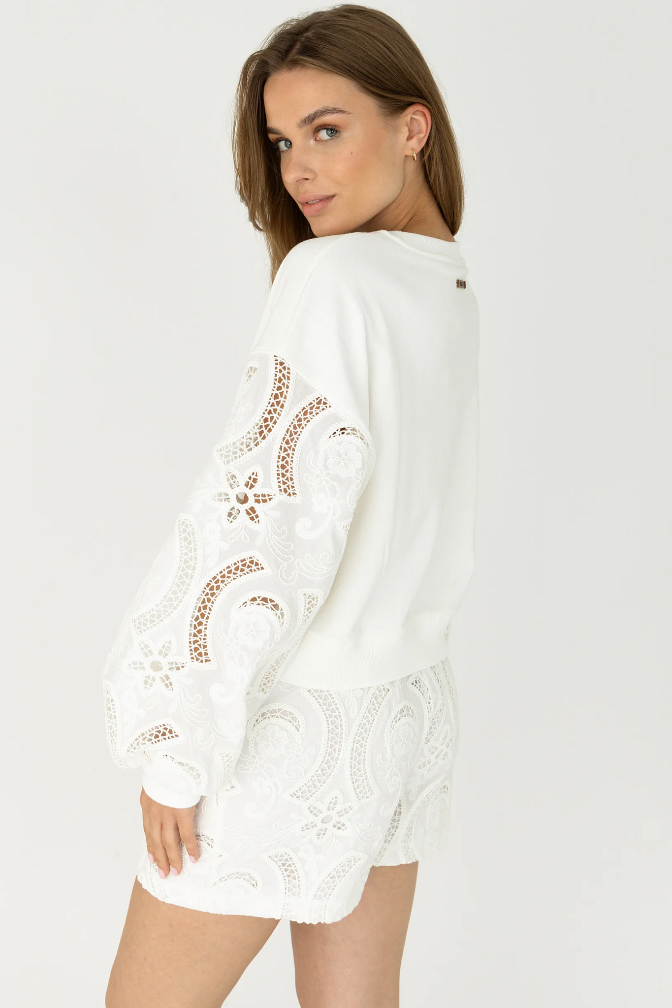 De Lacie Sweater van Moscow in Off White is een zomerse sweater met ronde hals en een comfortabele, normale pasvorm. De mouwen zijn voorzien van subtiele broderiedetails, terwijl ribboorden aan de zoom en manchetten voor een nette afwerking zorgen. Gemaakt van zachte katoen, ideaal voor lichte layering op koelere dagen. Combineer met jeans, rokken of shorts voor een stijlvolle, casual look.