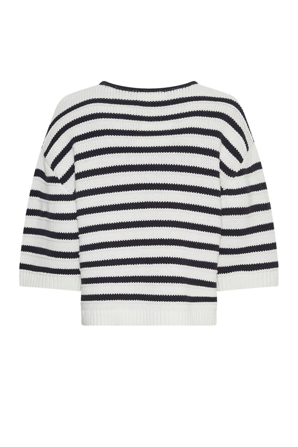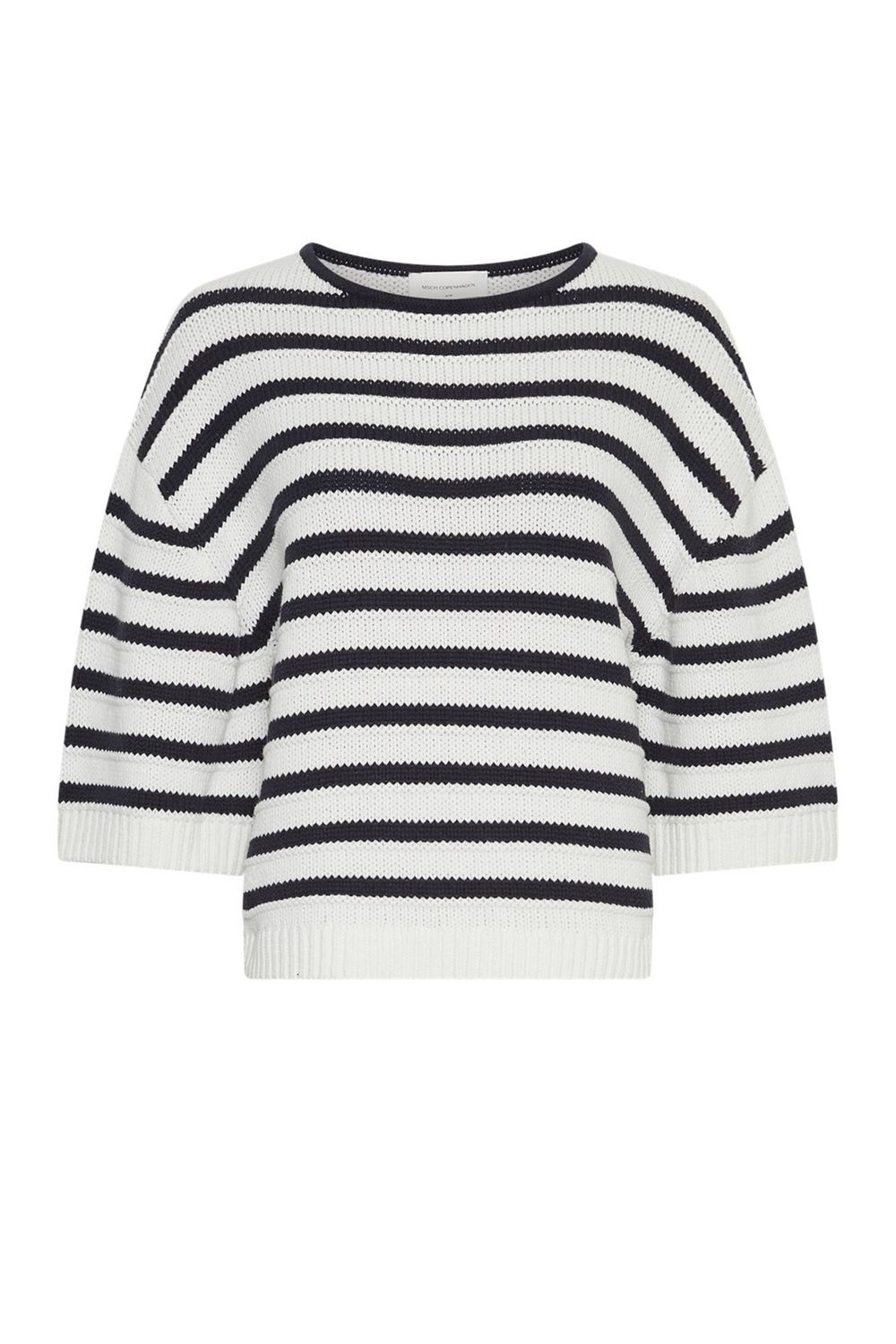 De pullover van het merk Moss Copenhagen is een grofgebreide trui met een comfortabele pasvorm. De trui heeft een ronde halslijn, driekwart mouwen en een streeppatroon in blauw en wit.