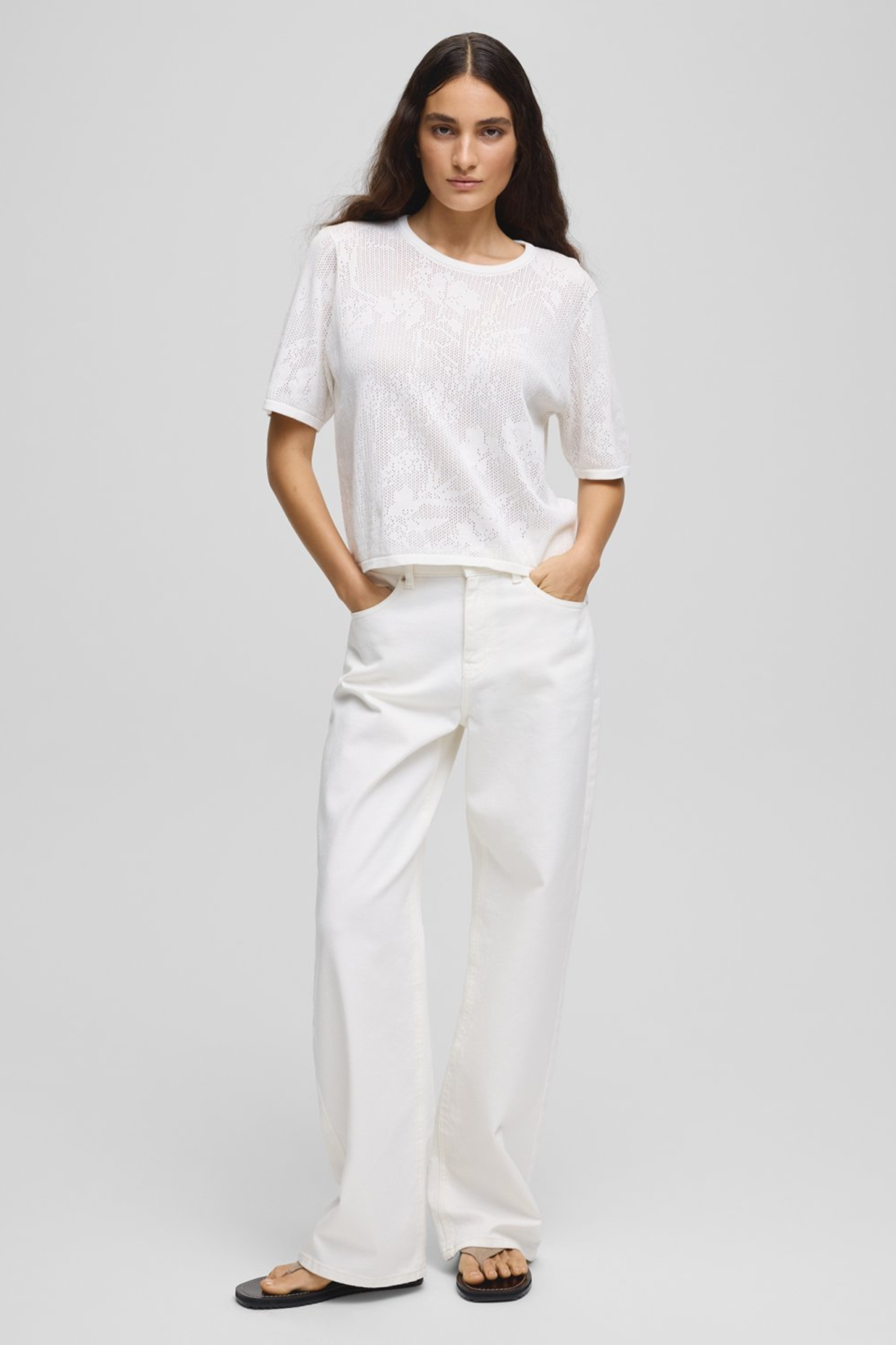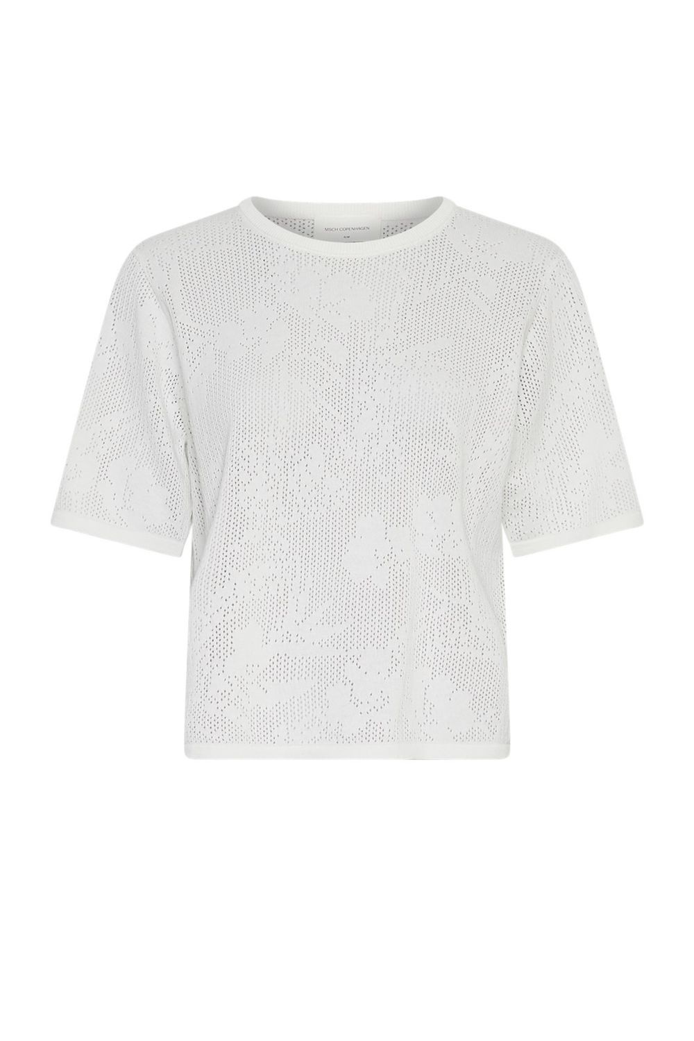 De pullover van het merk Moss Copenhagen is een luchtig shirt met een opengewerkte structuur. Het model heeft korte mouwen en een comfortabele pasvorm, perfect voor warmere dagen.