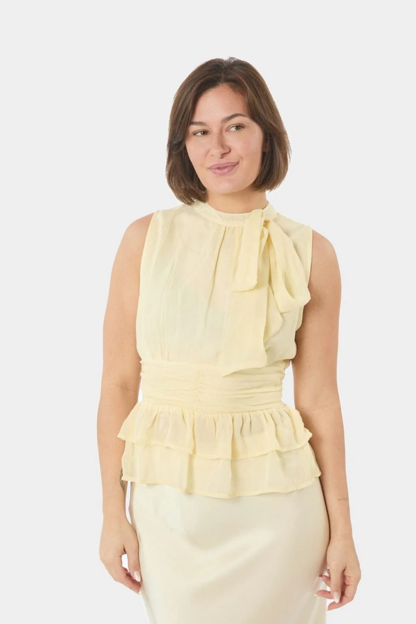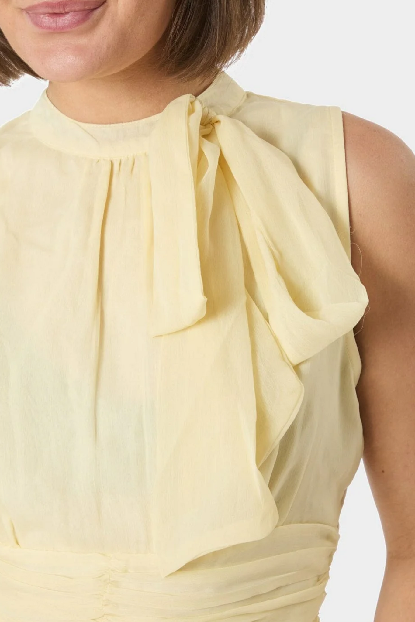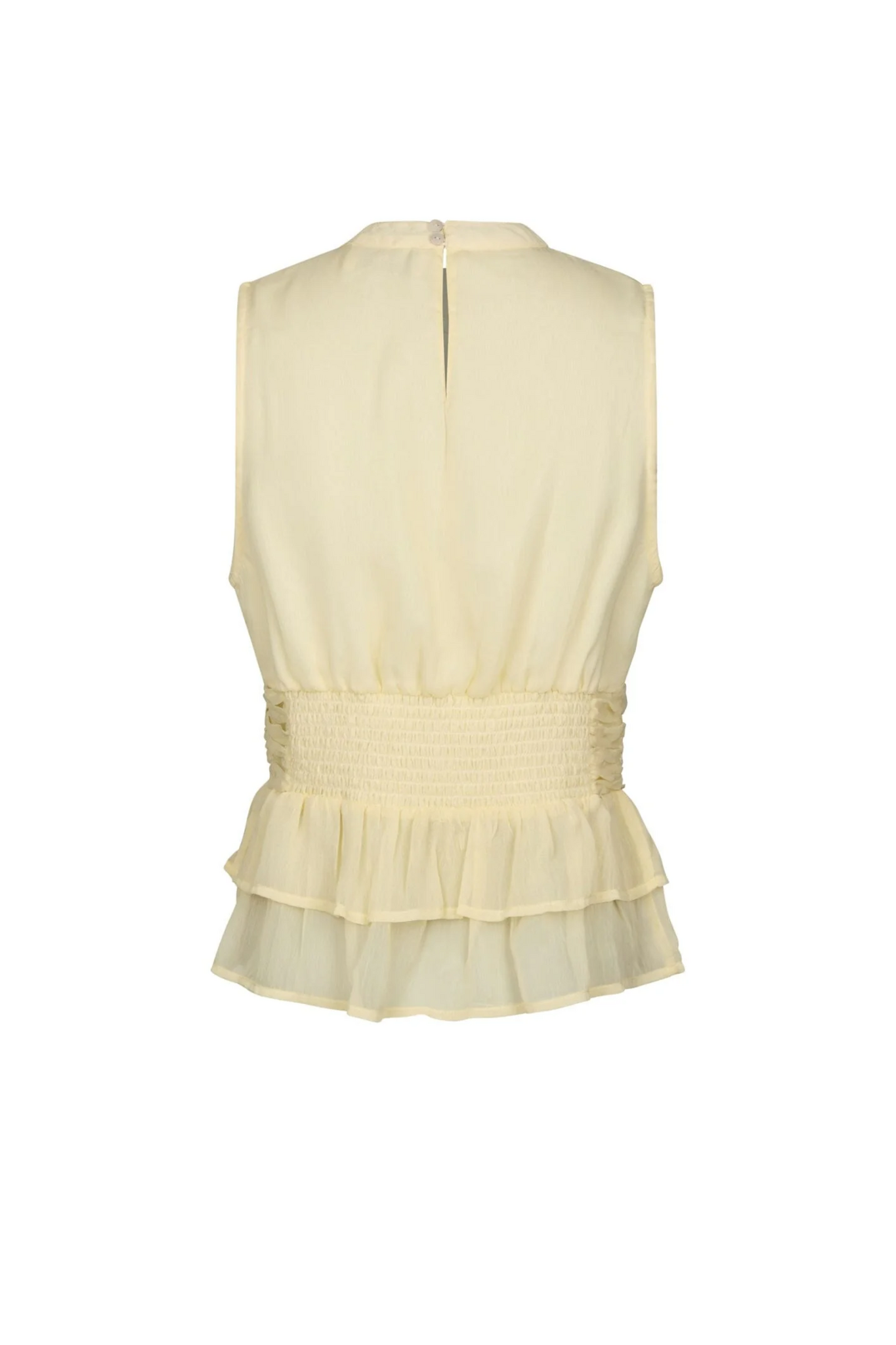 De Neo Noir Ansol Solid Chiffon Top in Light Yellow is een romantische, mouwloze top met een verfijnde uitstraling. Deze lichtgele top is vervaardigd uit luchtig chiffon en valt op door de elegante ruches aan de onderzijde en de charmante strik bij de halslijn. De top is praktisch ontworpen met een knoopsluiting aan de achterzijde en een elastische tailleband voor een flatterende pasvorm die het silhouet accentueert.