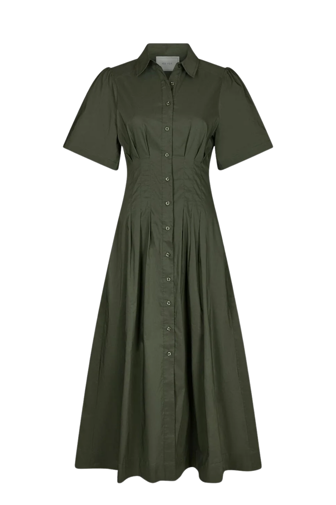 De Baia Poplin Dress van Neo Noir in Army is een getailleerde jurk met een blousekraag en een knoopsluiting over de volledige lengte. De jurk heeft korte mouwen met een subtiel pofeffect en een A-lijn rok met plooidetails in de taille, wat zorgt voor een vrouwelijk silhouet.