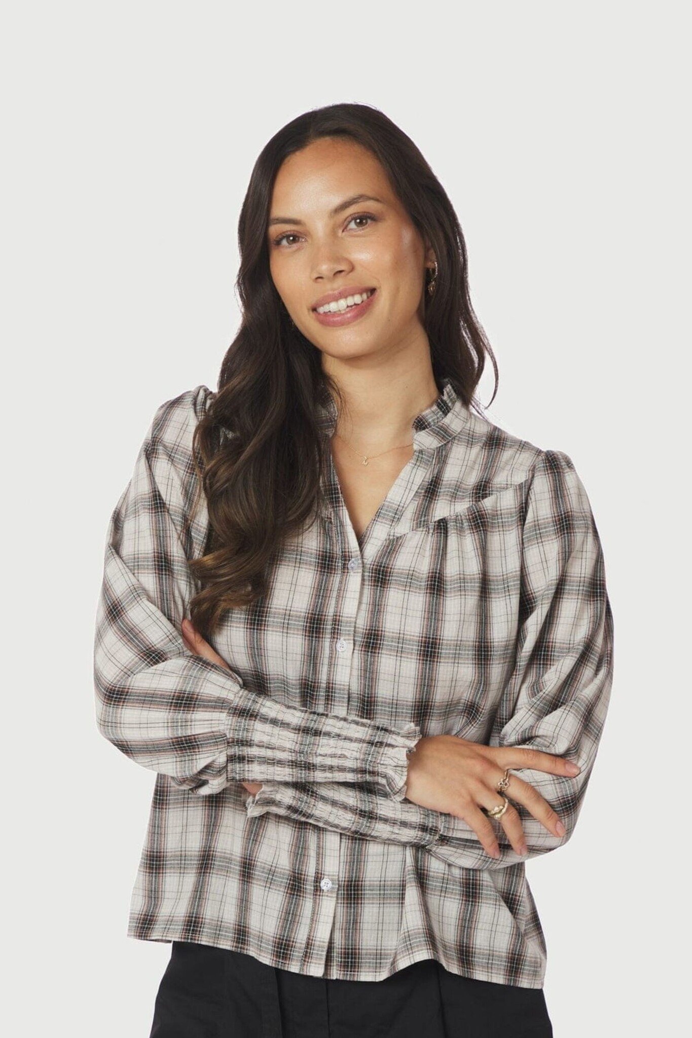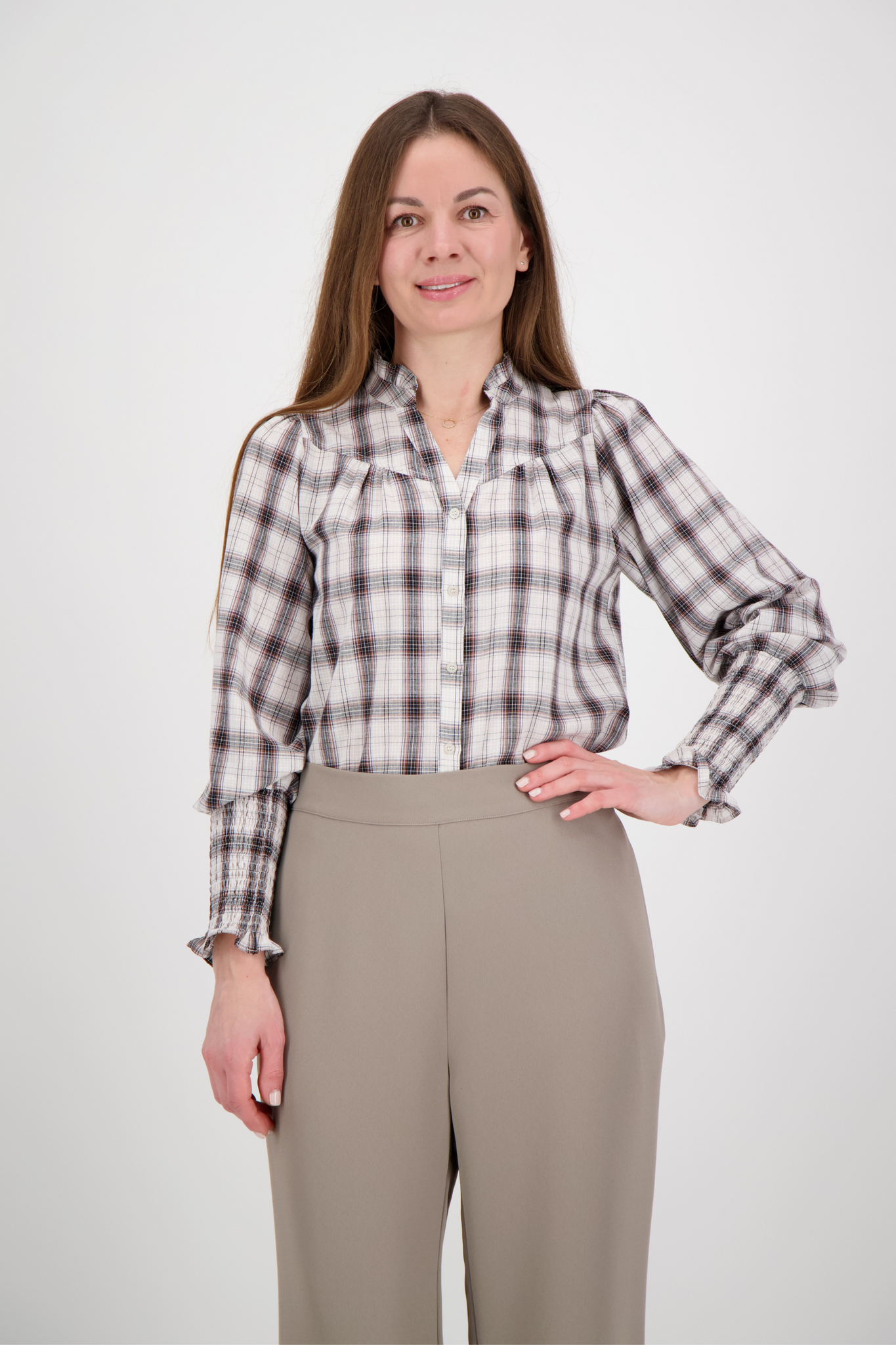 De Camisa Big Check Blouse van Neo Noir is een stijlvolle geruite blouse in off-white met zwarte en bruine ruiten. De blouse is gemaakt van 100% katoen en heeft een vrouwelijke V-hals met ruches. Het model is voorzien van een knoopsluiting aan de voorzijde en lange mouwen met elastiek bij de boorden voor een subtiel gepoft effect.
