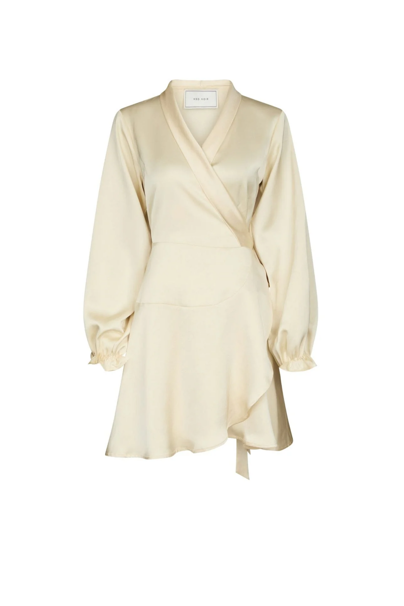 De Colbie Heavy Sateen Dress van Neo Noir in Light Yellow is een korte jurk uitgevoerd in een zware satijnen stof. De jurk heeft een V-hals, lange mouwen en een overslagdesign met een strikceintuur in de taille, wat zorgt voor een elegant en vrouwelijk silhouet.