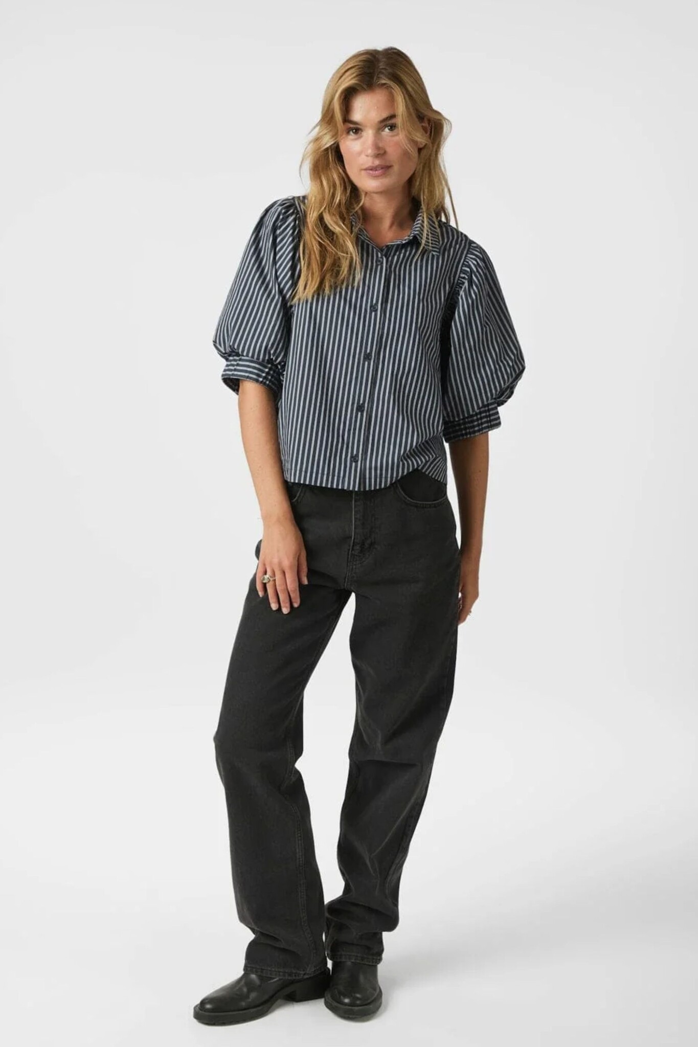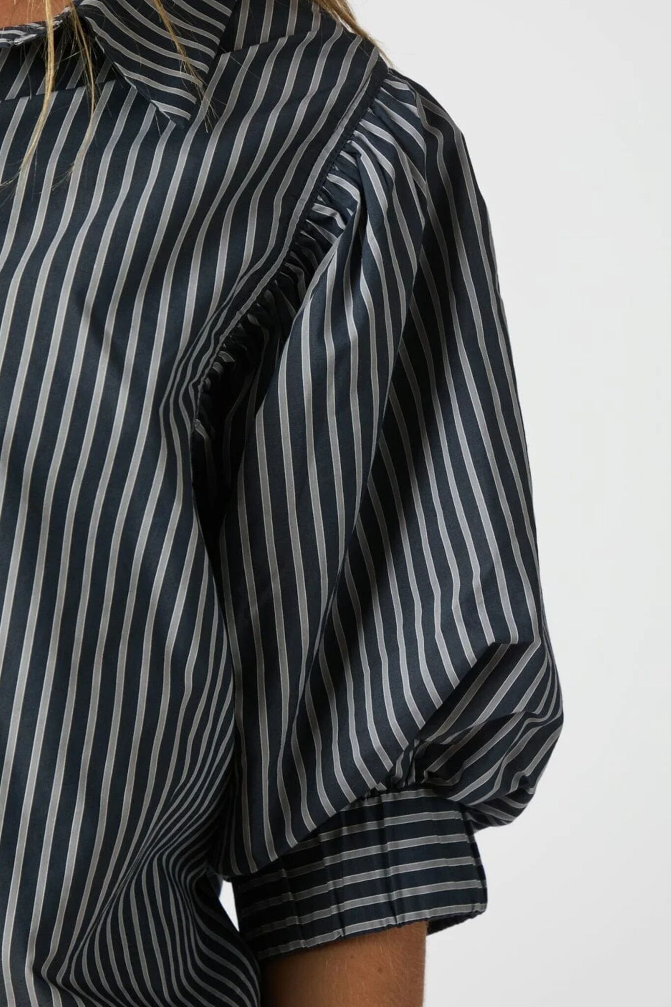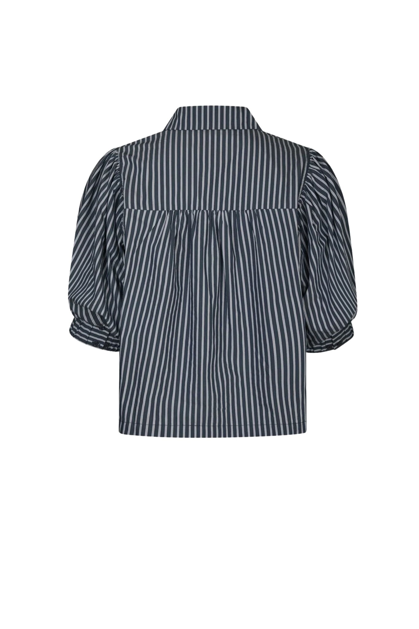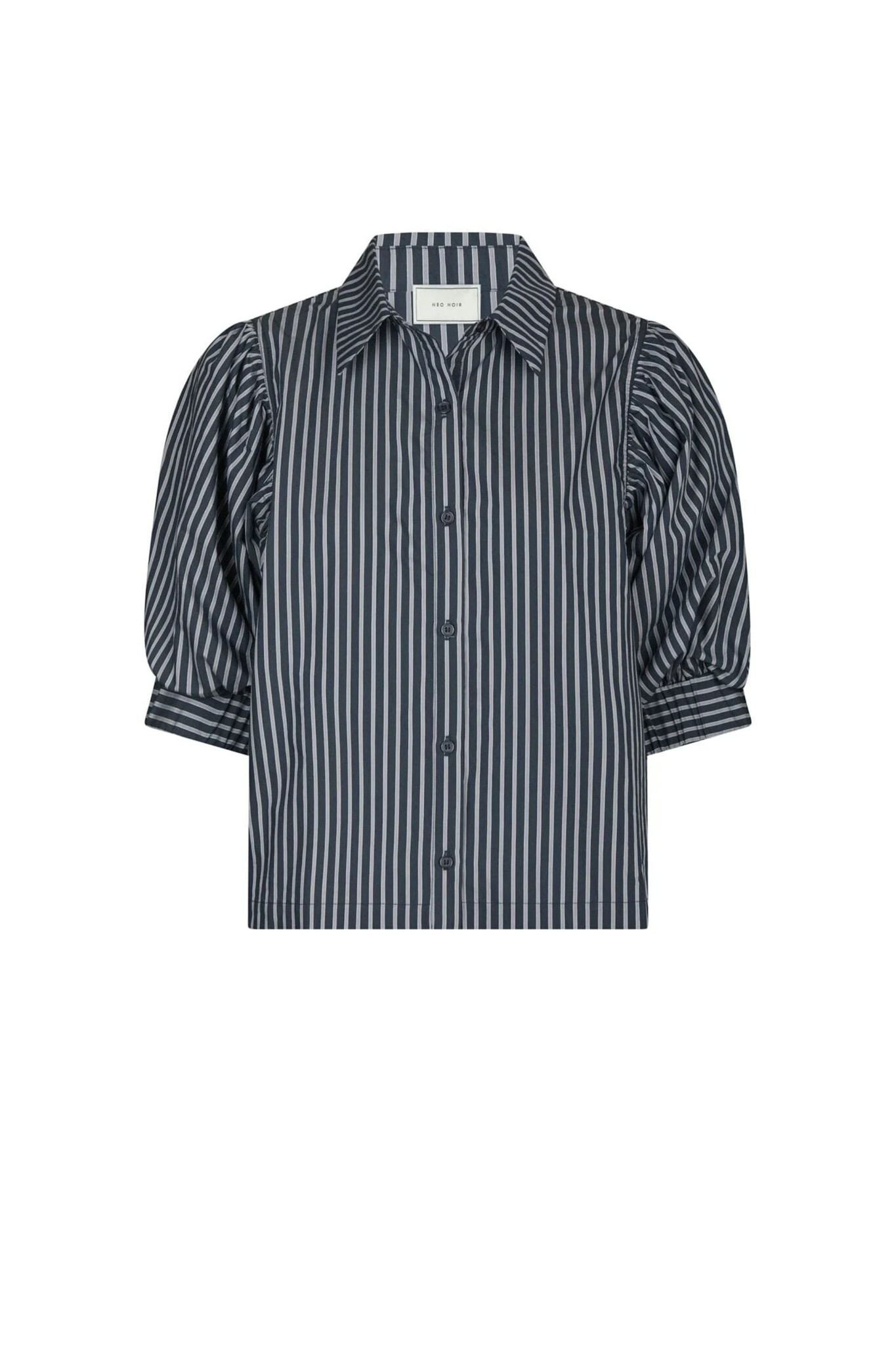De Neo Noir Etta Stripe Shirt in Navy is een stijlvolle blouse met een klassiek verticaal streeppatroon in marineblauw en wit. Het model valt op door de volumineuze ellebooglange pofmouwen met brede manchetten, wat een modern accent geeft aan de tijdloze look. De blouse is voorzien van een nette kraag en een volledige knoopsluiting aan de voorzijde, waardoor het een veelzijdig item is voor zowel een zakelijke als casual outfit.