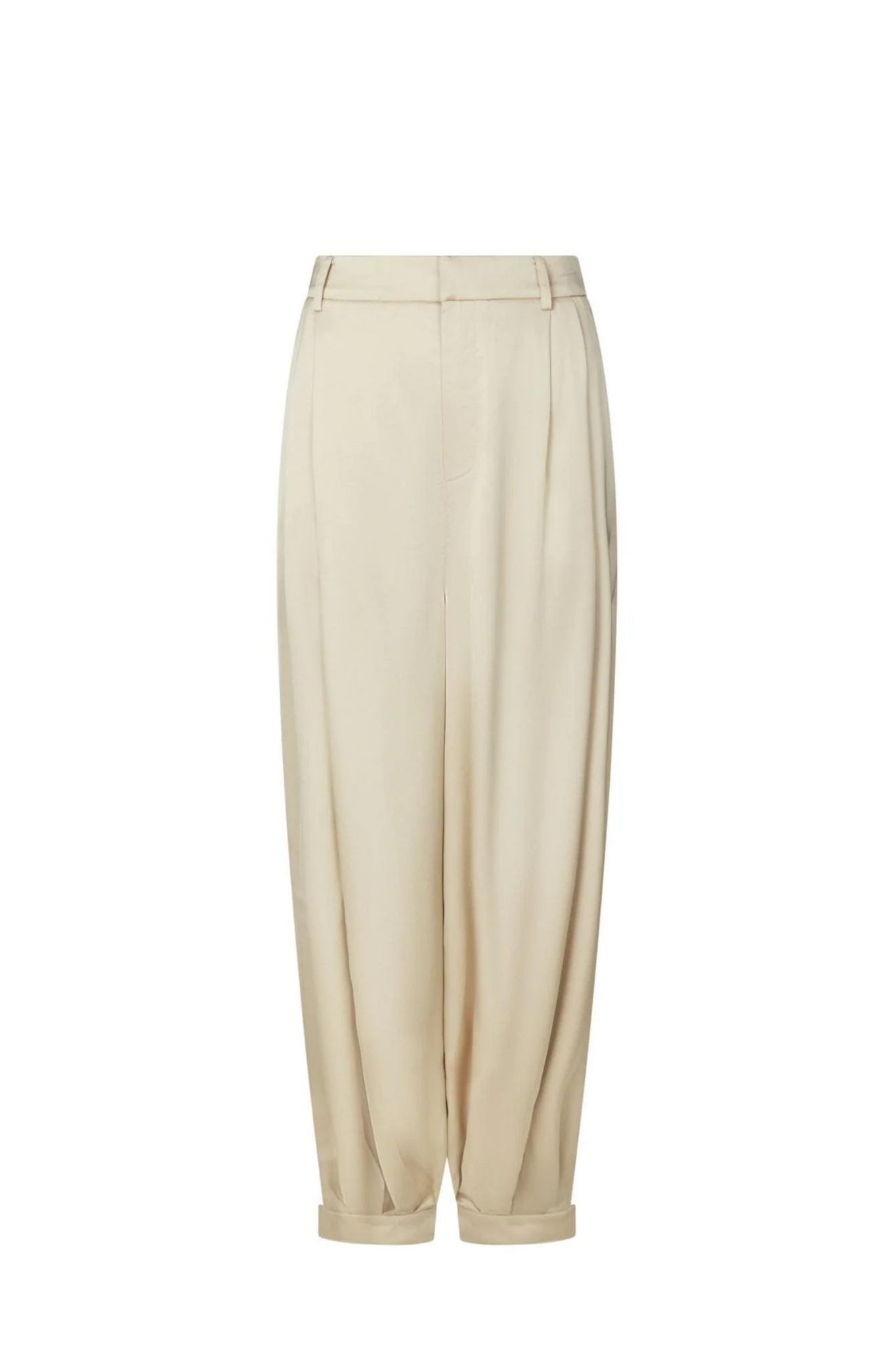 De Neo Noir Fayla Drapy Satin Balloon Pants in Dark Sand is een modieuze en verfijnde broek met een luxueuze satijnlook. Dit model kenmerkt zich door een trendy ballon-pasvorm met plooien bij de taille en manchetten onderaan de pijpen voor een volumineus effect. De broek is praktisch uitgevoerd met riemlussen, steekzakken aan de voorzijde en decoratieve sierzakken aan de achterkant, wat samen met de glanzende zandkleurige stof zorgt voor een chique uitstraling.