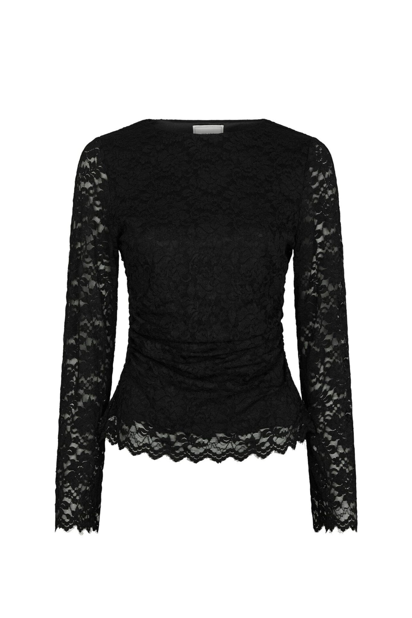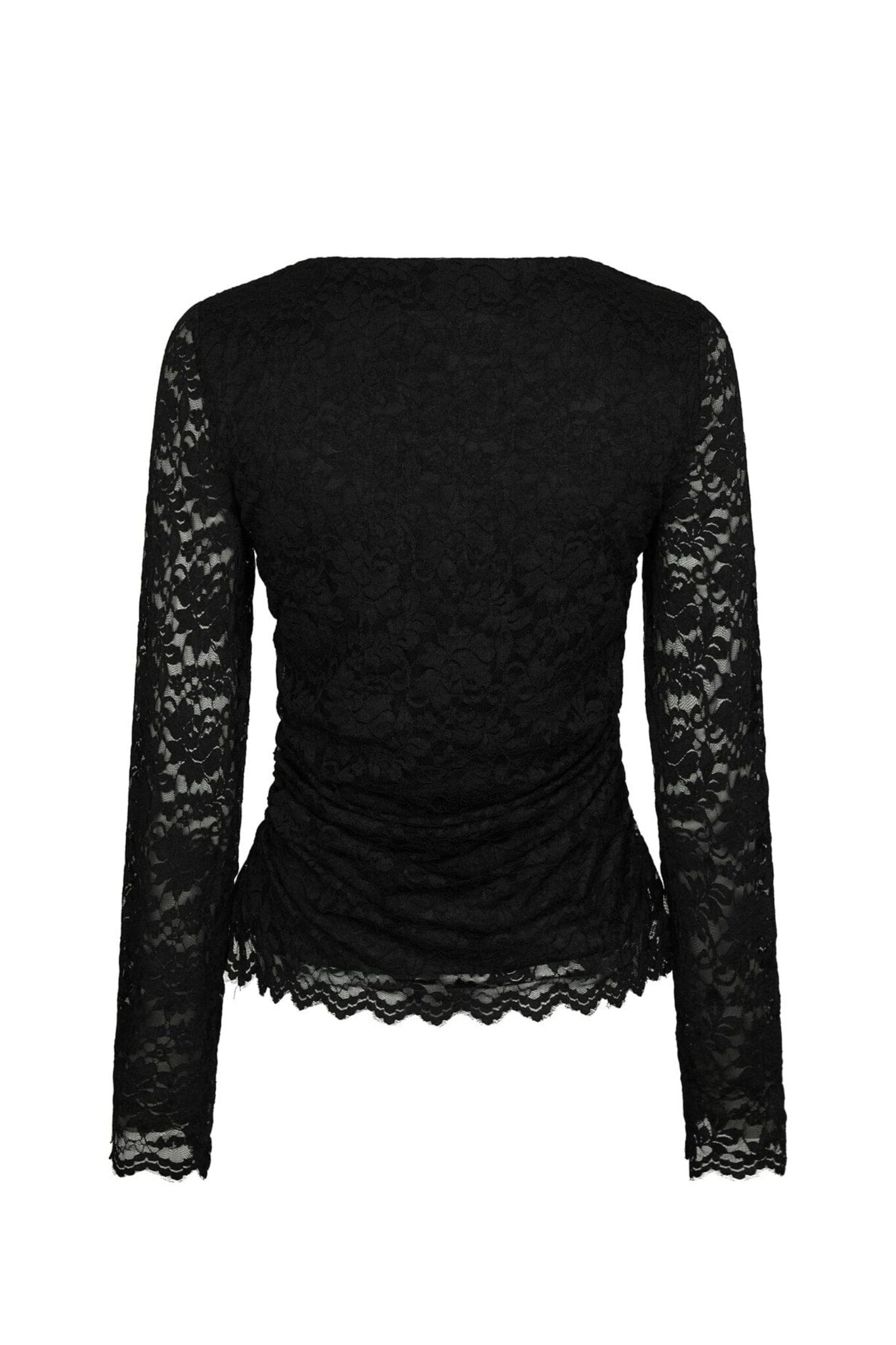 De Lenida Lace Blouse van Neo Noir is een elegante, zwarte kanten top met een luxe uitstraling. Het model heeft een aangesloten pasvorm, een klassieke ronde hals en lange mouwen. De blouse is bij de taille getailleerd, wat zorgt voor flatterende plooien die het vrouwelijk silhouet prachtig accentueren. Perfect voor een feestelijke gelegenheid of een stijlvol avondje uit.