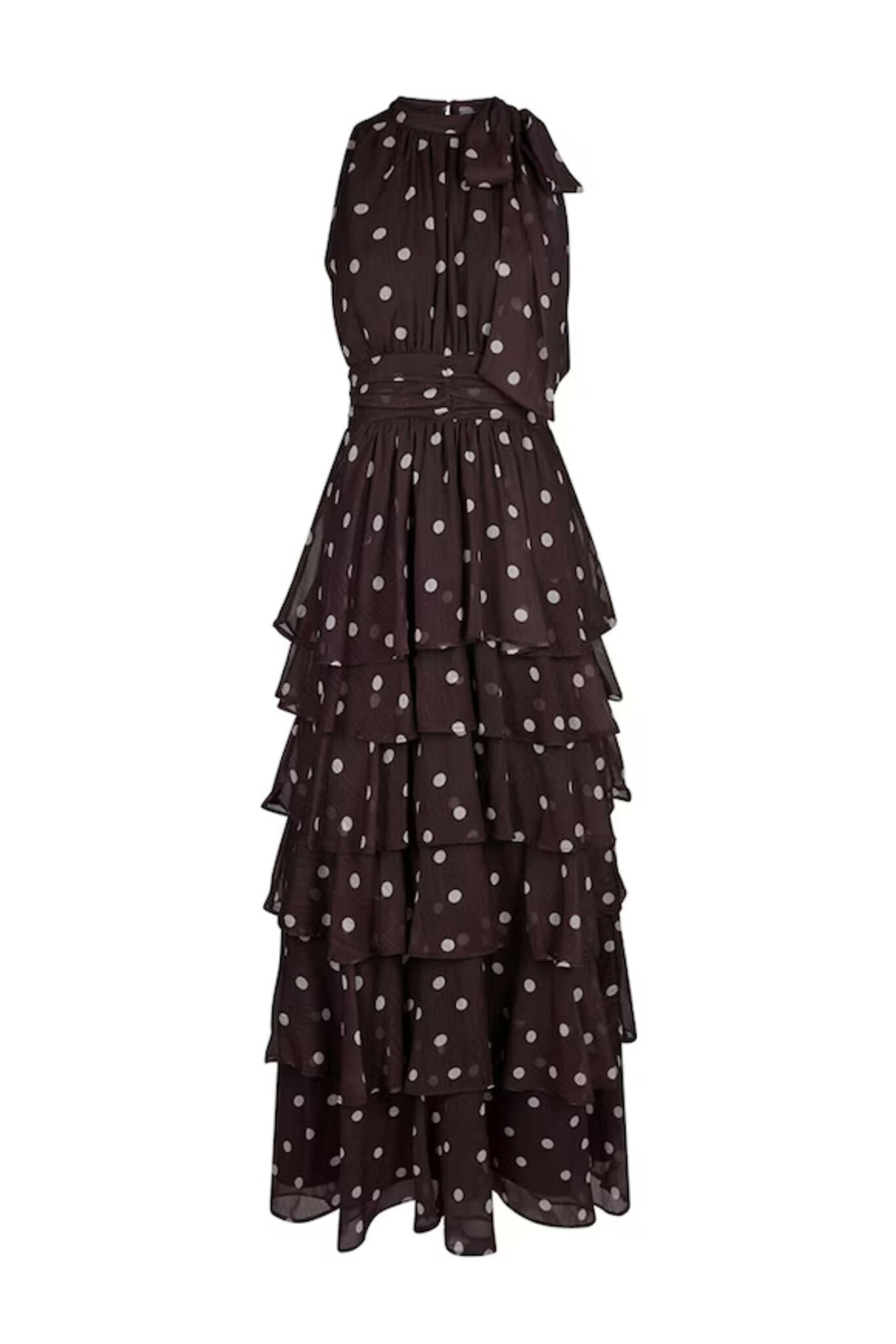 De Marli Big Dot Dress van Neo Noir in Brown is een elegante lange jurk van luchtige chiffon. De jurk heeft een ronde hals met striklus en een knoopsluiting aan de achterkant. De elastische, gesmokte taille aan de achterzijde zorgt voor een comfortabele pasvorm. De wijd uitlopende rok is opgebouwd uit meerdere lagen met volants, wat zorgt voor een soepel en vrouwelijk silhouet.