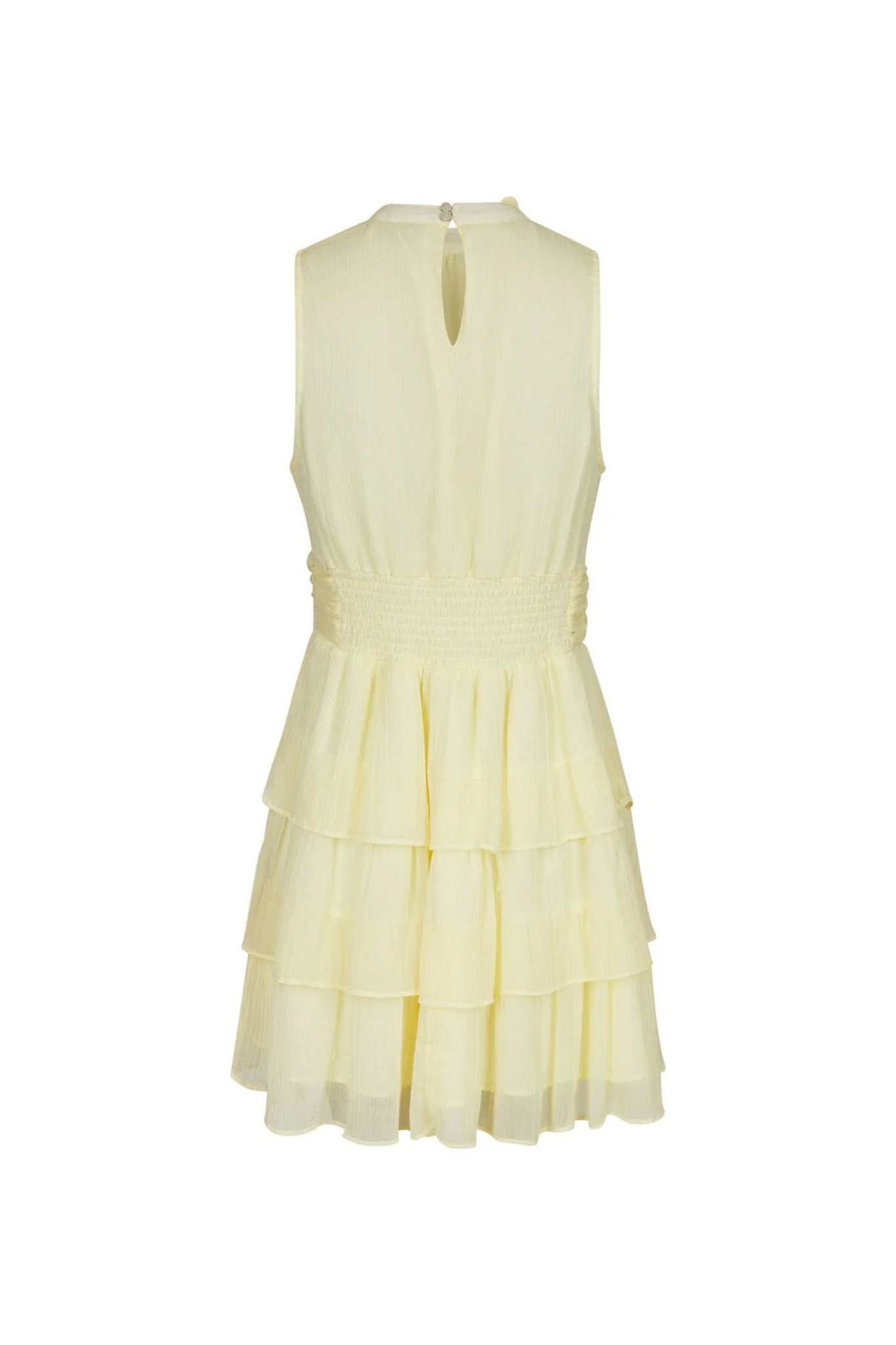 De May Solid Chiffon Dress van Neo Noir in Light Yellow is een luchtige mouwloze jurk met een hoge hals en een dubbele knoopsluiting aan de achterkant. De halslijn is voorzien van een strikceintuur en de achterkant is gesmokt met elastiek voor een comfortabele pasvorm. De gelaagde mini rok met ruffles zorgt voor een speels en vrouwelijk effect.