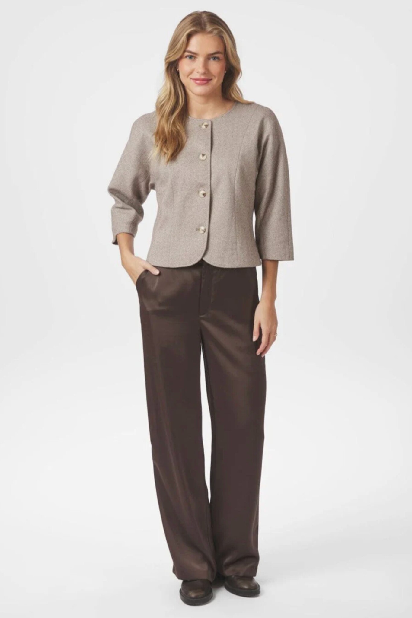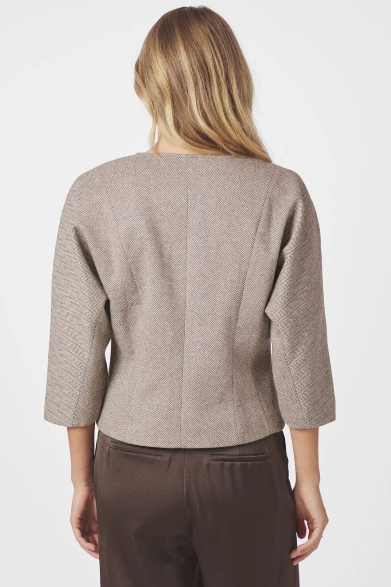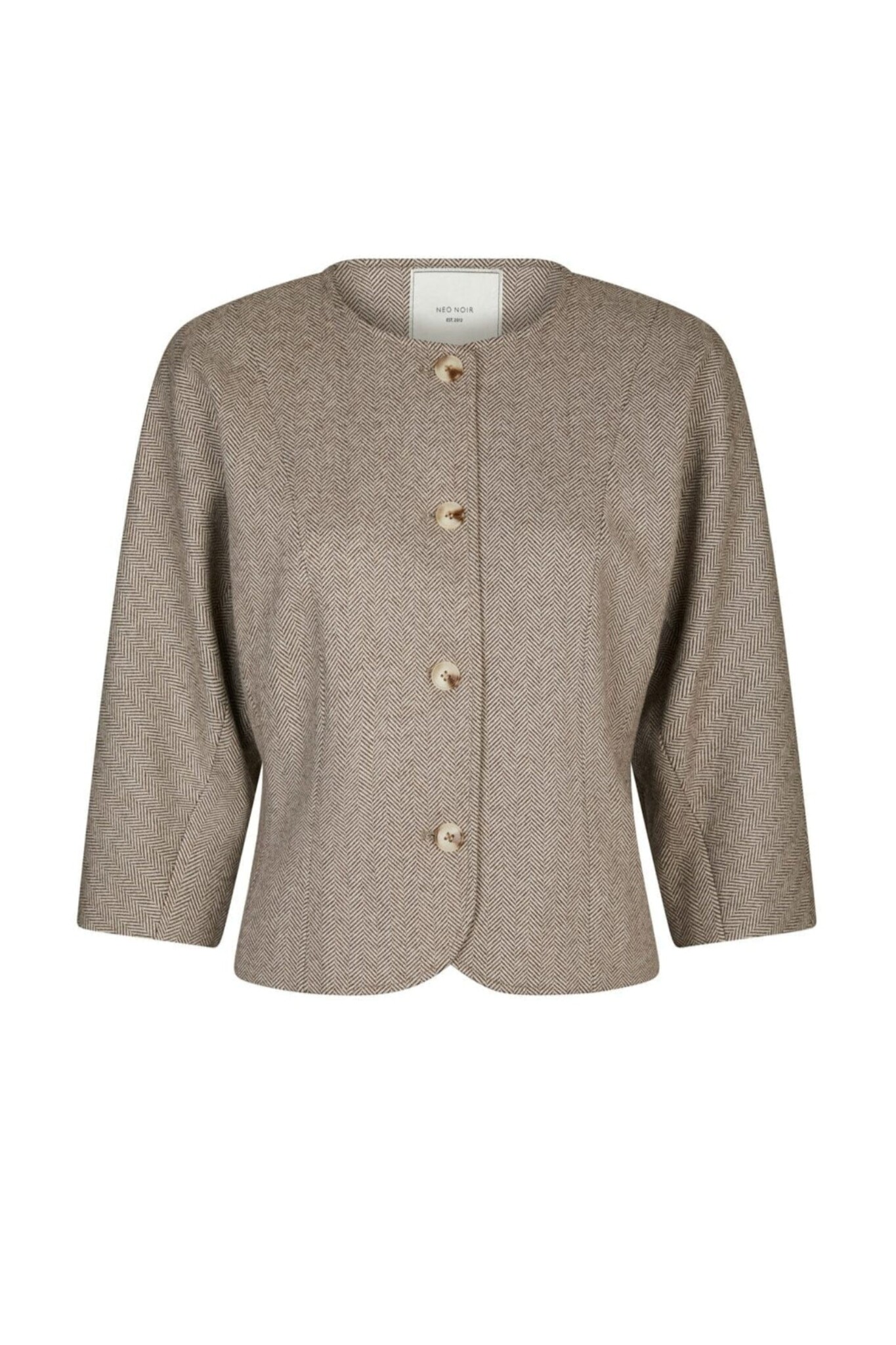 De Mesto Light Herringbone Jacket van Neo Noir is een stijlvol jasje in de kleuren wit en bruin. Het item heeft een getailleerde pasvorm, een ronde hals en driekwart mouwen met een wijde snit. De verfijnde visgraatpatroon en de doorlopende knoopsluiting maken dit een elegant en tijdloos item.