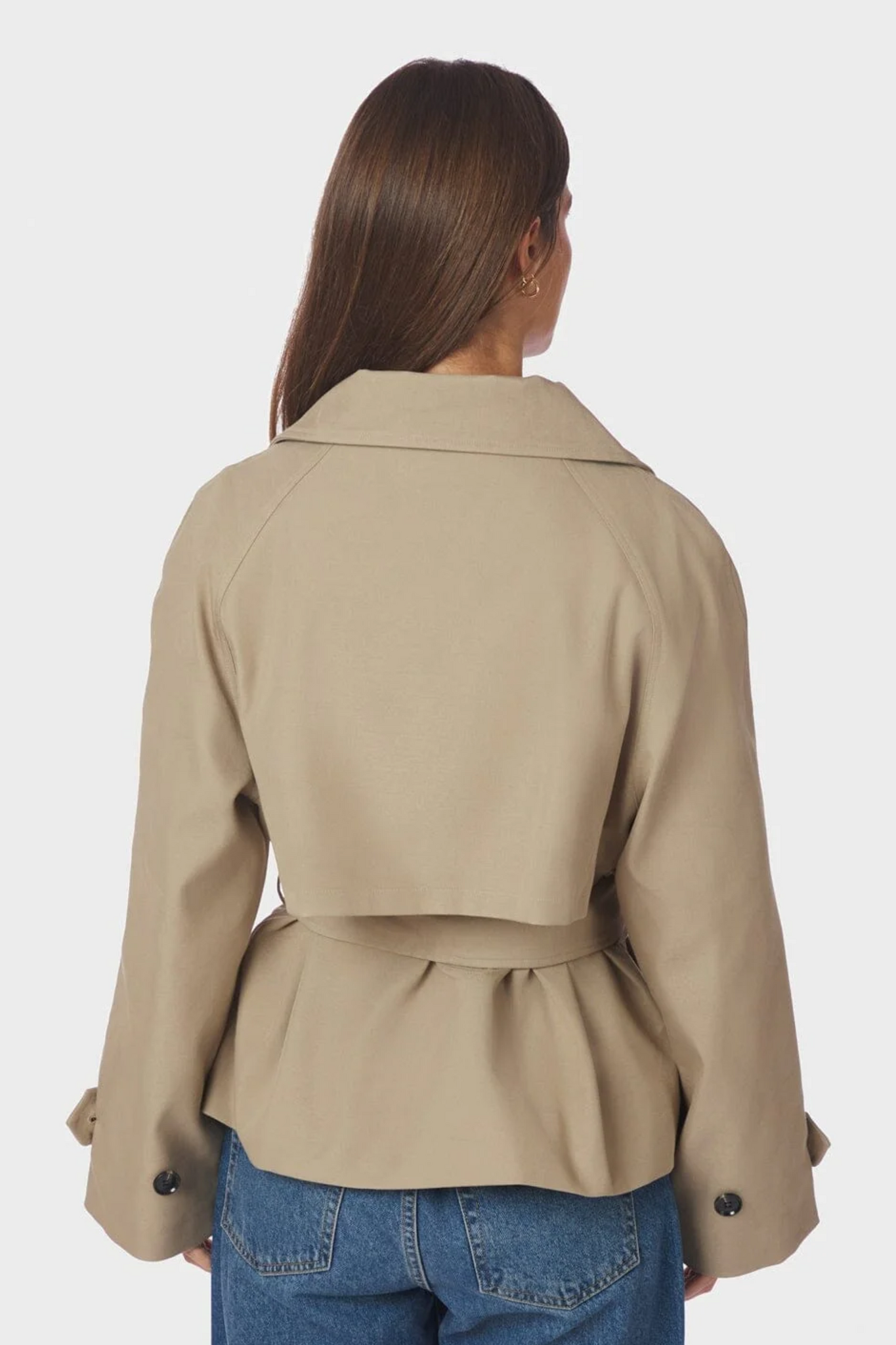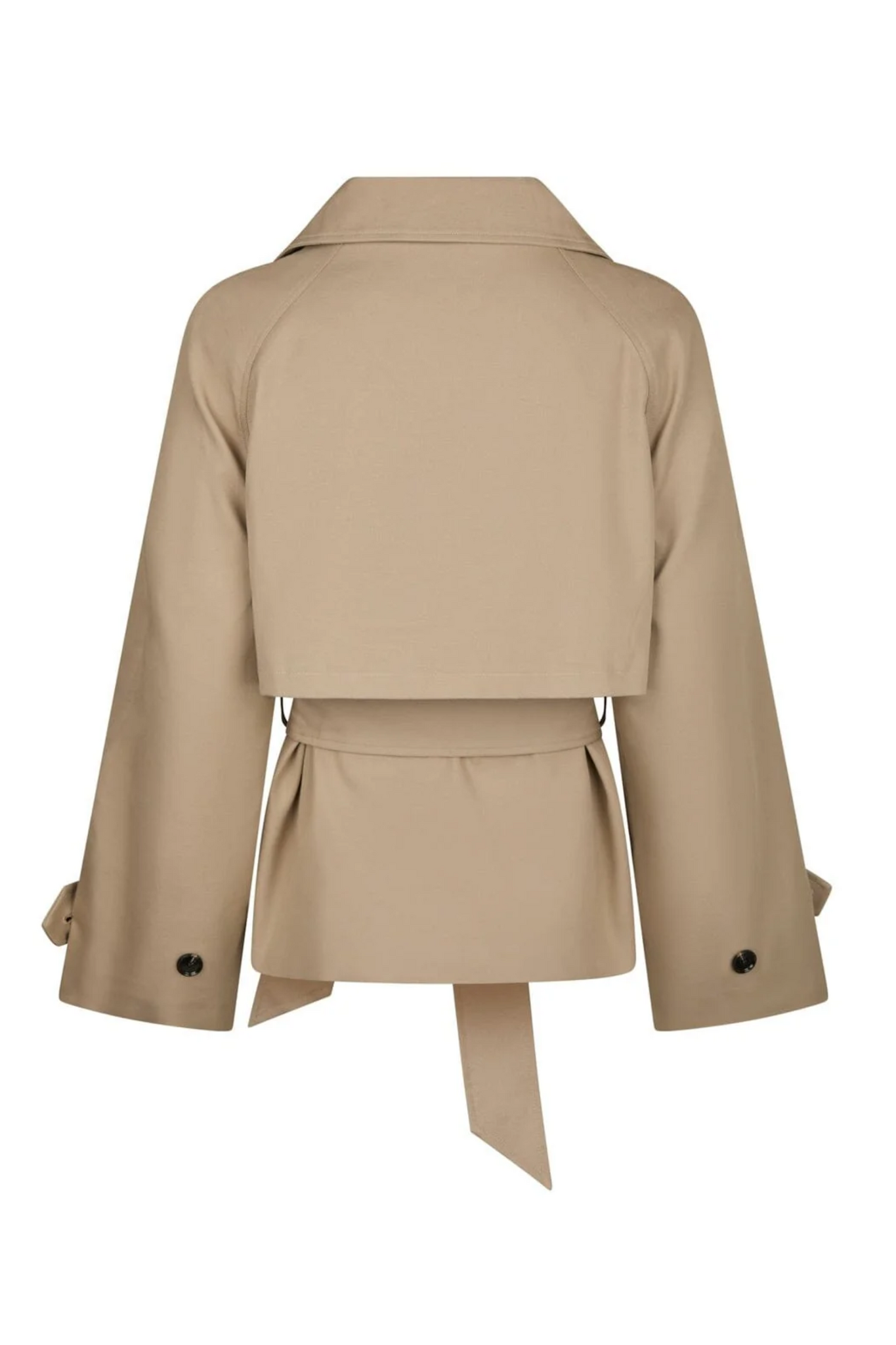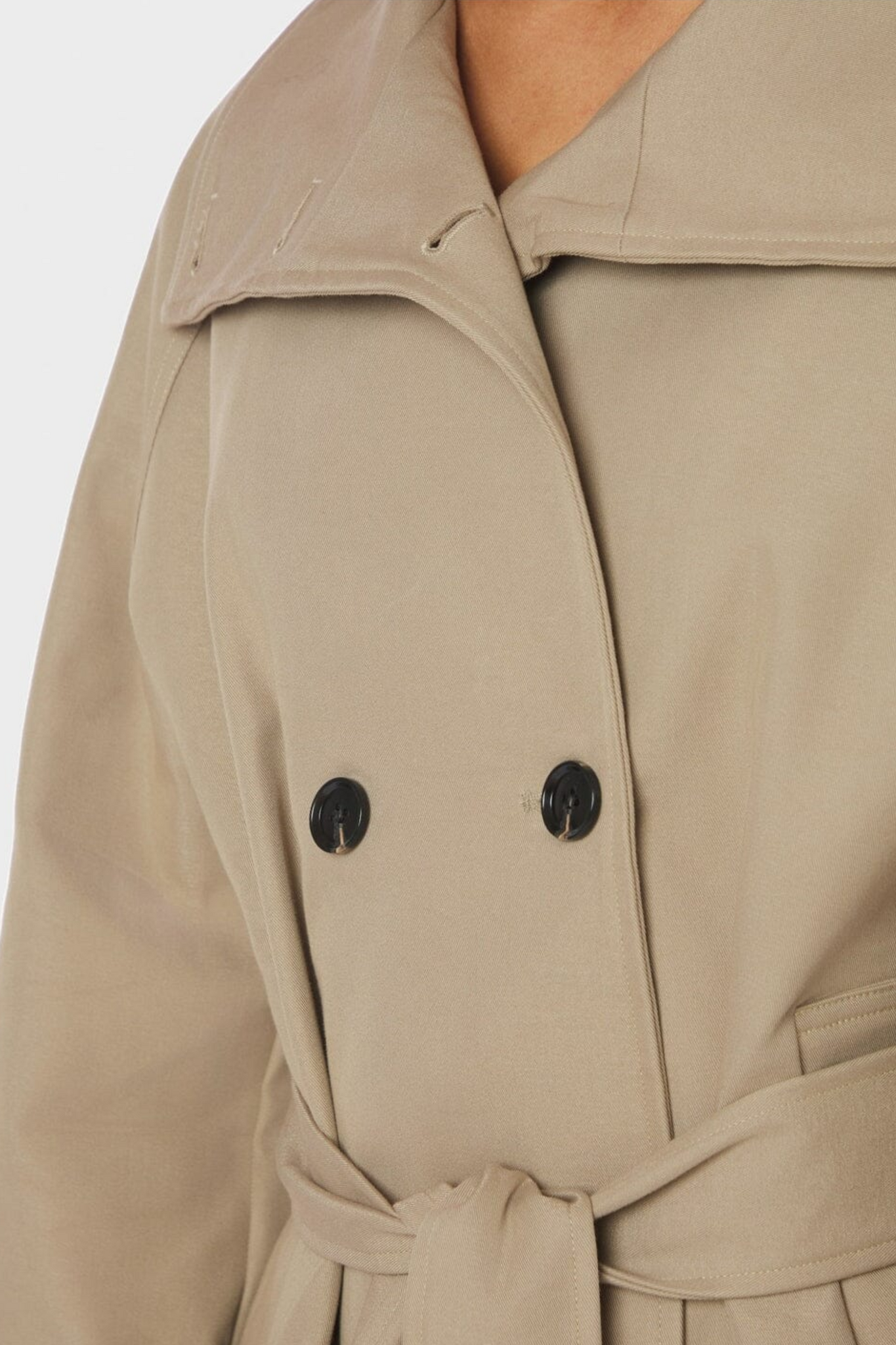 De Munet Trench Jacket van Neo Noir in Sand is een stijlvolle jas met een hoge kraag die zowel omhoog gedragen kan worden als omgeslagen. De jas heeft een dubbele knoopsluiting, lange mouwen en een bijpassend ceintuur in de taille voor een mooie taillering. Het model is gevoerd voor extra comfort en een nette afwerking.