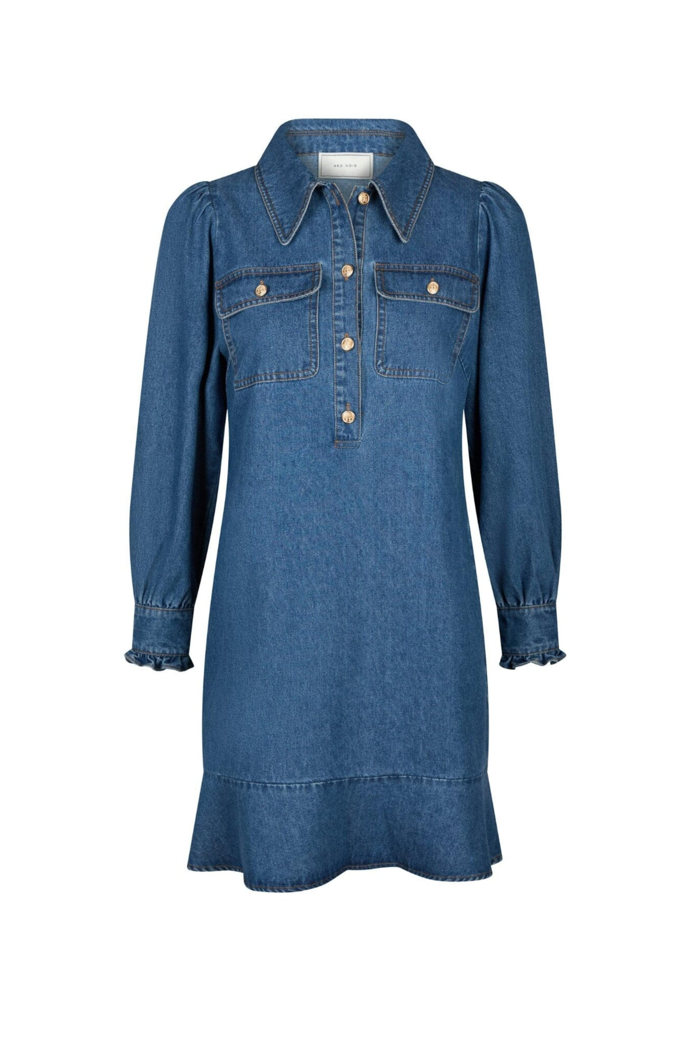 De Nikko Denim Dress van Neo Noir is een stijlvolle denim jurk in de kleur blauw. De jurk heeft een klassieke hemdkraag, lange pofmouwen met aangesloten manchetten en een volledige knoopsluiting aan de voorkant. De aansluitende pasvorm wordt speels afgewerkt met subtiele ruffles, wat zorgt voor een vrouwelijke touch. Perfect te combineren met laarzen of sneakers voor een moderne look.