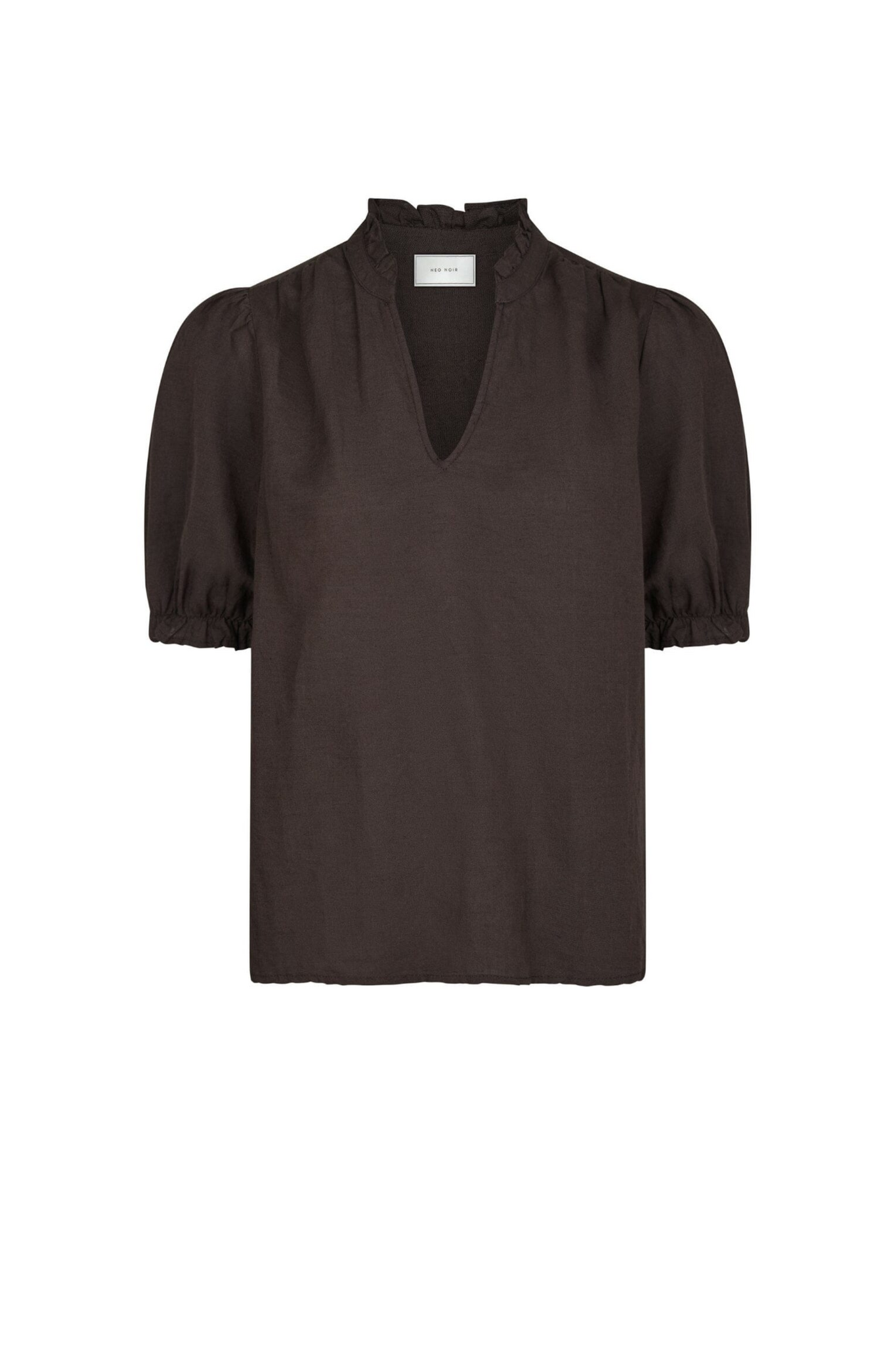 De Neo Noir Odesa Linen Blouse in Dark Brown is een luchtige en verfijnde top, ideaal voor een stijlvolle zomerlook. Deze blouse is vervaardigd uit een hoogwaardige linnenmix en valt op door de diepe, donkerbruine kleur en de vrouwelijke details. Het ontwerp is voorzien van een elegante V-hals met een klein rufflerandje langs de kraag en korte pofmouwen die zijn afgewerkt met elastische boorden voor een volumineus effect.