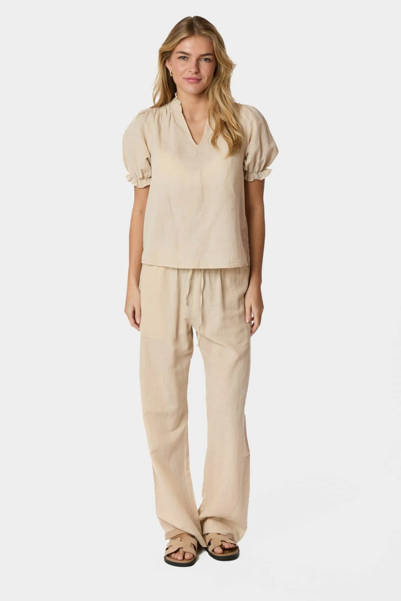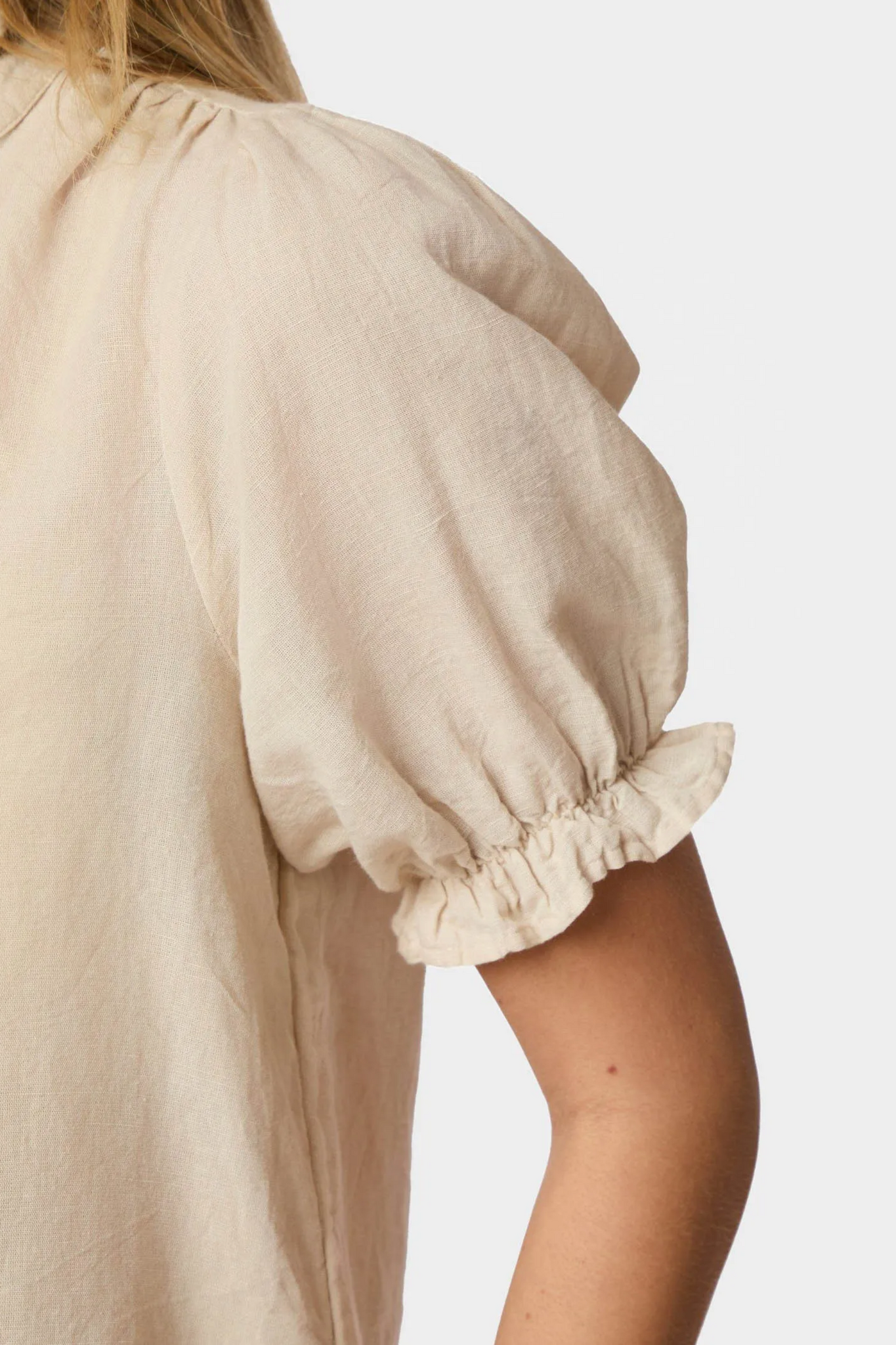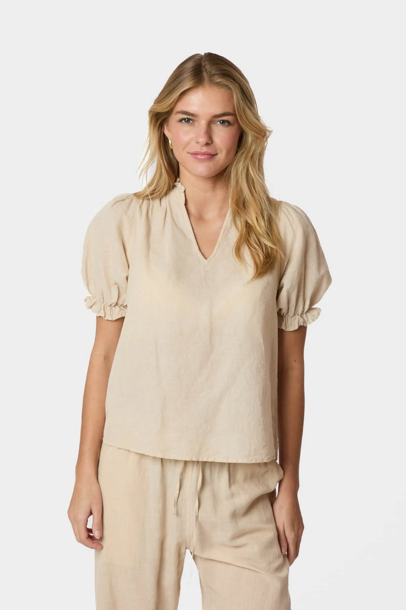 De Odesa Linen Blouse van Neo Noir in Sand is een luchtige blouse met een hoge hals en een subtiele V-uitsnede. De korte pofmouwen zijn afgewerkt met een elastische manchet, wat zorgt voor een comfortabele en vrouwelijke pasvorm. Het model is uitgevoerd in linnen en voelt licht en zomers aan.