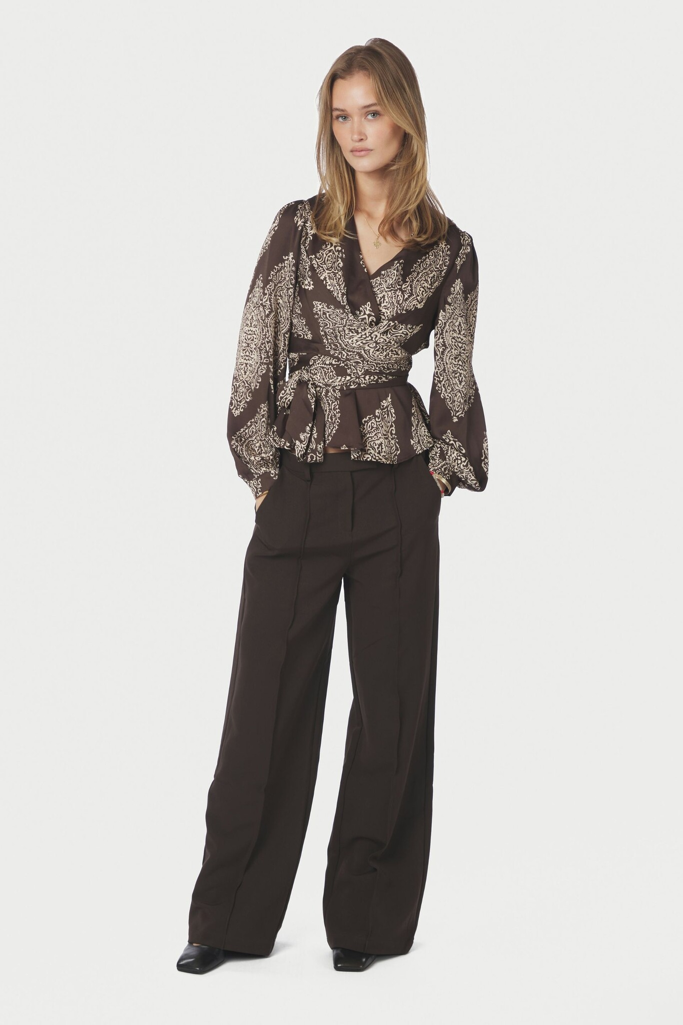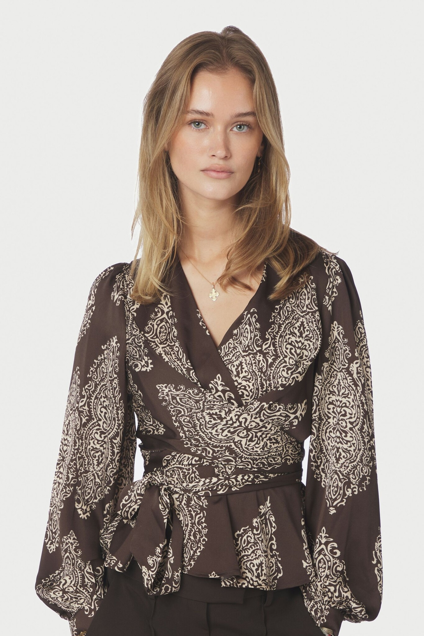 De Neo Noir Rista Paisley Drop Blouse in Dark Brown is een prachtige, vrouwelijke top met een verfijnde paisleyprint in contrastrijke zandtinten. Dit model heeft een flatterende overslagvulling met een V-hals en een elegant strikceintuur in de taille om het vrouwelijke silhouet te accentueren. De lange ballonmouwen en de licht uitlopende roezelrand aan de onderzijde geven de blouse een romantische en luxe uitstraling.