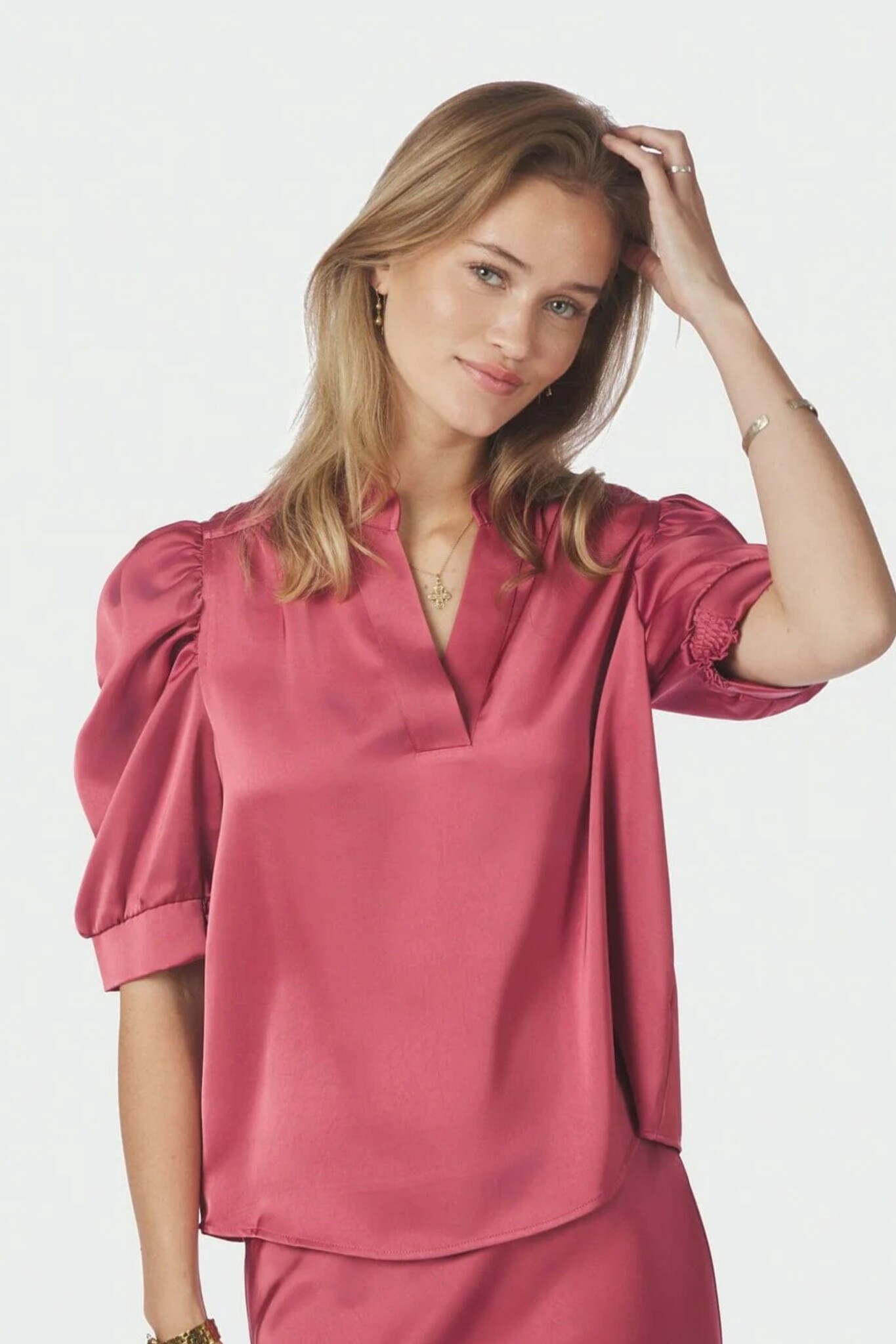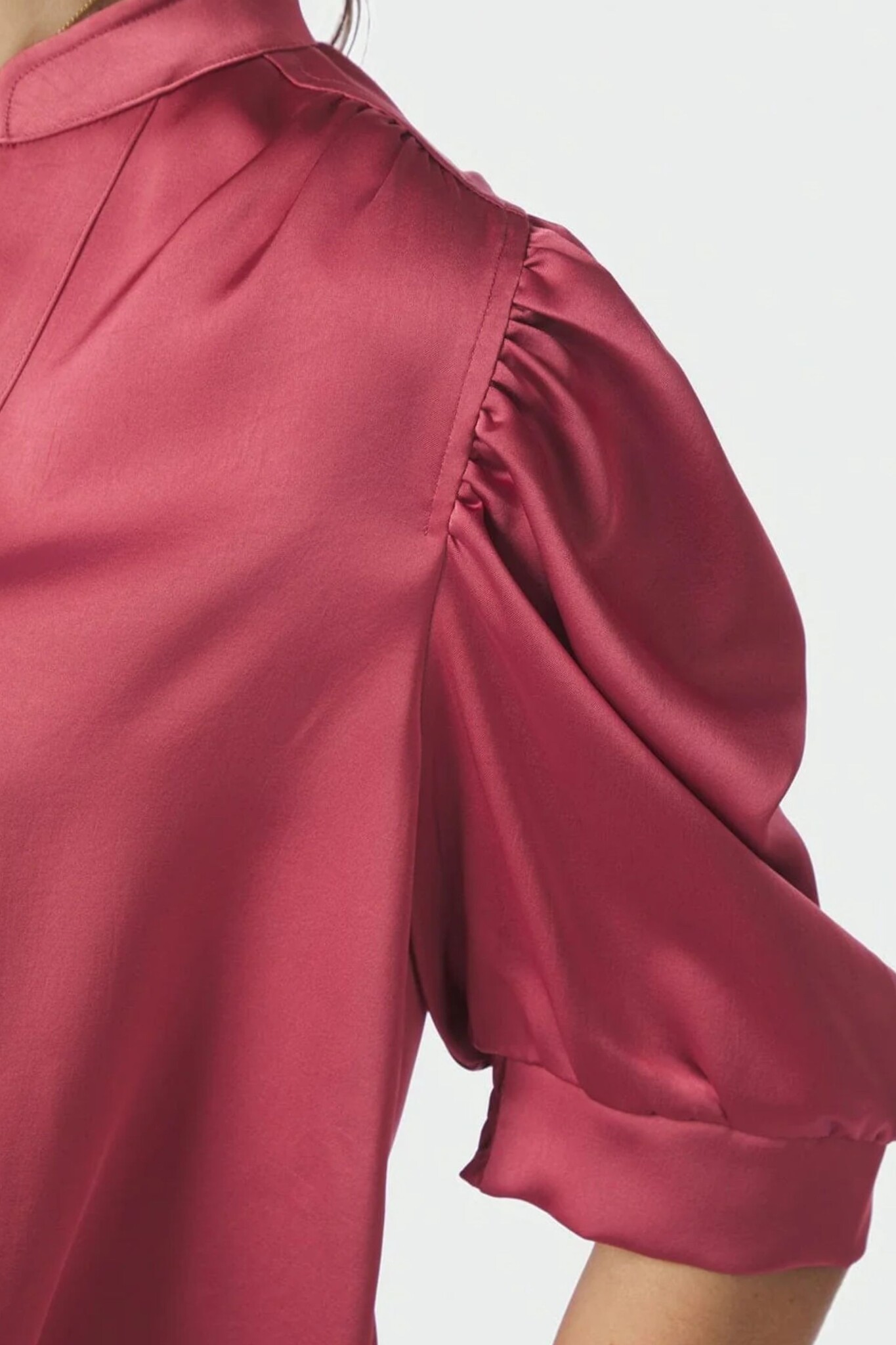 De Neo Noir Roella Heavy Sateen Blouse in Cherry Pink is een luxueuze top vervaardigd uit een zware satijnkwaliteit met een prachtige zijdeglans. Dit model kenmerkt zich door de volumineuze pofmouwen die tot op de elleboog vallen en een elegante V-hals met een opstaande kraag. De diepe kersenroze tint geeft de blouse een krachtige en vrouwelijke uitstraling, ideaal voor een feestelijke gelegenheid of een chique kantoorlook.
