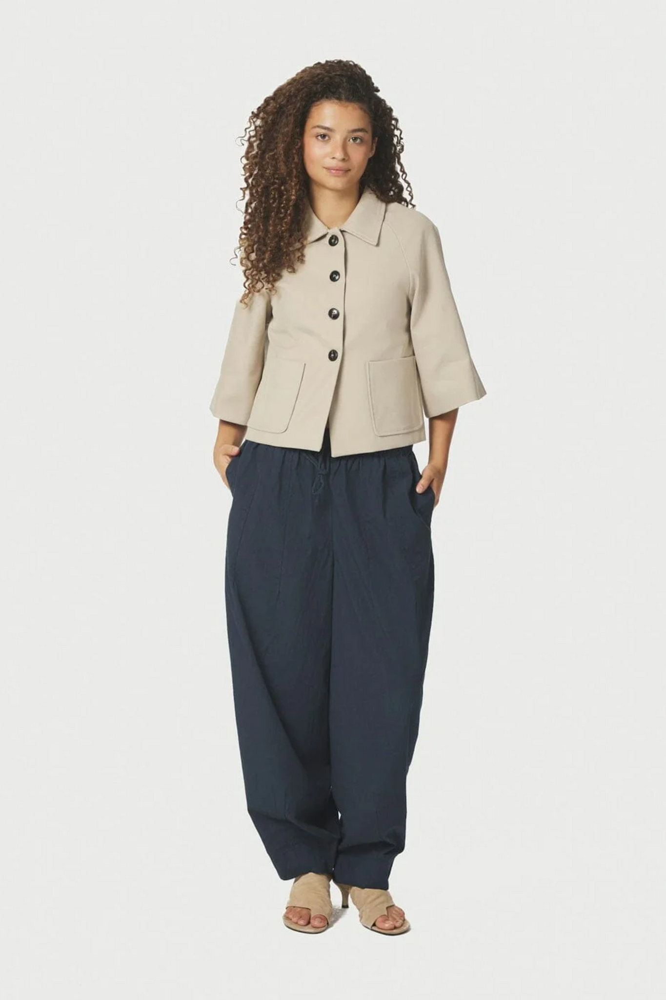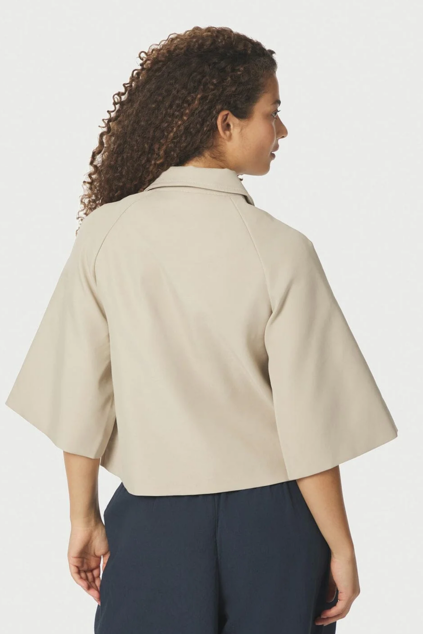 De Rosemma Trench Mini Jacket van Neo Noir in Beige is een korte jas met een blousekraag en een knoopsluiting aan de voorkant. De jas heeft 3/4 wijde, rechte mouwen en is voorzien van twee zakken op het voorpand. Het model heeft een moderne, minimalistische uitstraling en is makkelijk te combineren.