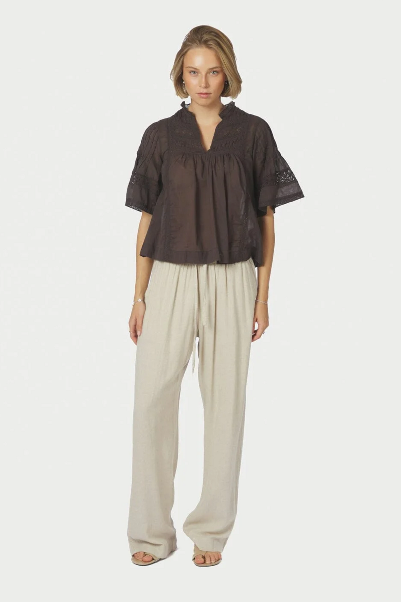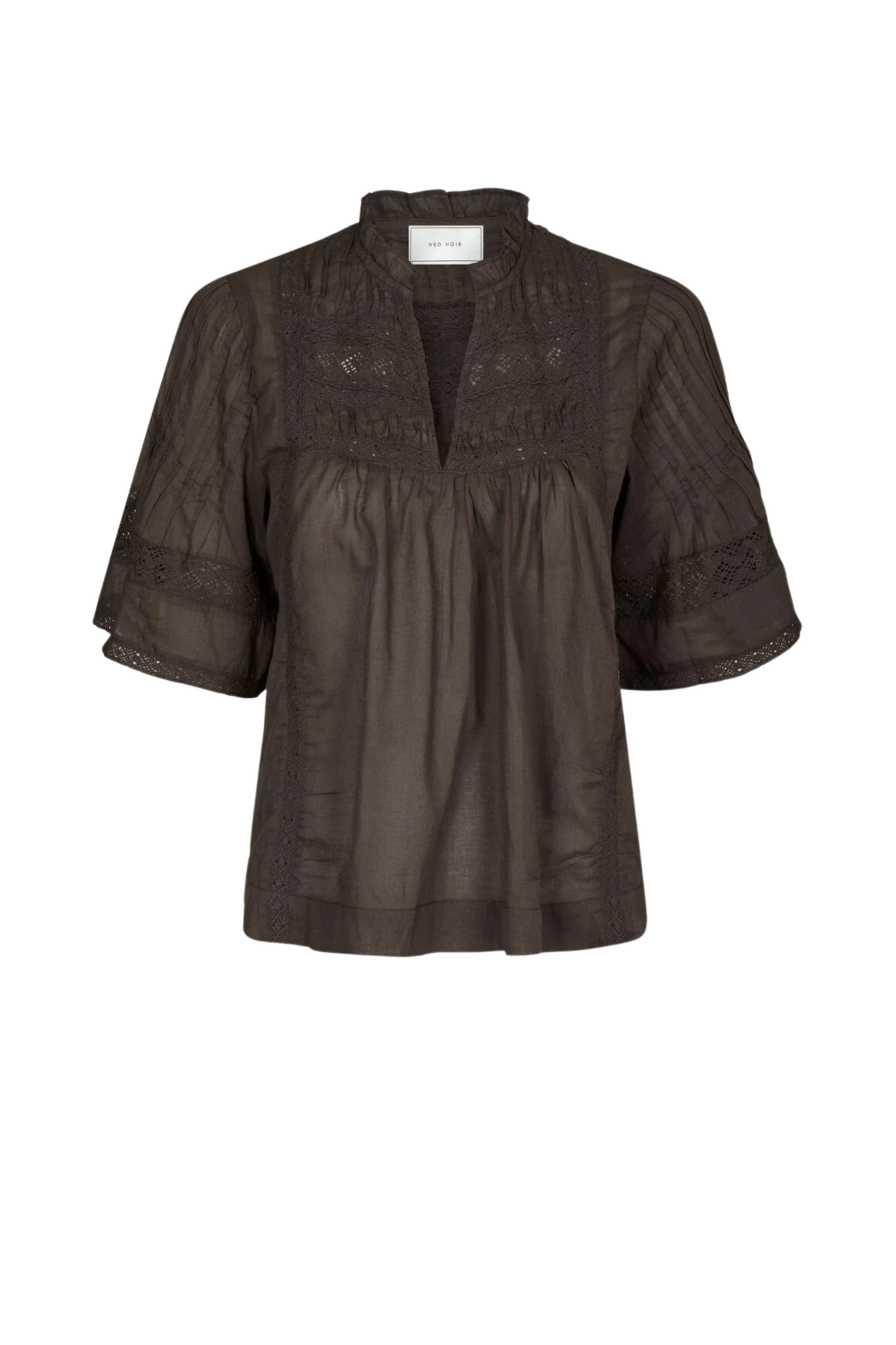 De Siama Voile Blouse van Neo Noir in Dark Brown is een luchtige blouse met een ronde hals en V-uitsnede. Het model heeft wijd uitlopende korte mouwen en is uitgevoerd met opengewerkte kanten details die zorgen voor een verfijnd effect. De soepele voile stof geeft de blouse een lichte en comfortabele pasvorm.