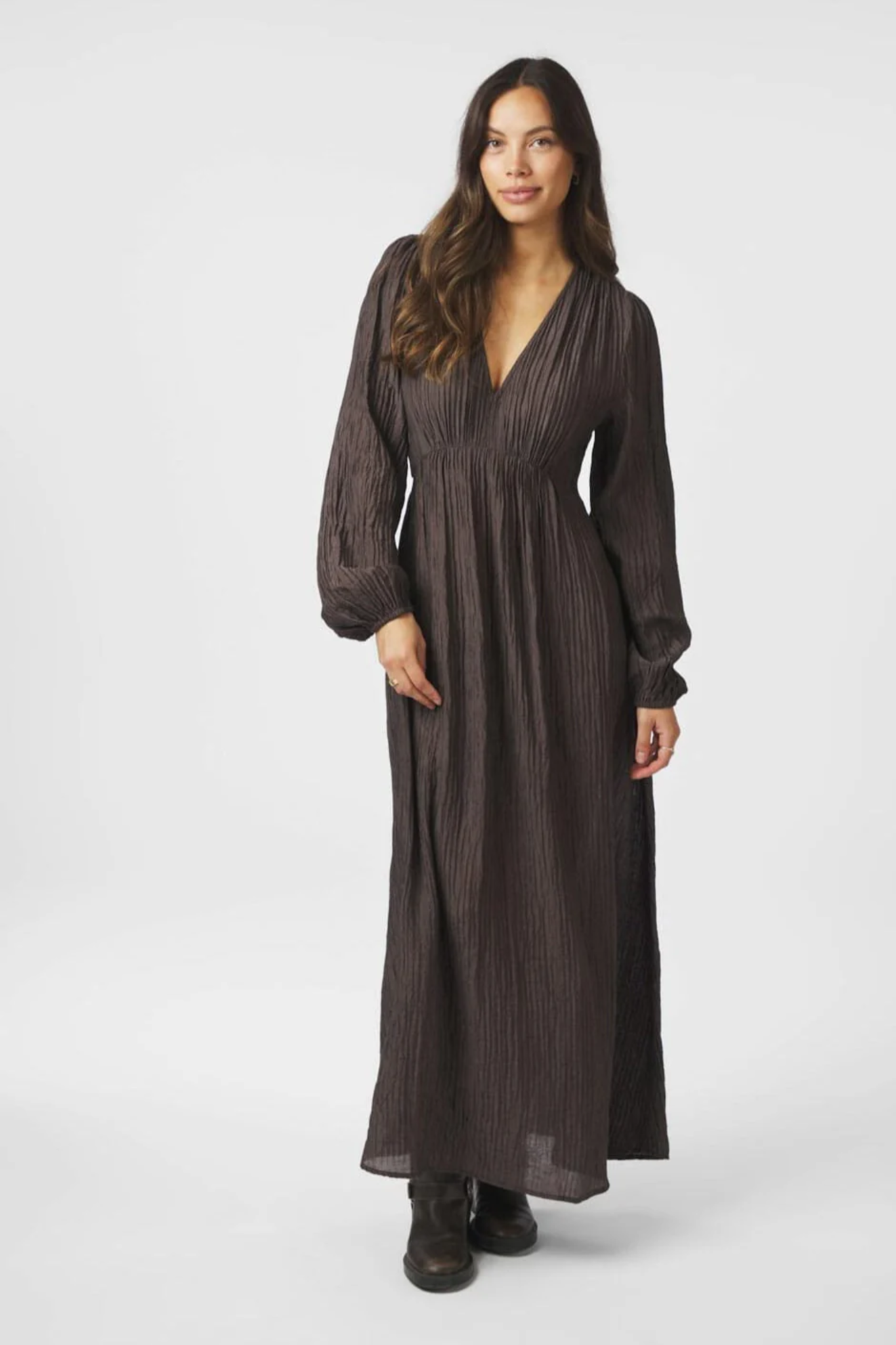 De Silfi Crepe Dress van Neo Noir is een maxi-jurk in donkerbruin. De jurk heeft een V-hals en lange pofmouwen. Dankzij de elastische taille krijgt het model een elegante en vrouwelijke vorm, ideaal voor zowel dagelijks gebruik als een speciale gelegenheid.