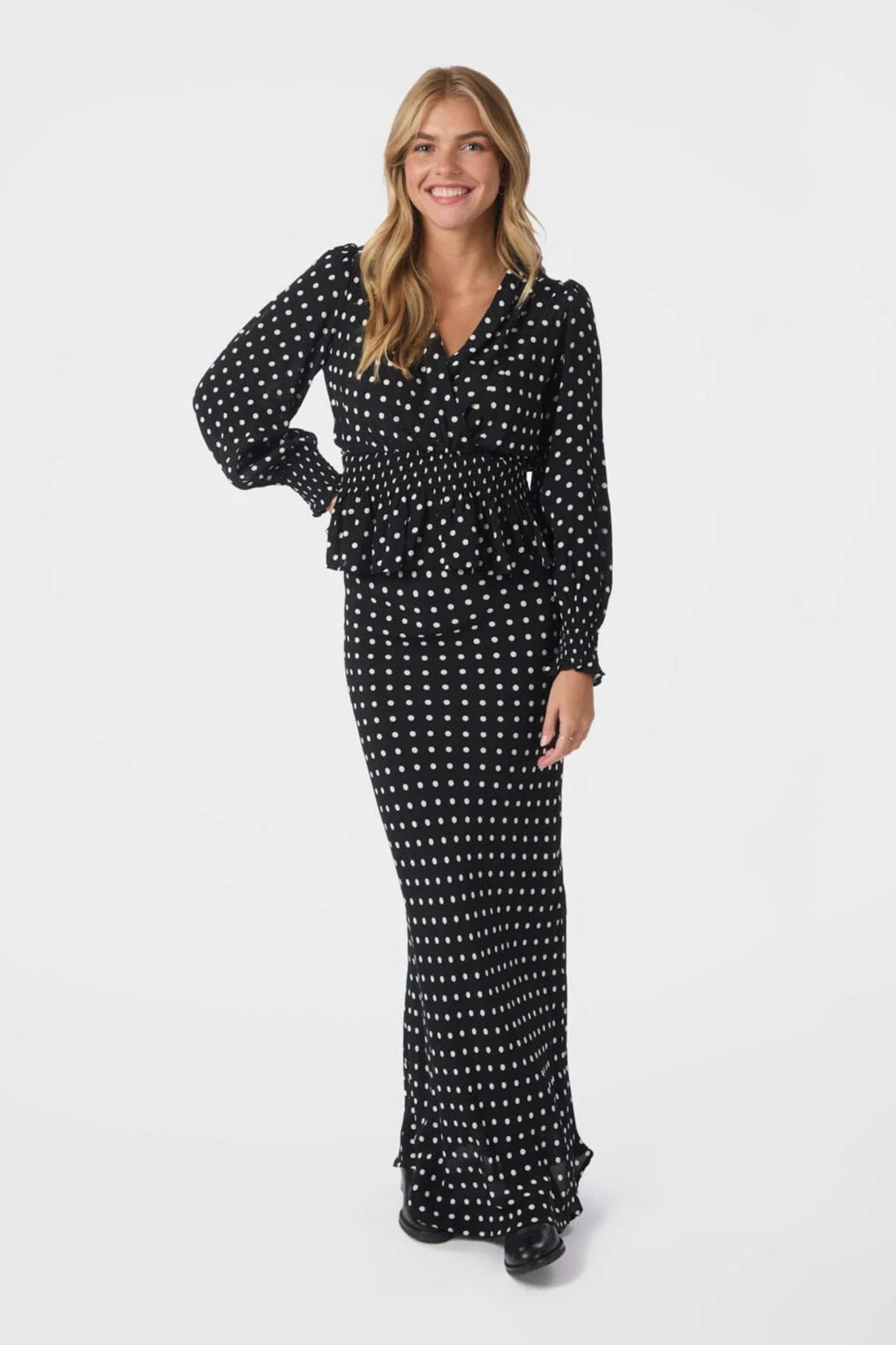 De Tamona Crepe Dot Blouse van Neo Noir is een elegante blouse in Black met een witte stippenprint. De blouse heeft een V-hals, lange pofmouwen met elastische manchetten en een elastische taille met ruches, wat zorgt voor een vrouwelijke en comfortabele pasvorm. De crêpestof valt soepel en maakt dit item perfect te combineren met de bijpassende Vicky Sateen Skirt voor een complete set.